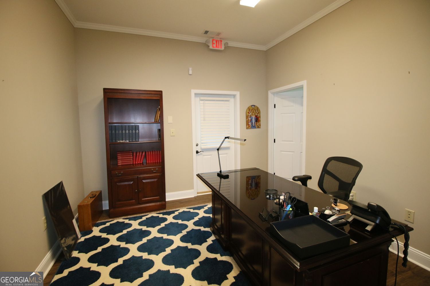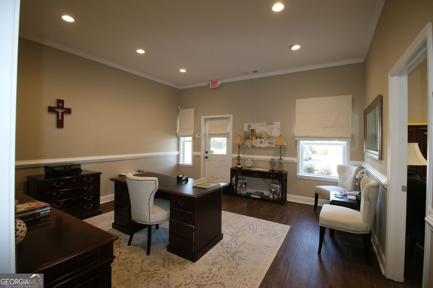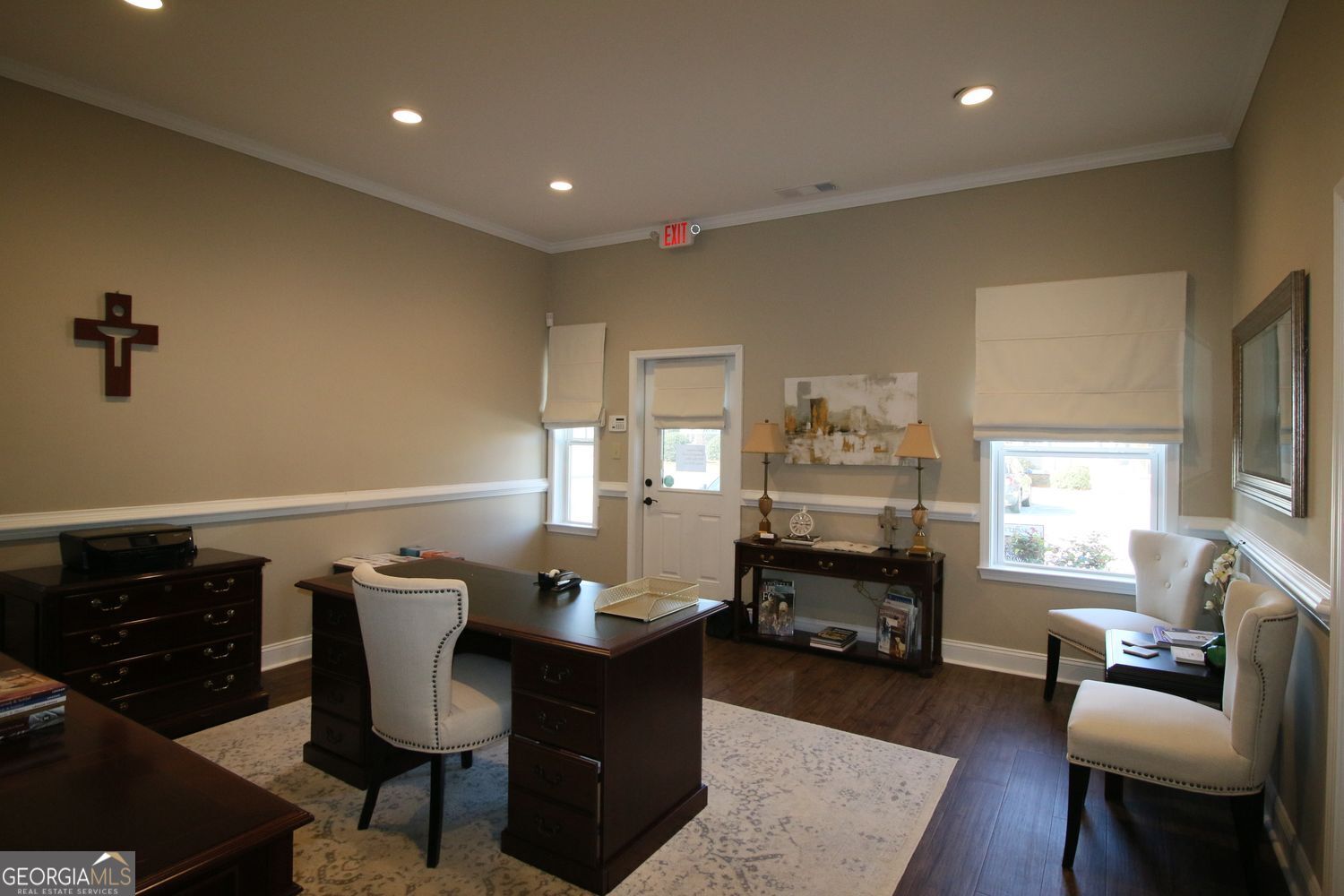 1200 sq ft of finely appointed office space, consisting of 4 large offices, nice break-room with cabinets, large bathroom, conference room, with extra large entry foyer/waiting area. One office has private entrance as needed. This was built with soundproofing between the offices for privacy when meeting with clients or employees. Easy to maintain flooring and all LED lighting. Call agent for appointment to see this space.
