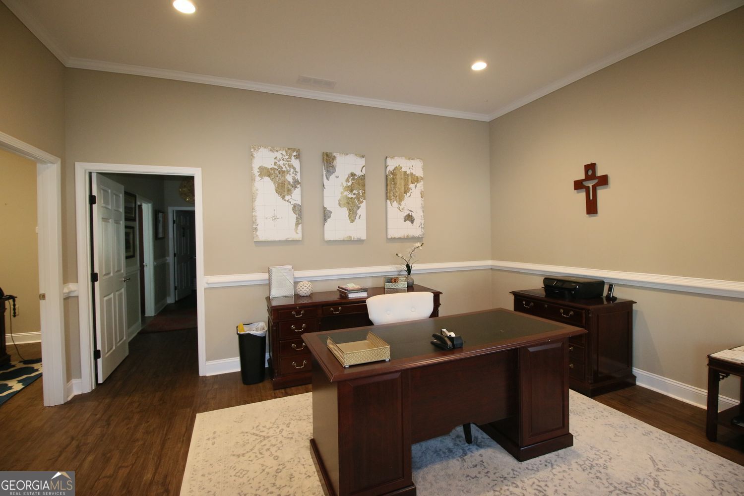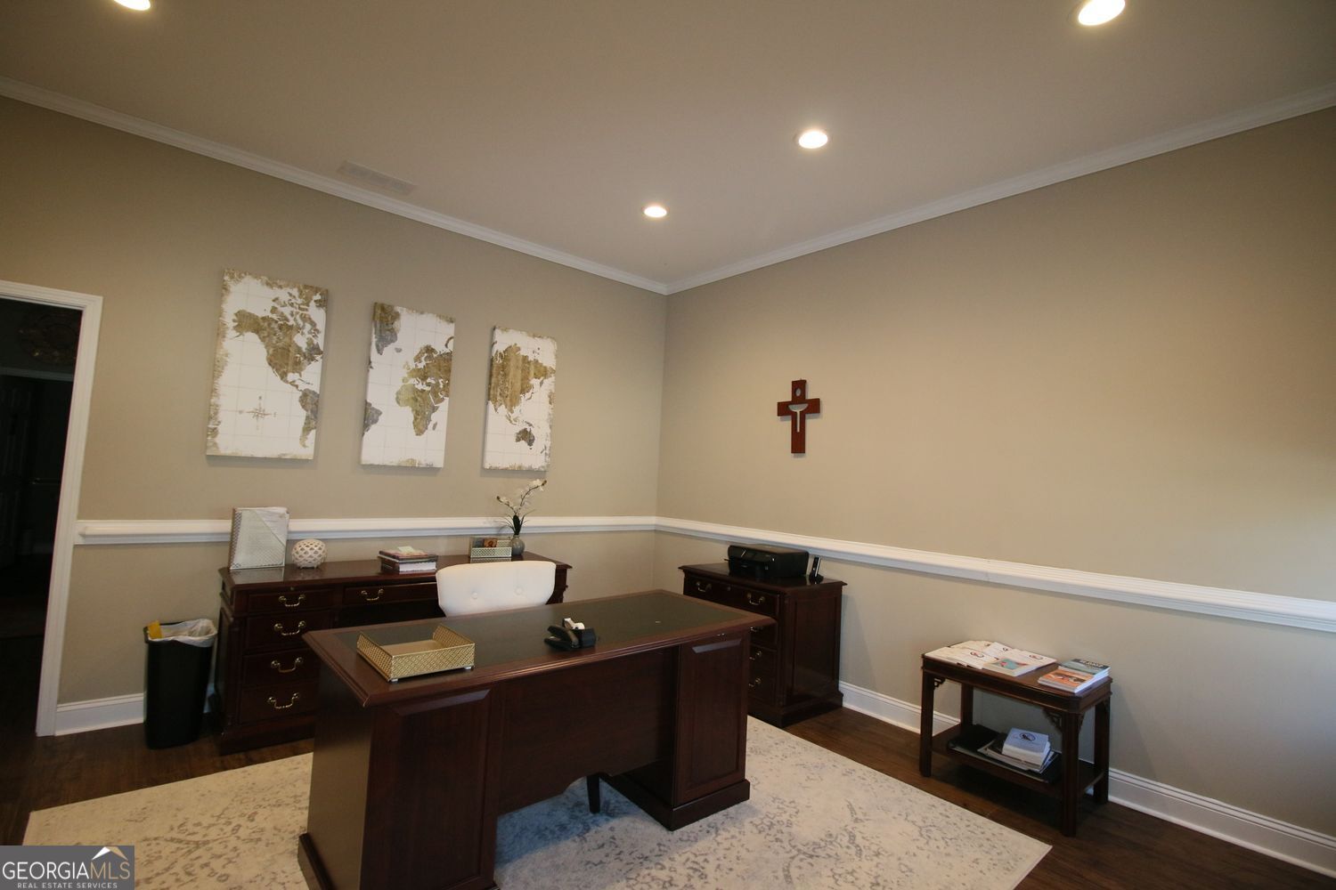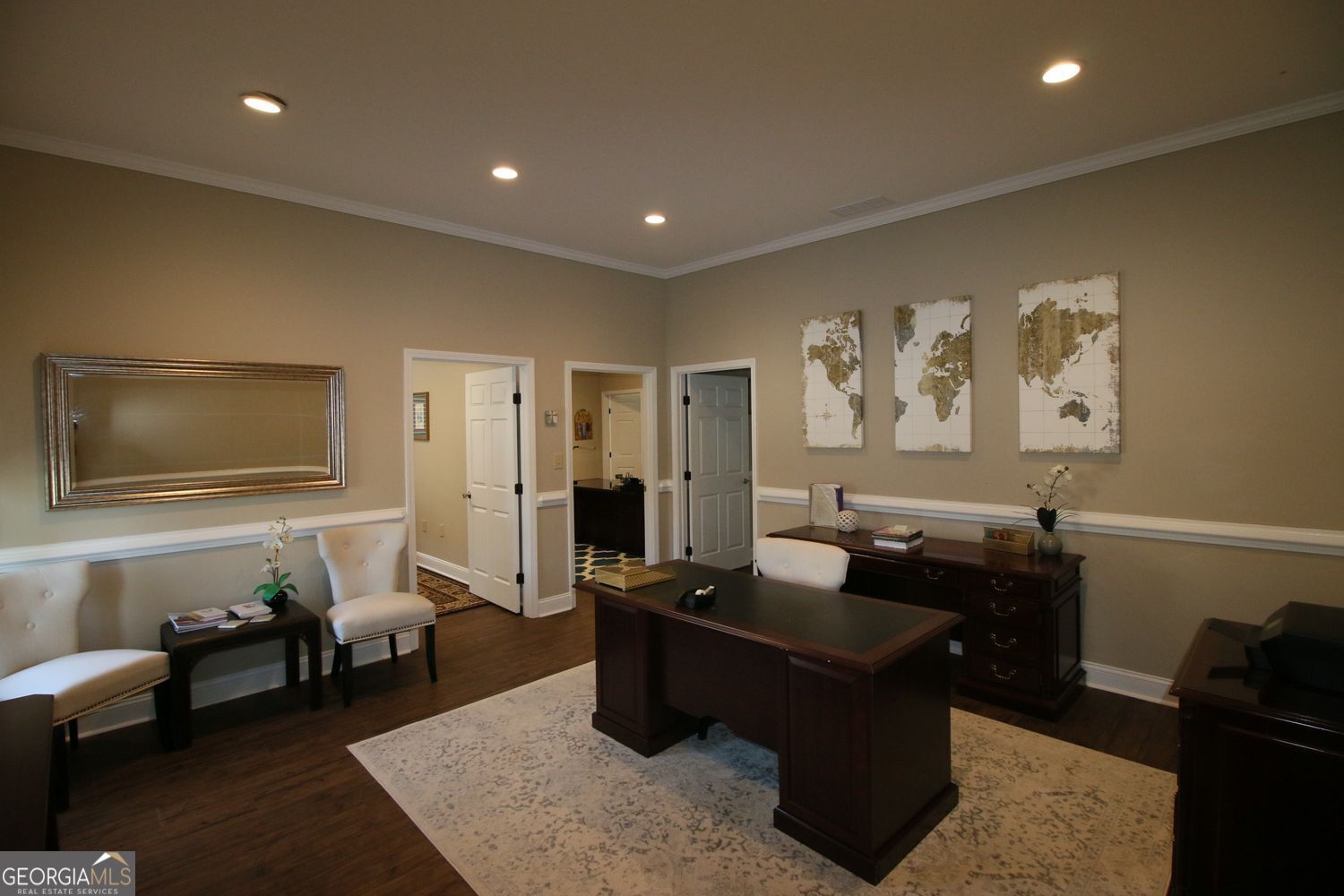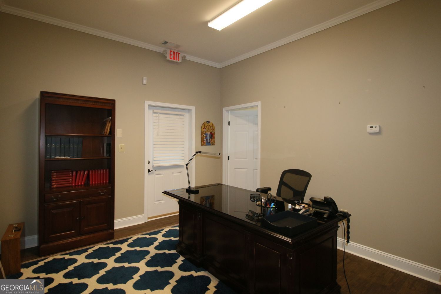 1200 sq ft of finely appointed office space, consisting of 4 large offices, nice break-room with cabinets, large bathroom, conference room, with extra large entry foyer/waiting area. One office has private entrance as needed. This was built with soundproofing between the offices for privacy when meeting with clients or employees. Easy to maintain flooring and all LED lighting. Call agent for appointment to see this space.