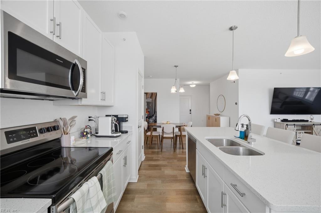 Nearly new corner condo w/ white shaker cabinets, bright kitchen w/ sparkling quartz island countertop and stainless steel appliances. The 9' ceilings and natural light pouring in from the balcony give way to a modern spacious layout. Minutes from Summit Pointe and Greenbrier, this condo blends low-maintenance living with a comfortable, inviting atmosphere.