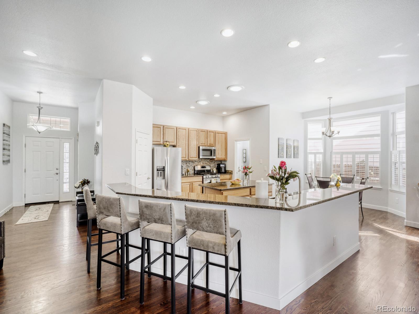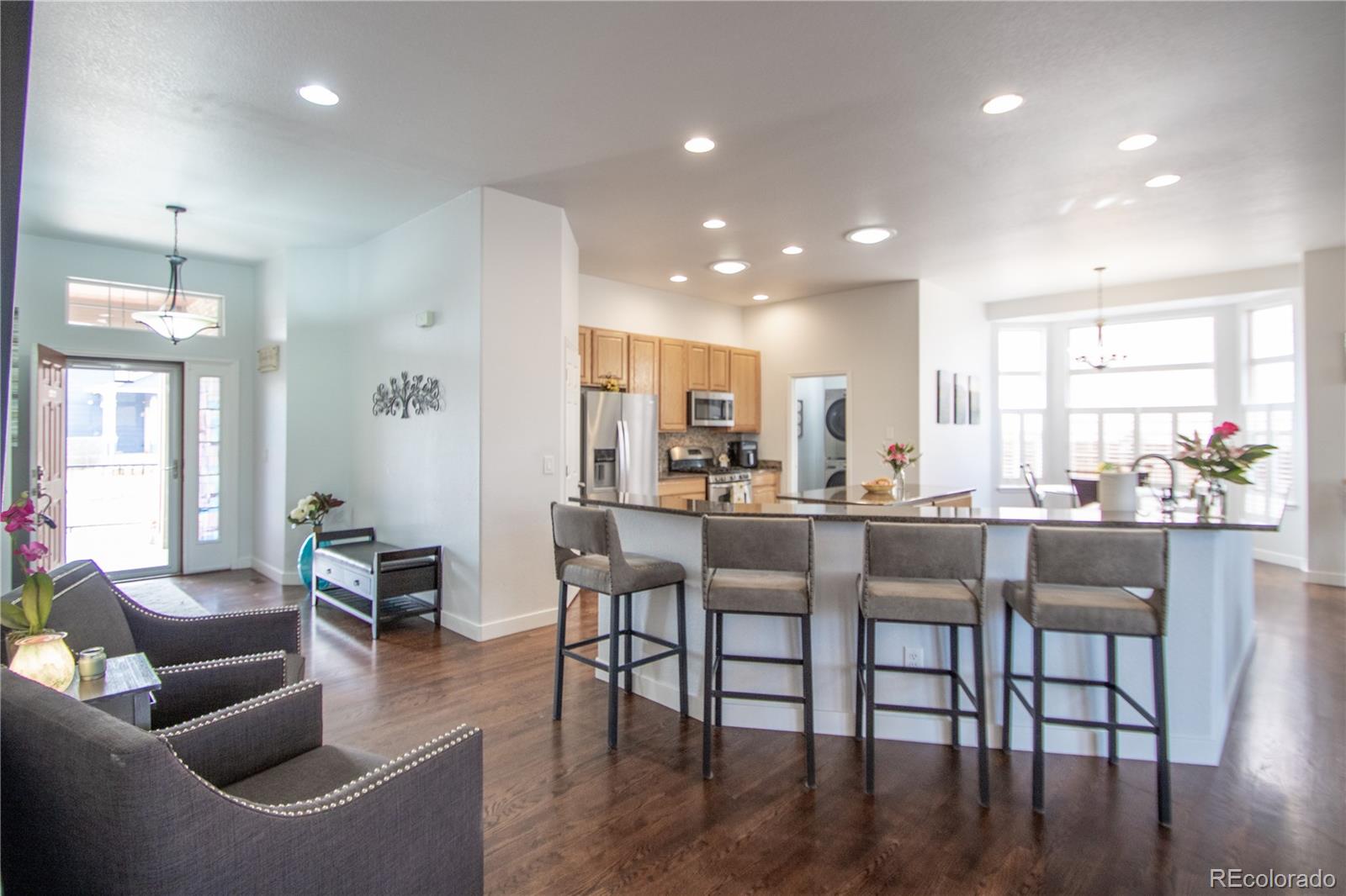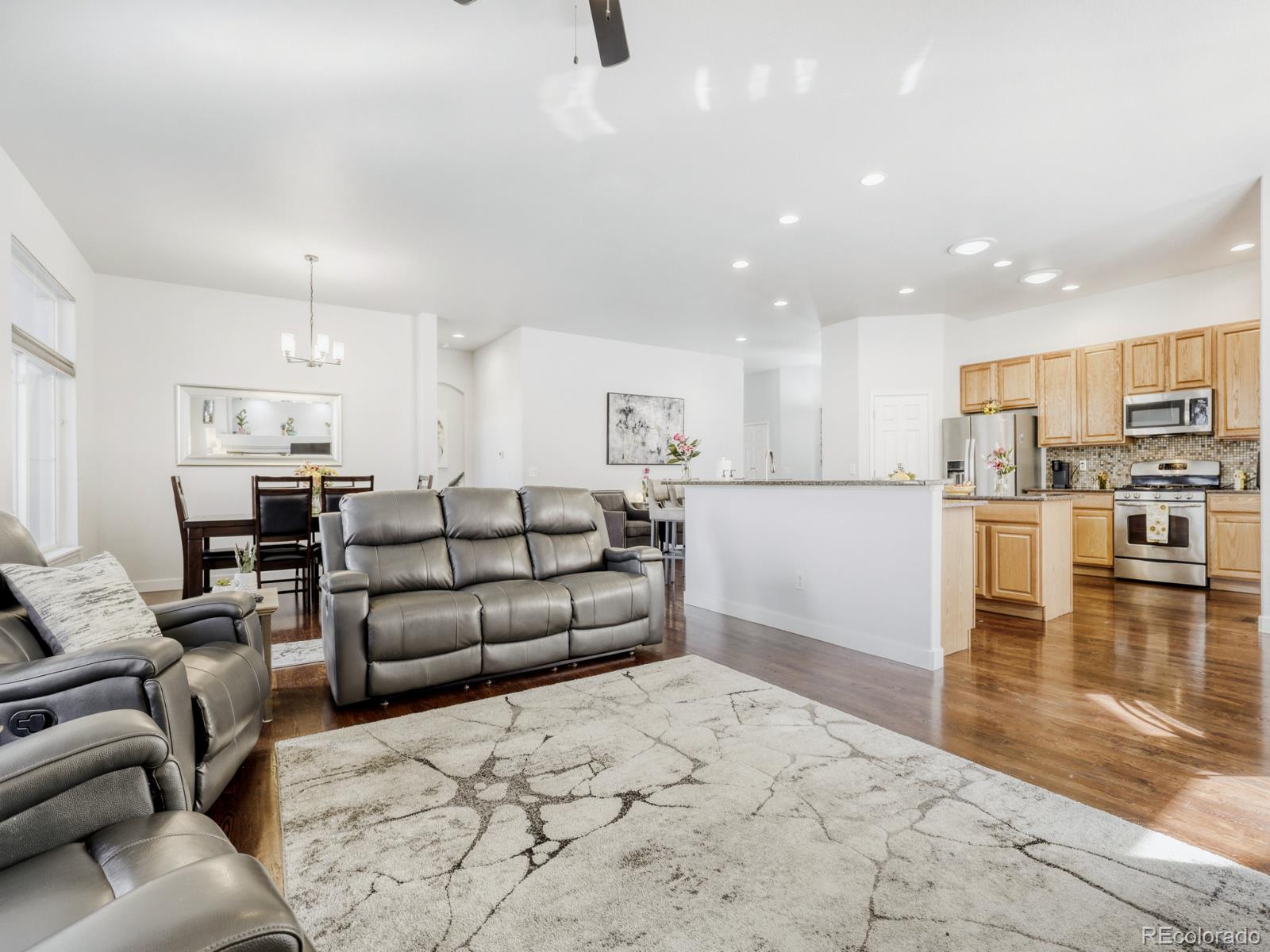 Amazing Low Maintenance Ranch in the Heart of Brighton - NO Metro Taxes! This beautifully maintained 5 bedroom, 3 bath home offers the perfect blend of comfort, space, and convenience with a light and bright, open concept floorplan designed for both everyday living and entertaining. As you enter, the spacious entry offers hardwood floors that flow through the main living areas, high ceilings, and an abundance of natural light. The open concept kitchen, dining and great room allows for a natural flow and is perfect for entertaining. The kitchen features stainless appliances, a pantry, breakfast nook, and 2 islands: one for prep, and a large wrap around island with a bar for seating. The family room features a gas fireplace, nice big windows and a door to the back patio. The primary suite is thoughtfully separated from the other bedrooms, featuring double doors, a sliding door to the 5 piece bath, and a large walk-in closet with built in's. The main level also includes a main hall bath, and 2 secondary bedrooms. One bedroom features glass French Doors, perfect for a bedroom, home office, or den - and a spacious 3rd bedroom. The laundry room is conveniently located off the kitchen and features a utility sink, countertop workspace, cabinets for additional storage, and access to the oversized 2 car garage. The finished basement expands the living space with a large family/rec room featuring a wet bar, plus 2 additional spacious bedrooms - ideal for guests, hobbies, or multi-generational living, and a large storage room. Outdoors, you will find a welcoming front porch/patio area and landscaped front yard, while the low-maintenance backyard features a beautiful two-level stamped concrete patio, perfect for relaxing or entertaining. Additional features and upgrades include newer basement carpet, newer water heater, humidifier, radon mitigation system, water softener, and reverse osmosis system. Located near schools, rec areas, shopping, E-470, Hwy 7, Hwy 85 and I-76.
