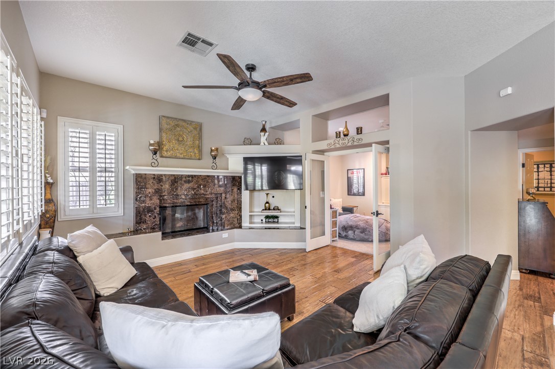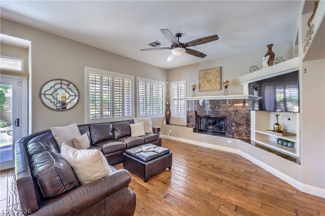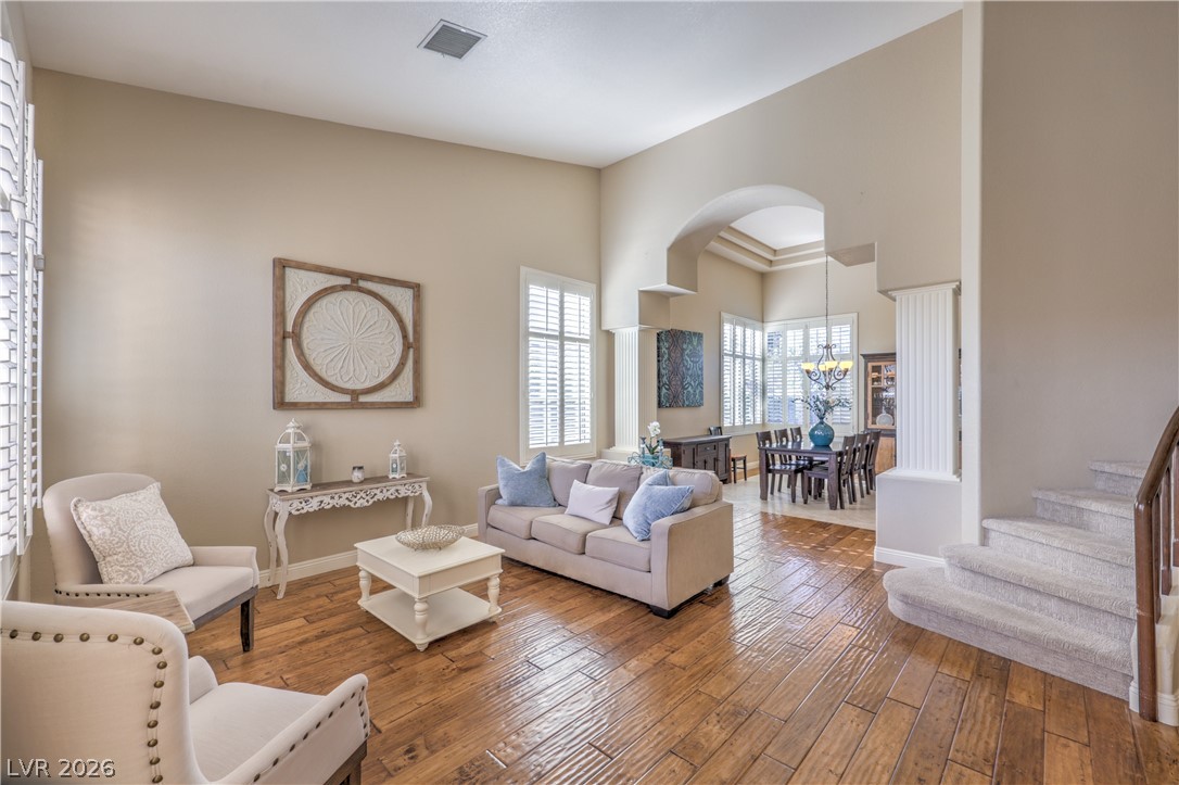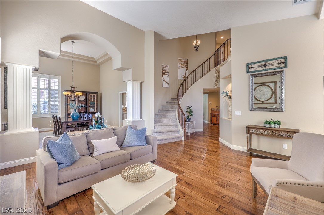 Absolutely stunning Summerlin home on a pristine corner lot. Lovingly remodeled and immaculately maintained, this four bedroom, three bath plus den pool home features lush landscaping, a flagstone entry, and all the bells and whistles. Be greeted by soaring ceilings and a dramatic curved staircase as you enter this beautiful property, with hand-scraped hardwood floors throughout the downstairs, a custom kitchen with new extended island, and a cozy den which could be converted to a fifth bedroom. New carpet leads you upstairs where there is a grand primary suite featuring dual closets and a newly remodeled spa like bath. Three additional bedrooms, including one with enormous storage closet, and another remodeled bath complete the second floor. Outside is a tropical oasis with separately fenced pool (with diving board!) and spa, and a gorgeous outdoor kitchen. On the side of the home is a large yard with plenty of room to play. Truly a one of a kind property ~ Welcome home!