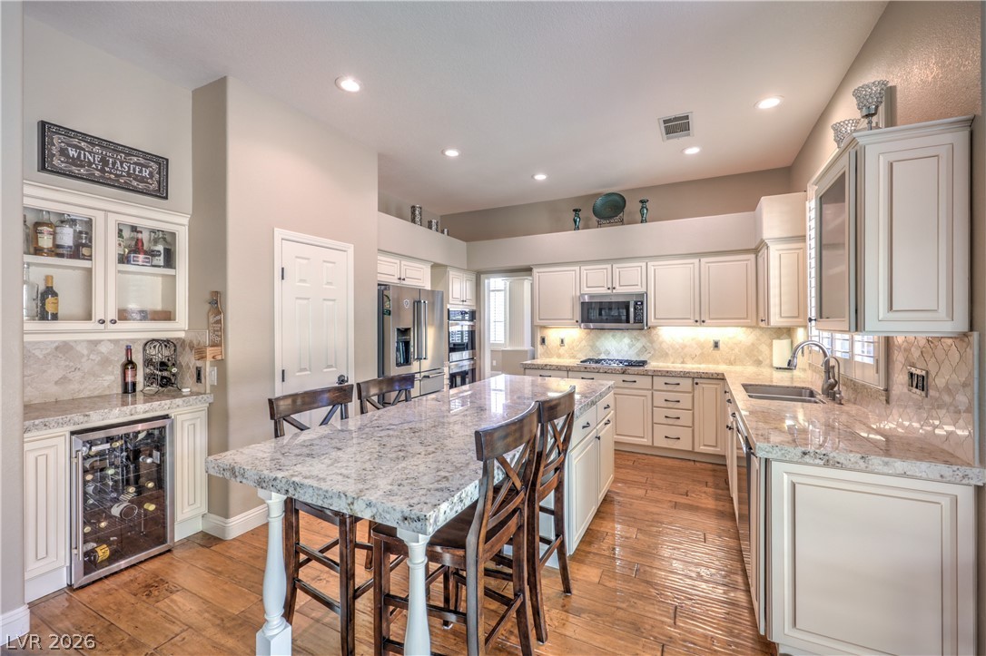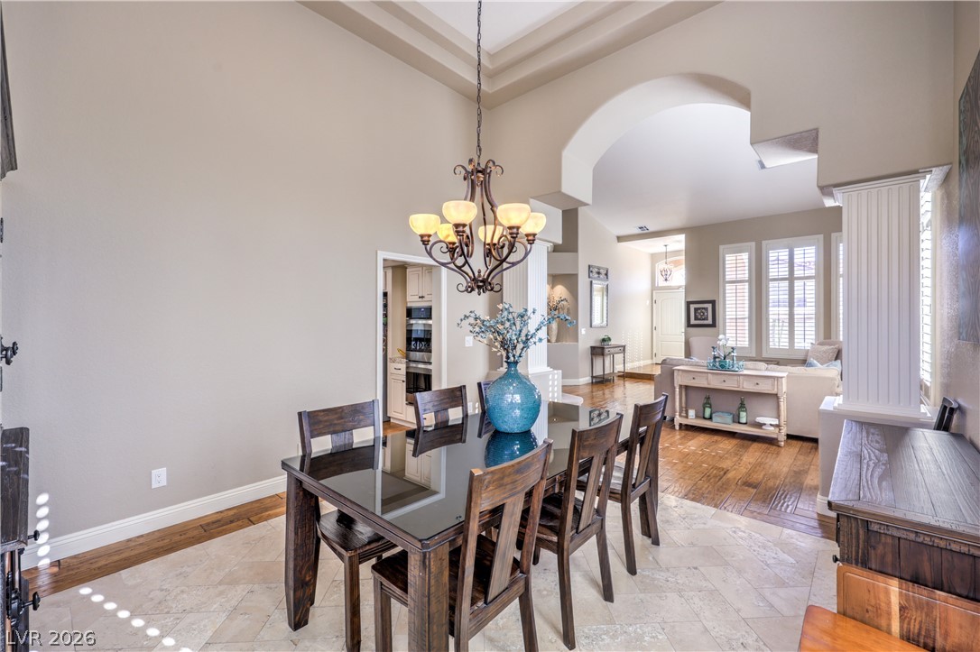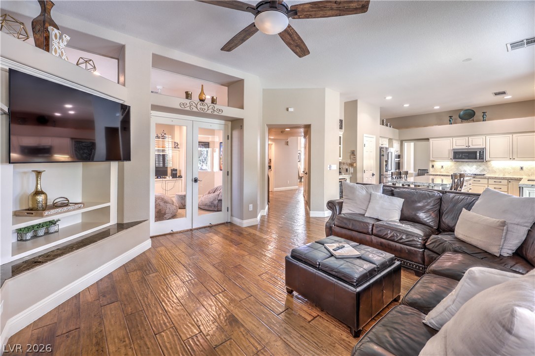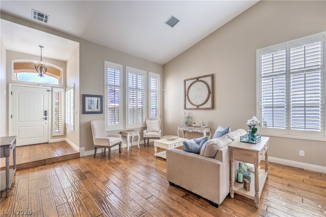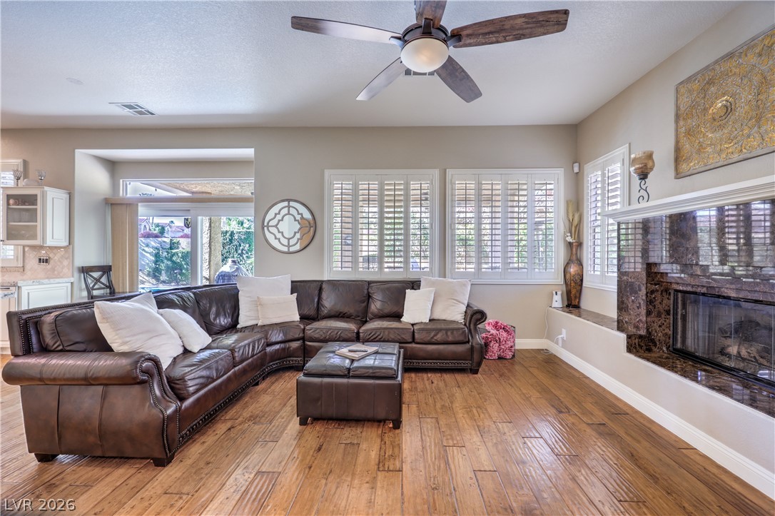 Absolutely stunning Summerlin home on a pristine corner lot. Lovingly remodeled and immaculately maintained, this four bedroom, three bath plus den pool home features lush landscaping, a flagstone entry, and all the bells and whistles. Be greeted by soaring ceilings and a dramatic curved staircase as you enter this beautiful property, with hand-scraped hardwood floors throughout the downstairs, a custom kitchen with new extended island, and a cozy den which could be converted to a fifth bedroom. New carpet leads you upstairs where there is a grand primary suite featuring dual closets and a newly remodeled spa like bath. Three additional bedrooms, including one with enormous storage closet, and another remodeled bath complete the second floor. Outside is a tropical oasis with separately fenced pool (with diving board!) and spa, and a gorgeous outdoor kitchen. On the side of the home is a large yard with plenty of room to play. Truly a one of a kind property ~ Welcome home!