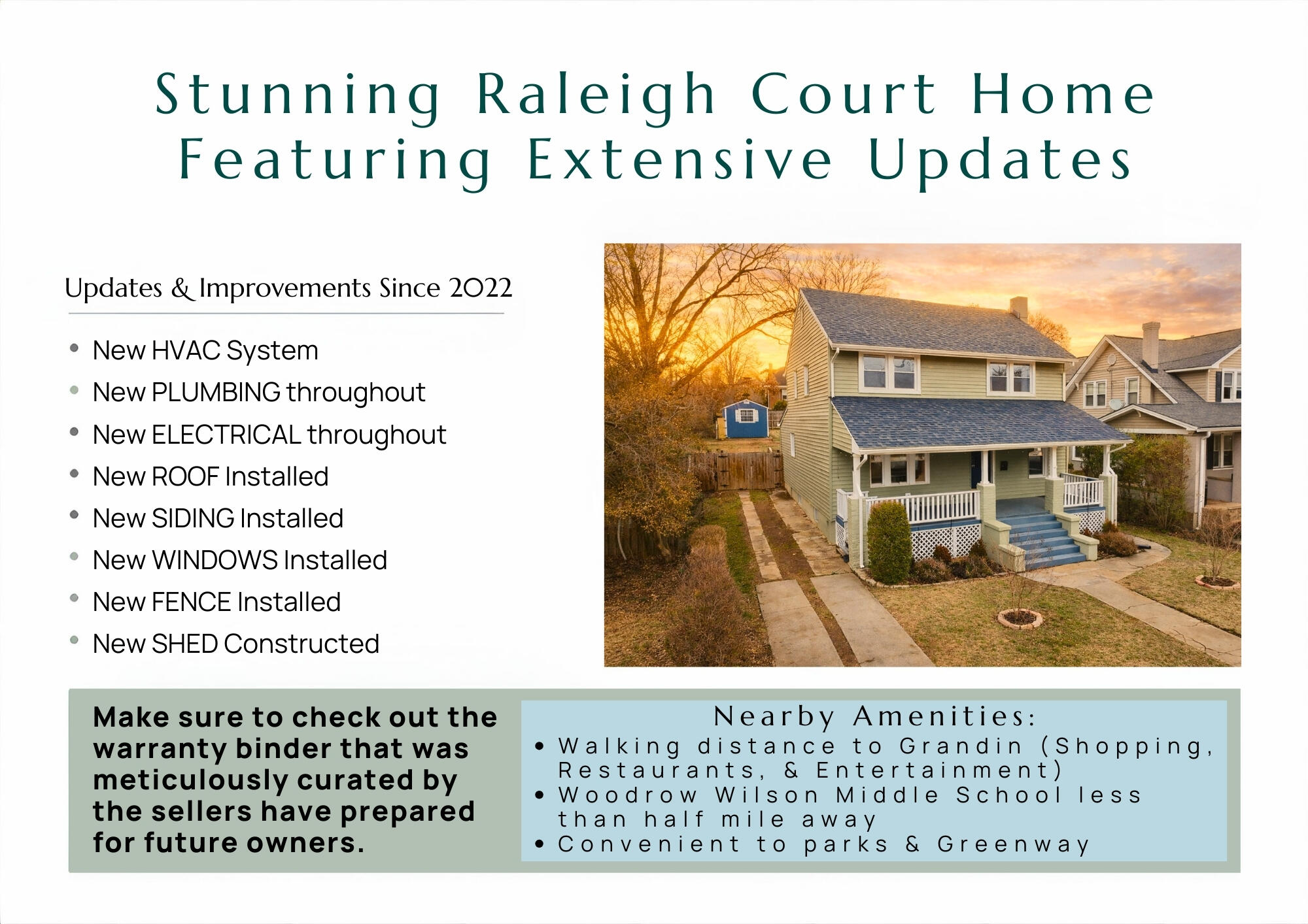 This Raleigh Court charmer is sure to please! Just a short walk to Grandin Village, this completely renovated home blends classic charm with modern peace of mind. It has been completely remodeled within the past five years, major updates include new plumbing, electrical, HVAC, roof, siding, and windows. Recent additions include a new fence, shed, trees, and gardening space. The home boasts a private and functional backyard retreat that is perfect for pets and entertaining. Don't miss this rare opportunity to own a fully updated home in one of Roanoke's most sought-after neighborhoods. Schedule your showing today!