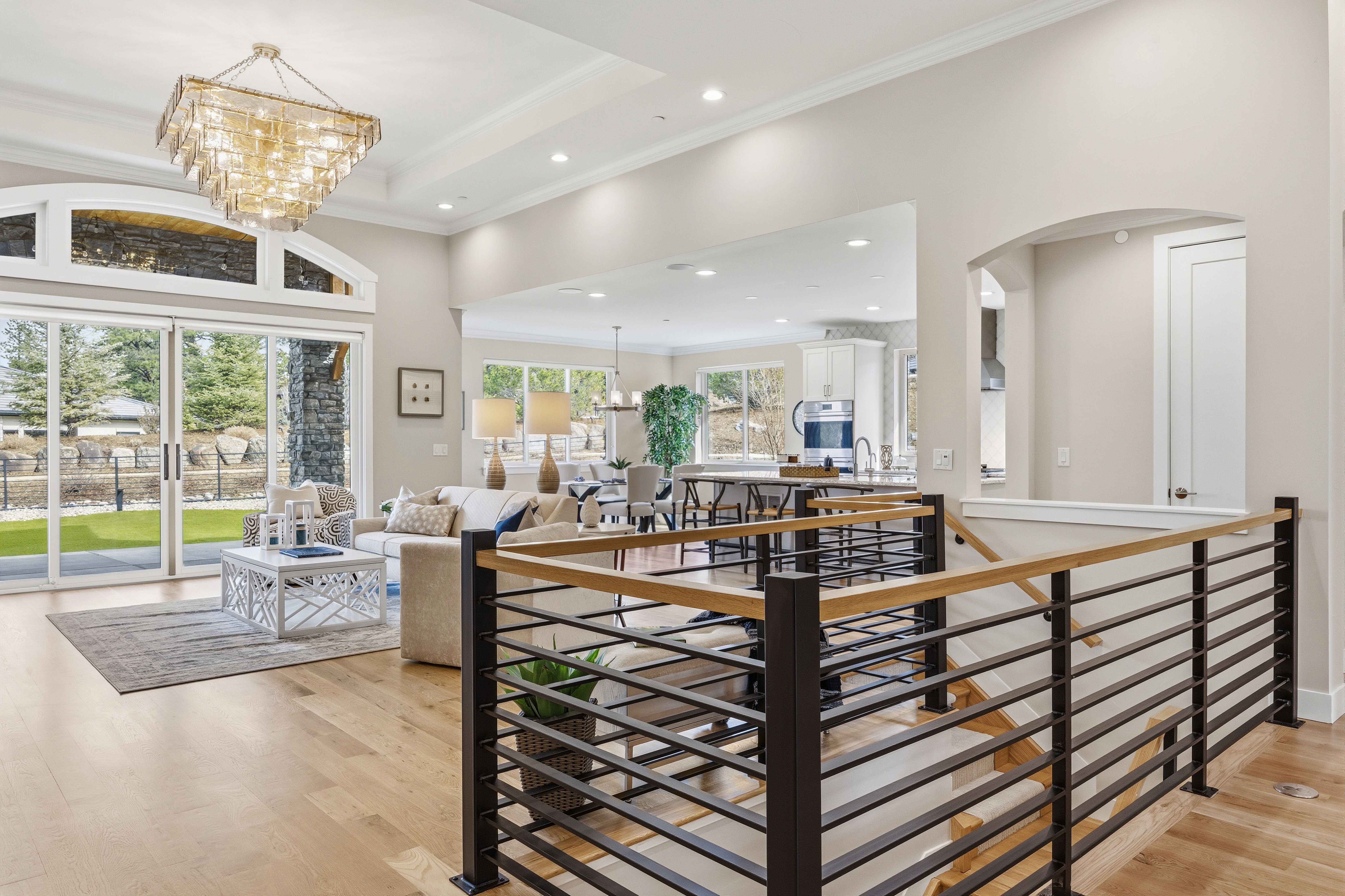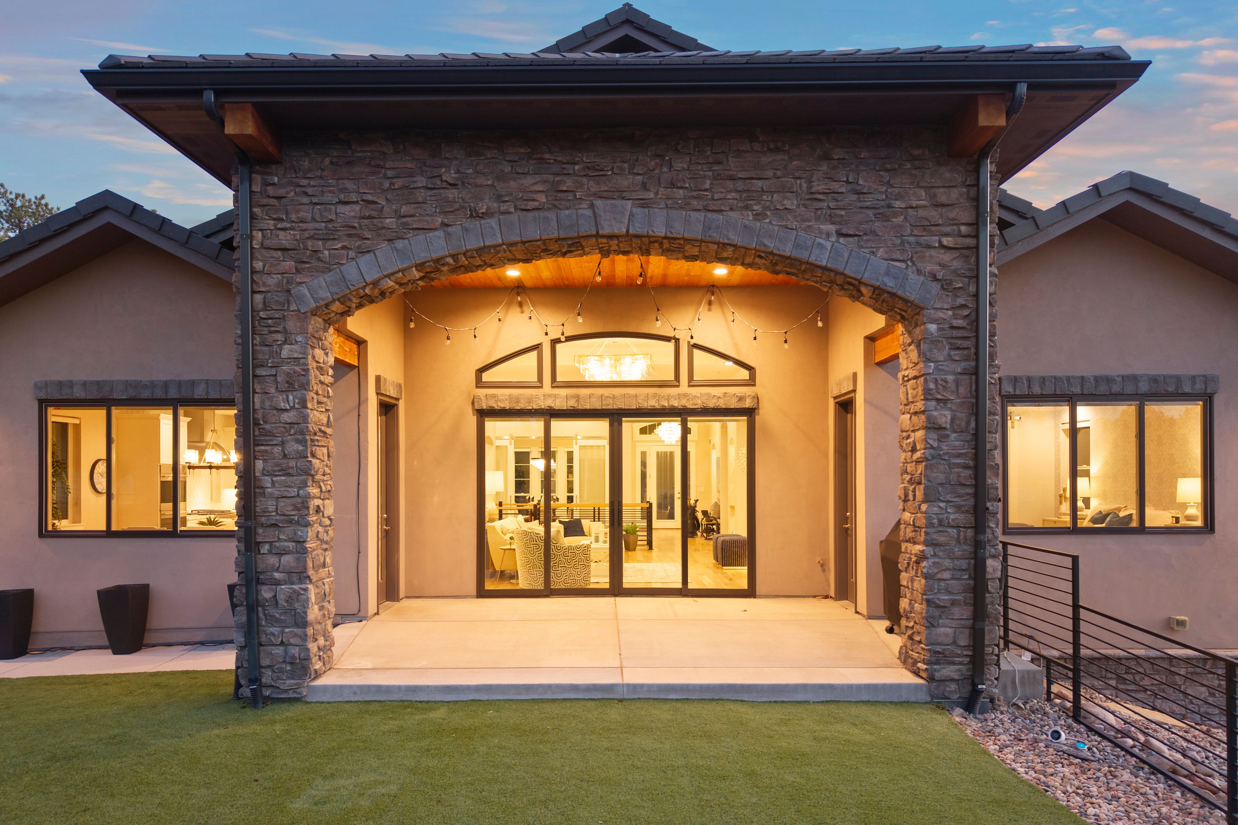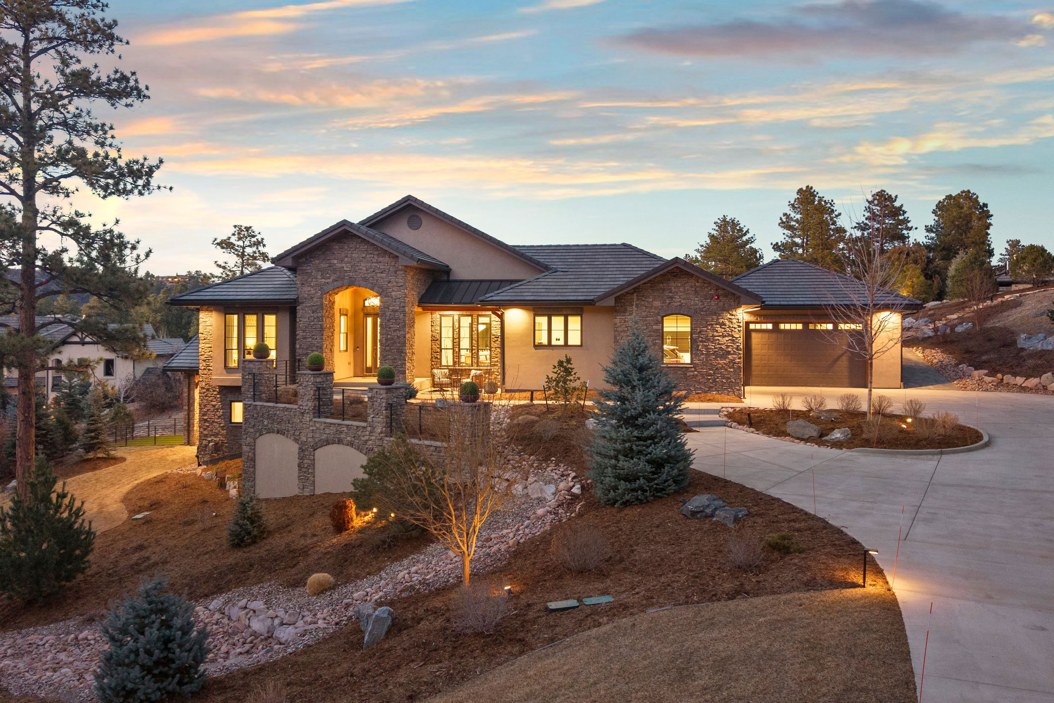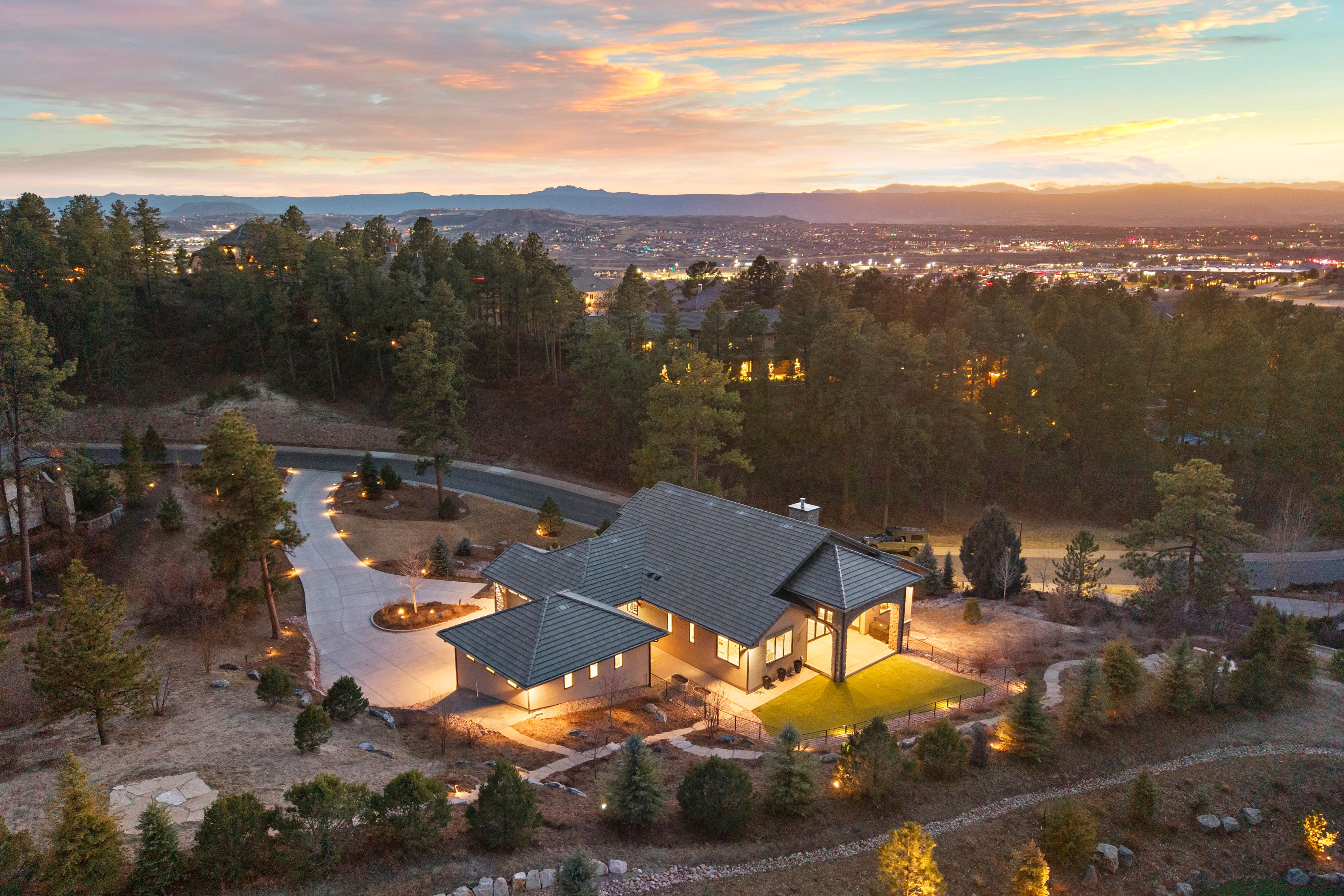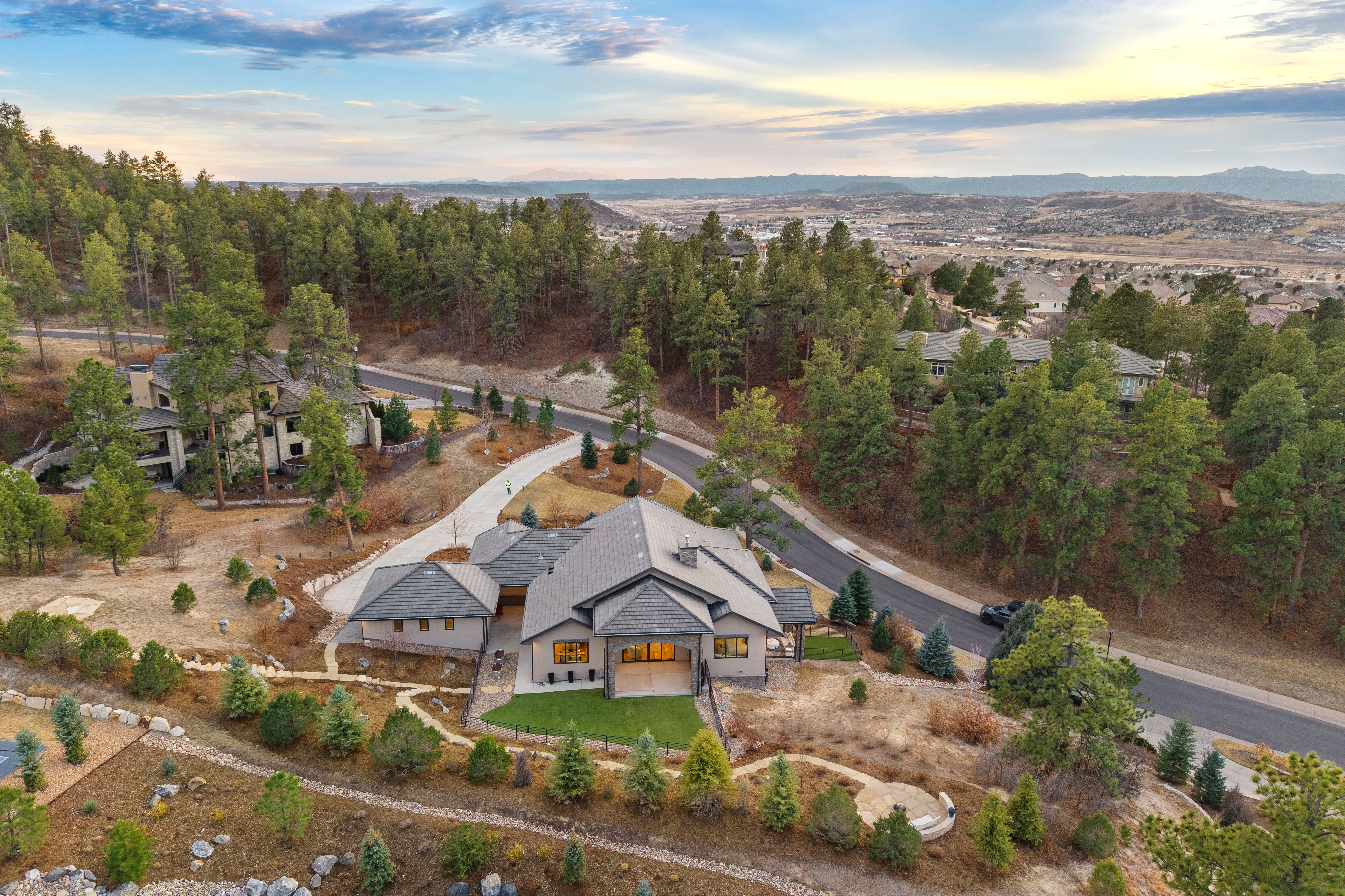 A spectacular setting among towering pines creates a private, secluded retreat. This newer construction is exceptional! A Castle Rock luxury home featuring main-level living with warm architectural beauty and designer finishes at every turn. A quiet neighborhood and distant mountains frame the backyard. Sliding glass doors open to the yard with no steps, accessing an outdoor haven with over $100,000 in curated, lush landscaping and no-maintenance high-quality turf lawn. A state-of-the-art golf simulator, oversized four-car garage with storage, and exceptionally low HOA dues and taxes make this one of the most compelling luxury values in town. A sweeping drive, lined with landscaping and lighting, leads to a dramatic stacked stone arched front porch. Inside, the home is like new. Rooms feel fresh, sunny and comfortable, with soaring ceilings ranging from nine to thirteen feet spanning the open main level. The great room features an arched tile fireplace wall, a stunning tiered gold and glass chandelier, and sliding glass doors opening to a covered patio framed by stone columns and warm wood beams. The kitchen is inviting with quartzite countertops, arabesque glass tile backsplash, and a full suite of Sub-Zero®, Wolf®, and Dacor® appliances. The spacious main-level primary suite offers a spa-inspired ensuite with doorless walk-in shower, barrel ceiling, and two walk-in closets with extensive built-in systems. A second main-level bedroom includes a private bath. Stylish wallpaper accent walls give each room its own distinct personality, adding artistry that carries throughout the home. The walk-out lower level is built for unwinding, featuring a recreation room with TV and surround sound that opens to a covered tongue-and-groove patio with a fully enclosed turf yard, perfect for pets. The included Uneekor® golf simulator, complete with cameras, sensors, projector, and full-wall impact screen, is a true hole-in-one for golf enthusiasts. Outside, flagstone pathways wind through mature pines to two terraced patios with fire pit potential and panoramic views stretching from city lights to the mountains. Minutes from dining, shopping, and everyday amenities with quick I-25 access for an effortless commute to Denver or Colorado Springs. A must-see home in one of Castle Rock's most sought-after luxury communities.