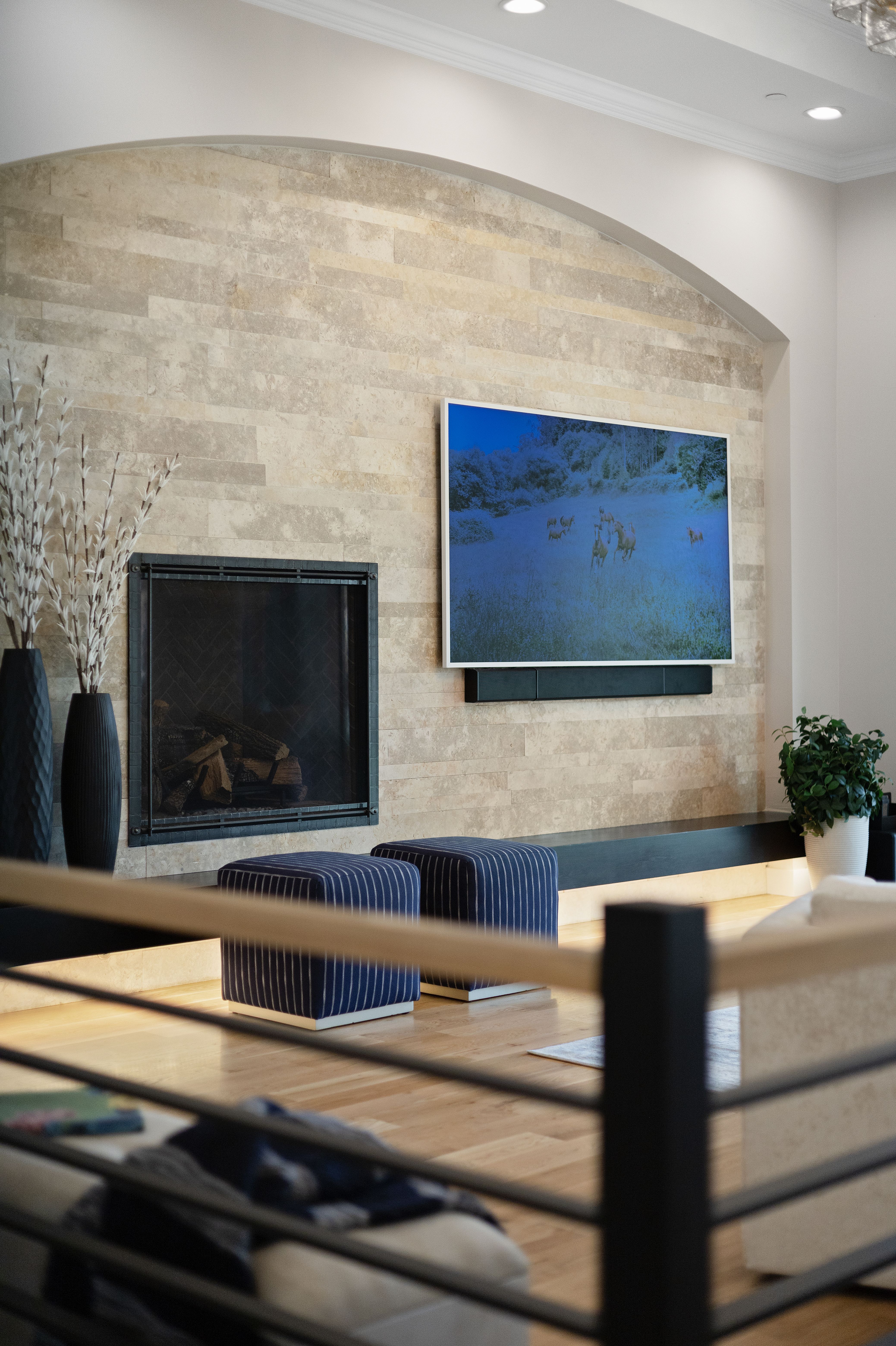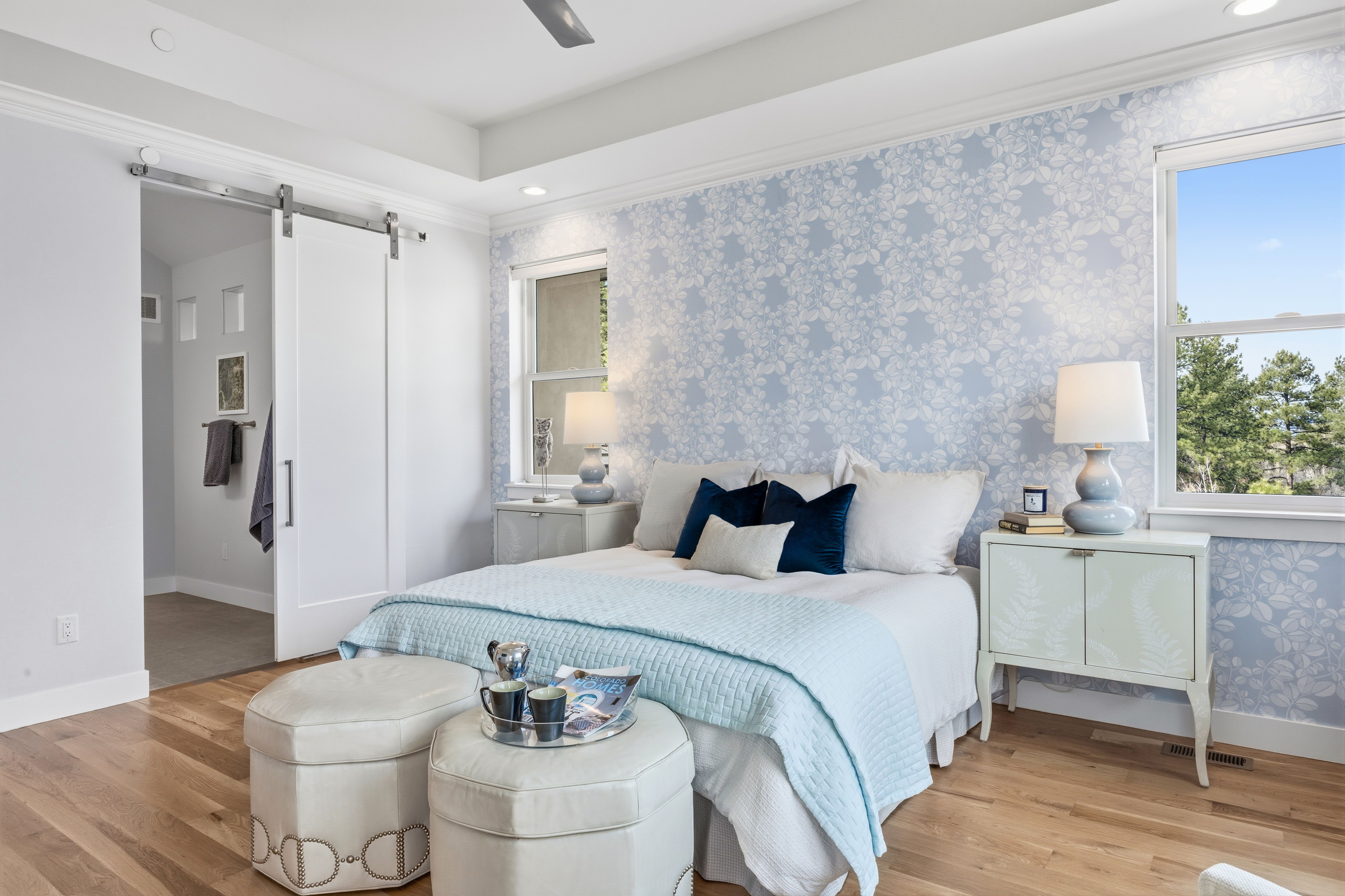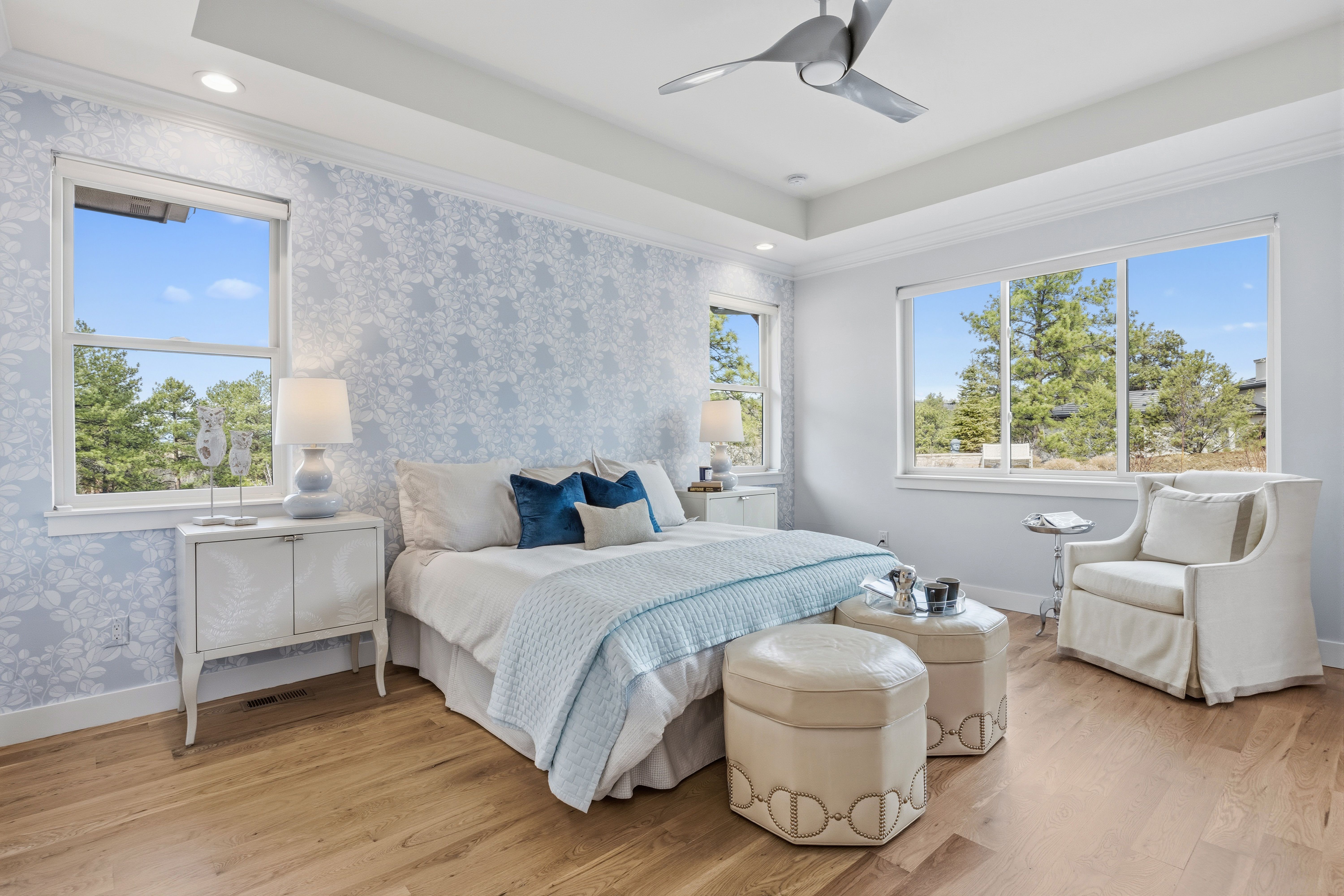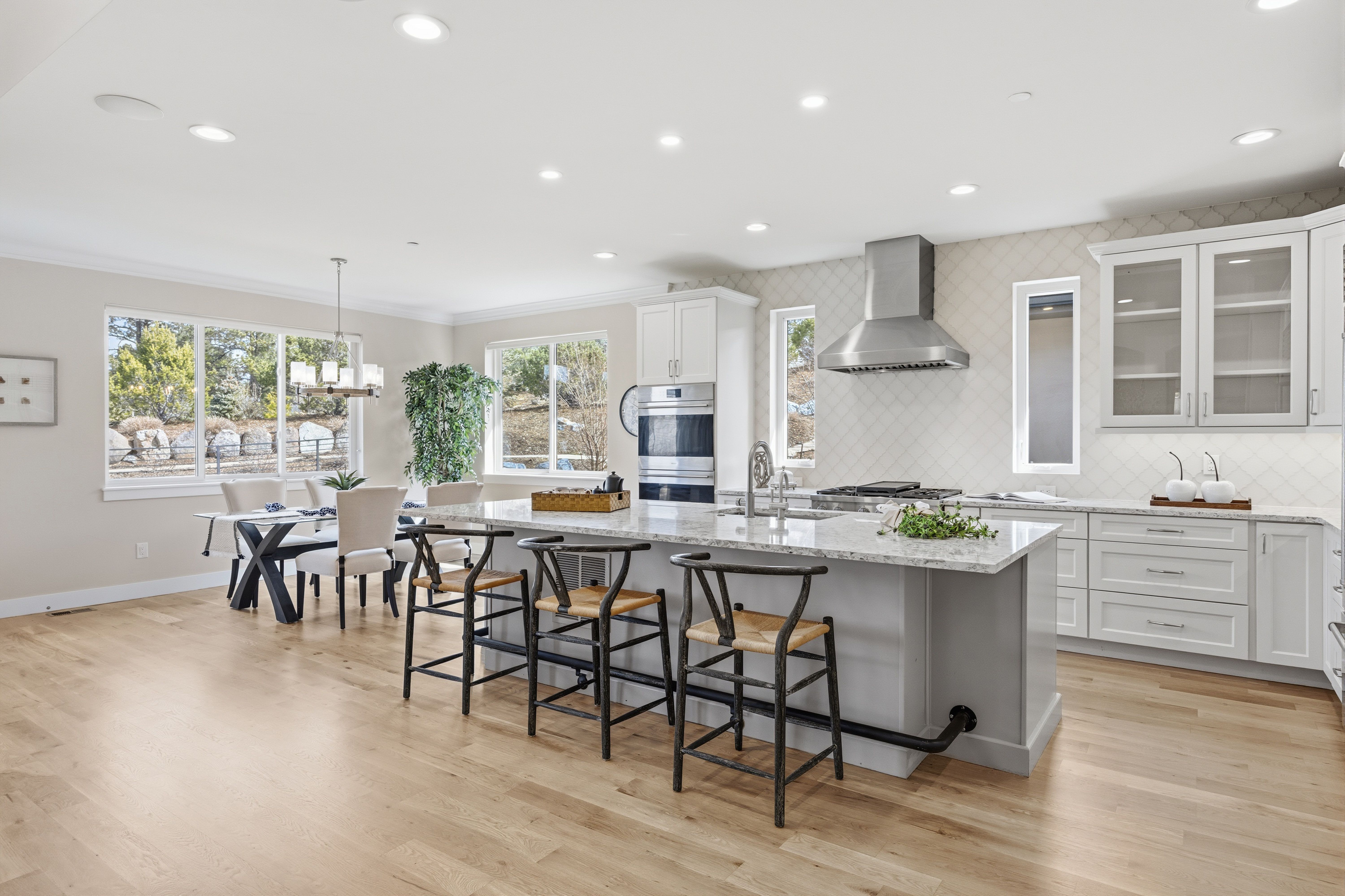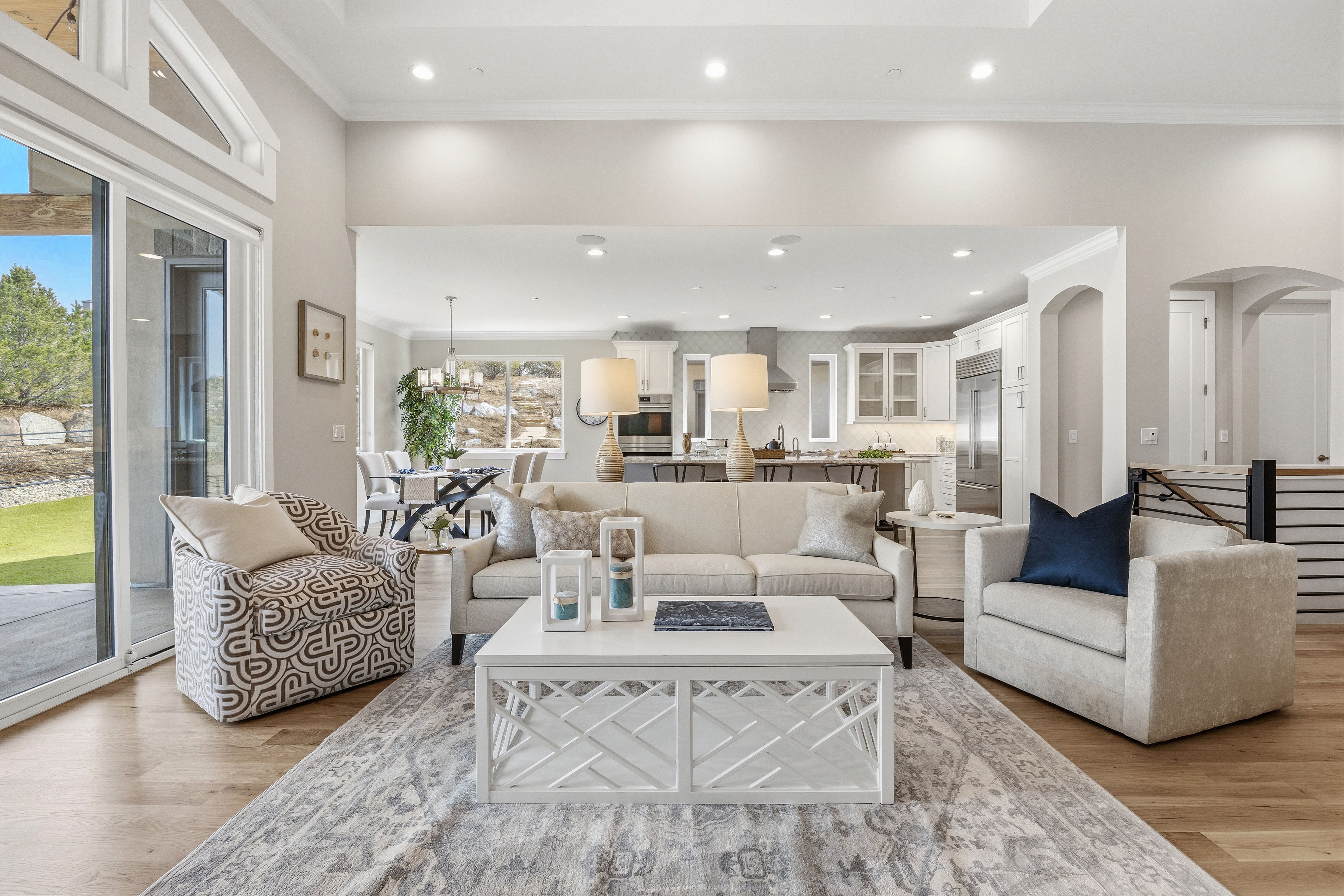 A spectacular setting among towering pines creates a private, secluded retreat. This newer construction is exceptional! A Castle Rock luxury home featuring main-level living with warm architectural beauty and designer finishes at every turn. A quiet neighborhood and distant mountains frame the backyard. Sliding glass doors open to the yard with no steps, accessing an outdoor haven with over $100,000 in curated, lush landscaping and no-maintenance high-quality turf lawn. A state-of-the-art golf simulator, oversized four-car garage with storage, and exceptionally low HOA dues and taxes make this one of the most compelling luxury values in town. A sweeping drive, lined with landscaping and lighting, leads to a dramatic stacked stone arched front porch. Inside, the home is like new. Rooms feel fresh, sunny and comfortable, with soaring ceilings ranging from nine to thirteen feet spanning the open main level. The great room features an arched tile fireplace wall, a stunning tiered gold and glass chandelier, and sliding glass doors opening to a covered patio framed by stone columns and warm wood beams. The kitchen is inviting with quartzite countertops, arabesque glass tile backsplash, and a full suite of Sub-Zero®, Wolf®, and Dacor® appliances. The spacious main-level primary suite offers a spa-inspired ensuite with doorless walk-in shower, barrel ceiling, and two walk-in closets with extensive built-in systems. A second main-level bedroom includes a private bath. Stylish wallpaper accent walls give each room its own distinct personality, adding artistry that carries throughout the home. The walk-out lower level is built for unwinding, featuring a recreation room with TV and surround sound that opens to a covered tongue-and-groove patio with a fully enclosed turf yard, perfect for pets. The included Uneekor® golf simulator, complete with cameras, sensors, projector, and full-wall impact screen, is a true hole-in-one for golf enthusiasts. Outside, flagstone pathways wind through mature pines to two terraced patios with fire pit potential and panoramic views stretching from city lights to the mountains. Minutes from dining, shopping, and everyday amenities with quick I-25 access for an effortless commute to Denver or Colorado Springs. A must-see home in one of Castle Rock's most sought-after luxury communities.