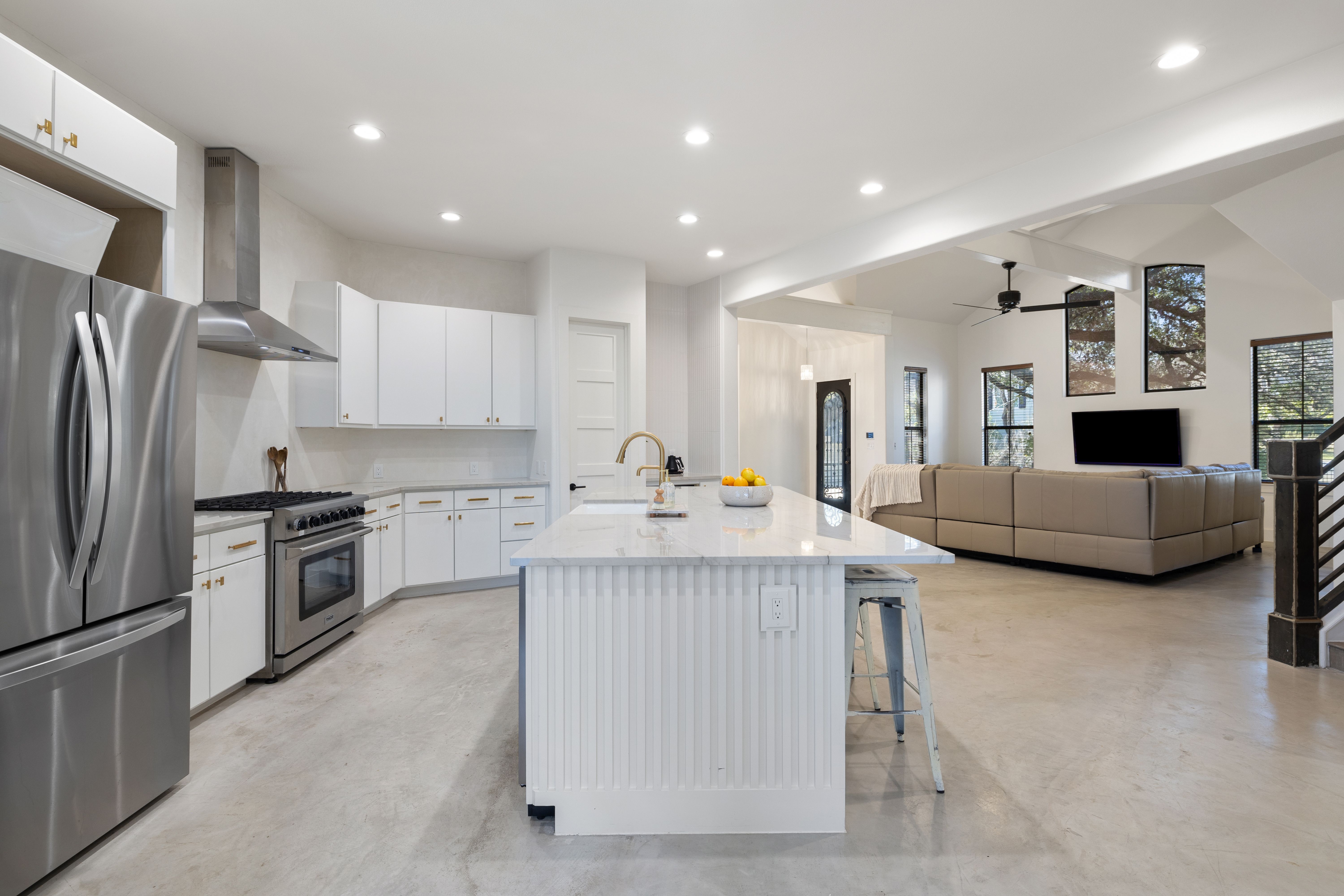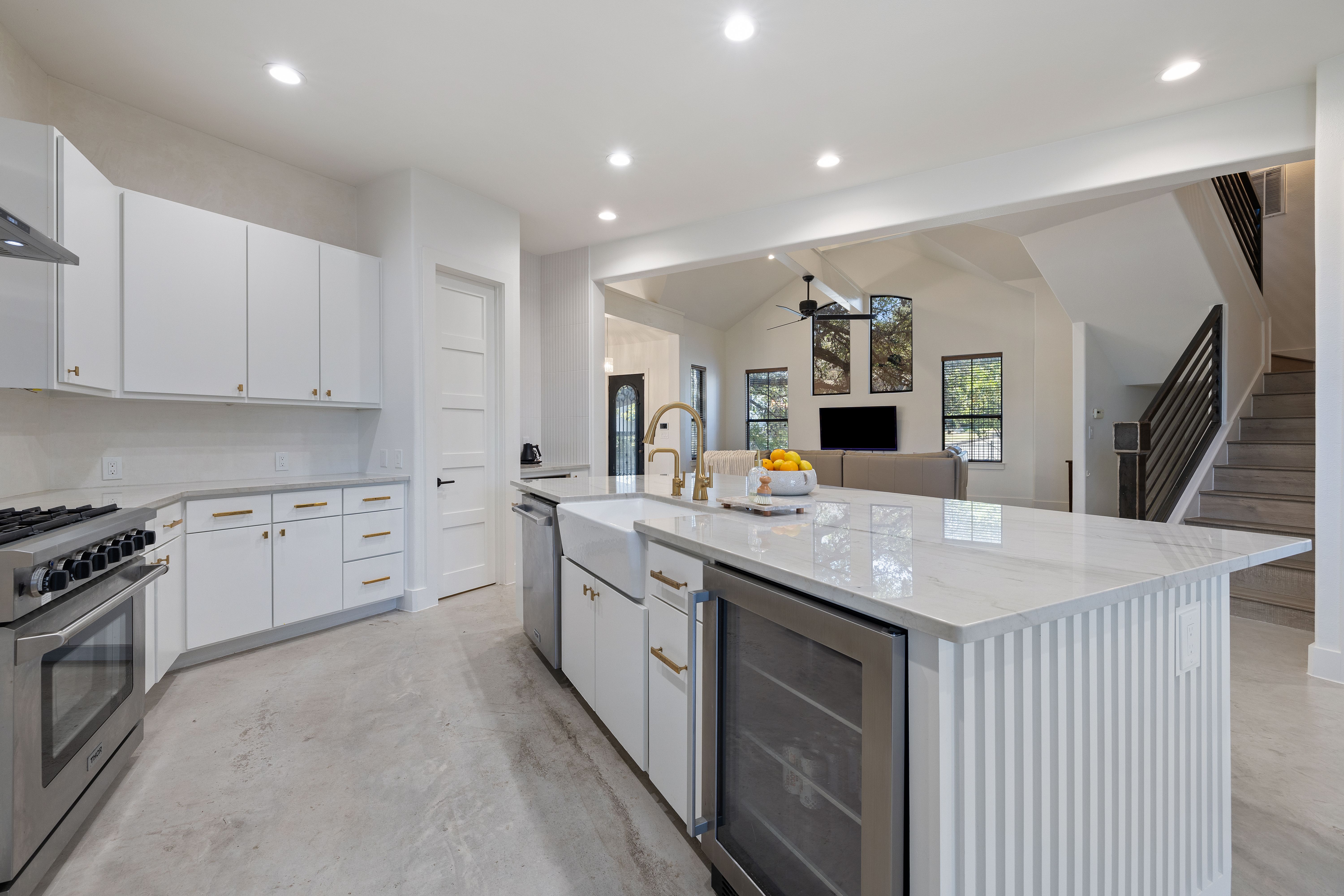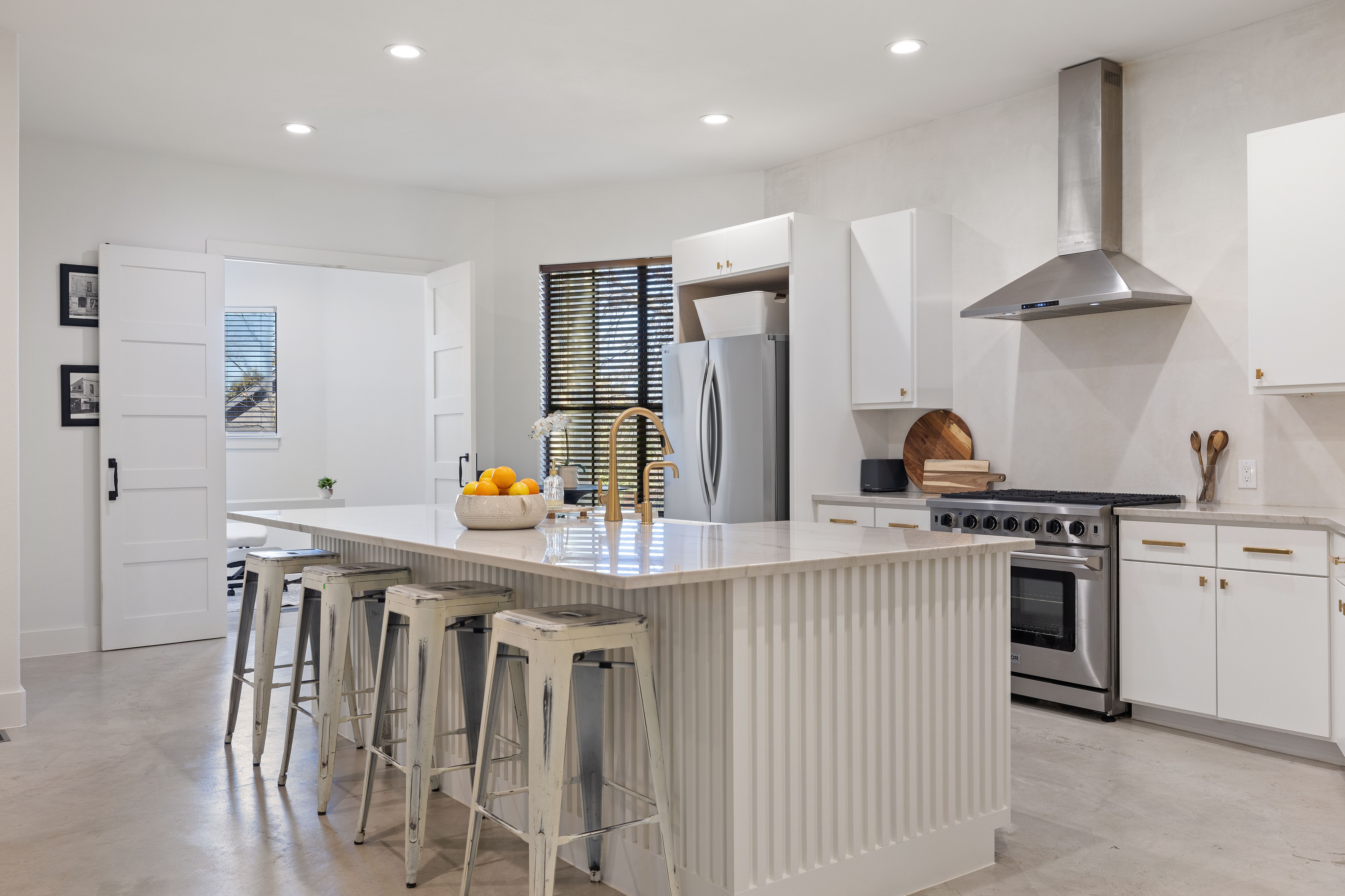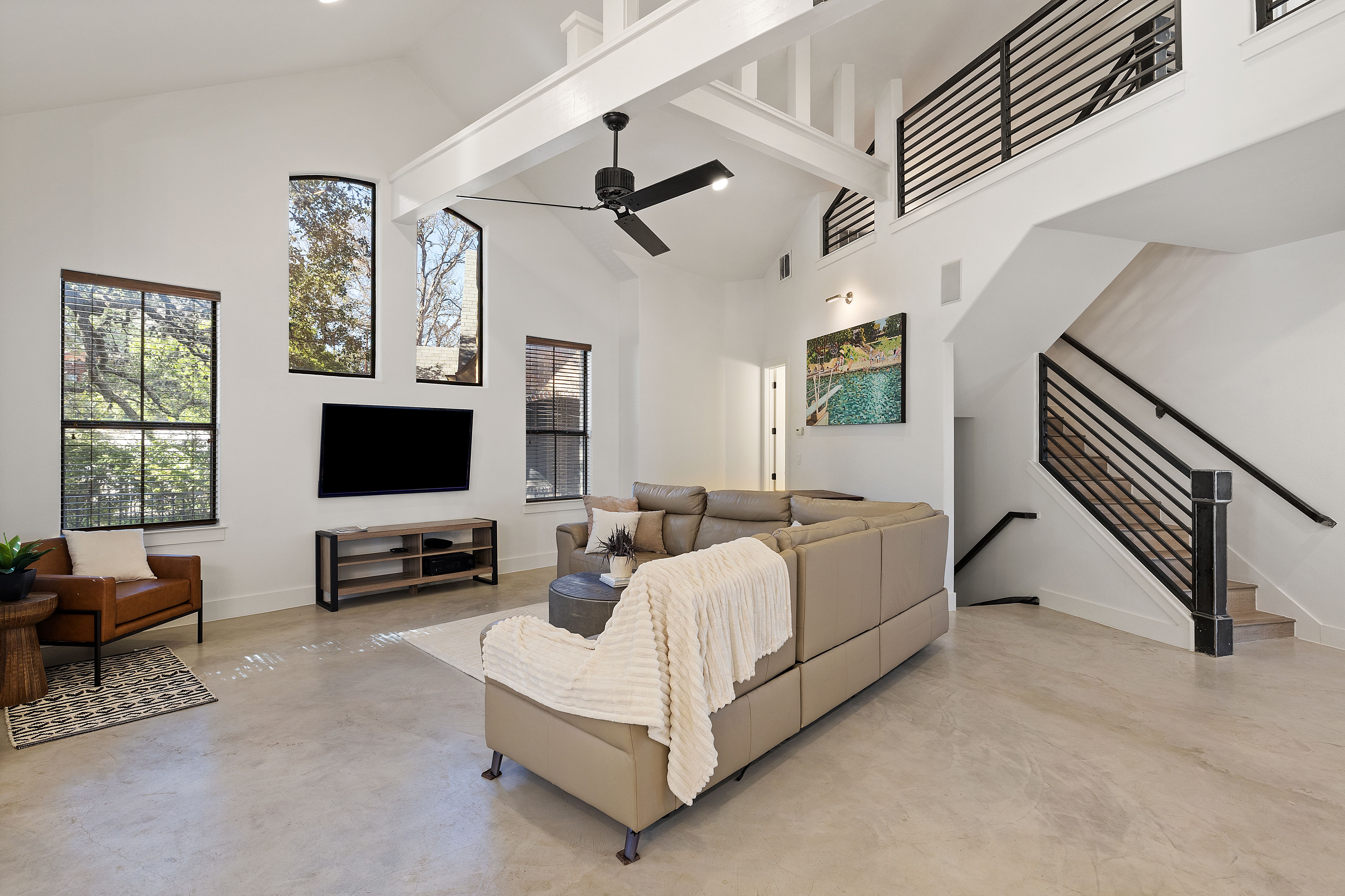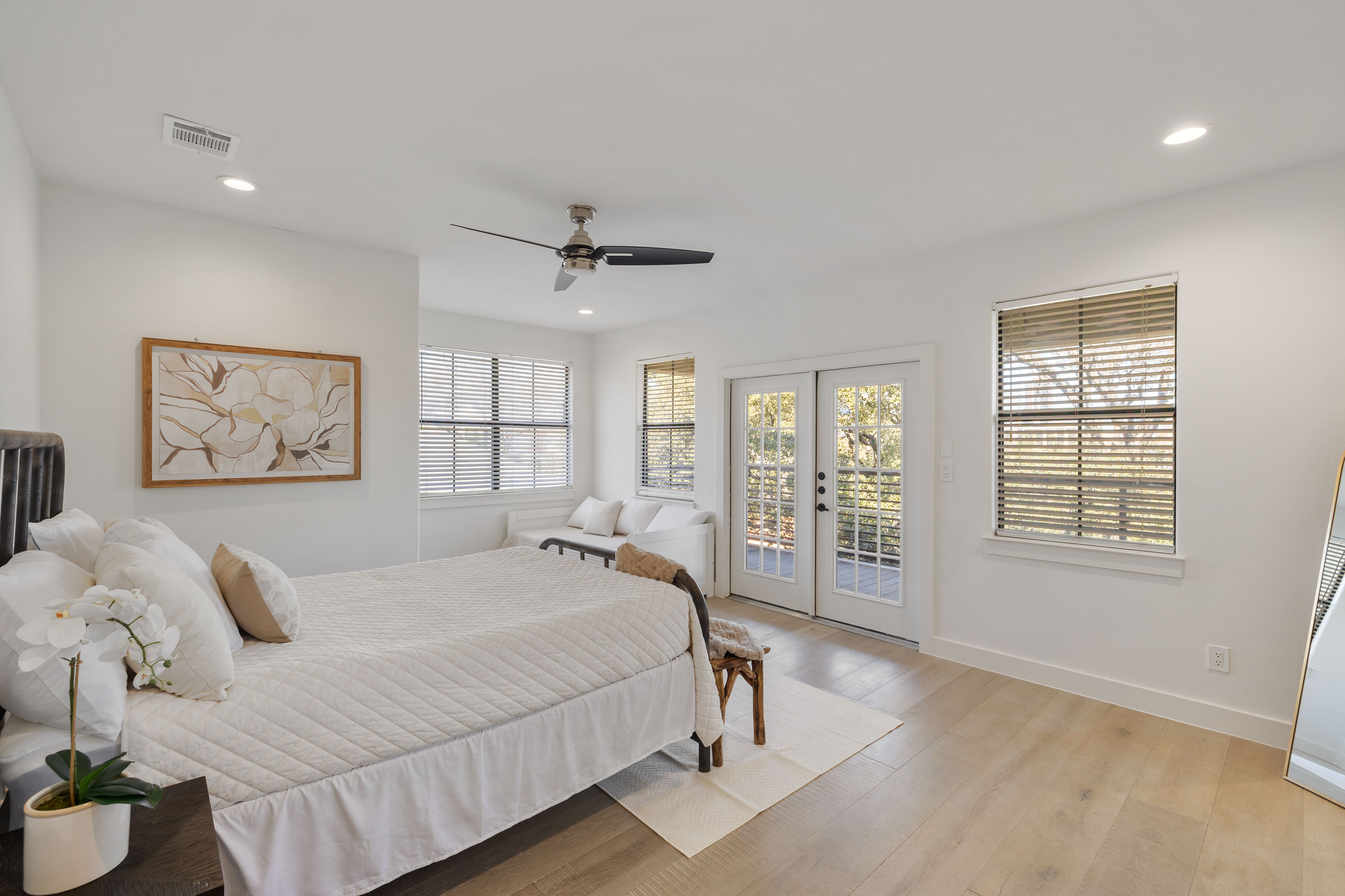 Located on a quiet street in the highly sought-after north end of Travis Heights, this beautifully remodeled home offers an exceptional blend of modern design, privacy, and walkable urban living. Just one block from Lady Bird Lake and the Hike & Bike Trail, and a short stroll to Stacy Park, the property places some of Austin’s most beloved outdoor spaces right outside your door—while remaining only minutes from Downtown and South Congress.Originally built in 2004 and recently remodeled, the home features 3,344 square feet with four bedrooms, three full baths, a powder room, and a dedicated office. Natural light fills the open-concept living spaces, highlighting elegant finishes and thoughtful design throughout.The newly remodeled kitchen serves as the heart of the home, featuring Quartzite countertops, a large center island, Thor appliances, custom cabinetry, and a beautifully designed butler’s pantry offering additional prep space and storage. Oak Perlino wood floors add warmth and sophistication across the main living areas.The spacious primary suite provides a true retreat, complete with a private balcony offering views of Downtown Austin and a spa-inspired bath with a freestanding soaking tub, walk-in shower, and refined finishes.Set behind a fully gated entry, the landscaped yard offers privacy and space for pets, while the rare two-car garage provides both convenience and security.With its premium finishes, thoughtful layout, and unbeatable Travis Heights location just steps from the lake, this home captures the essence of Austin living.