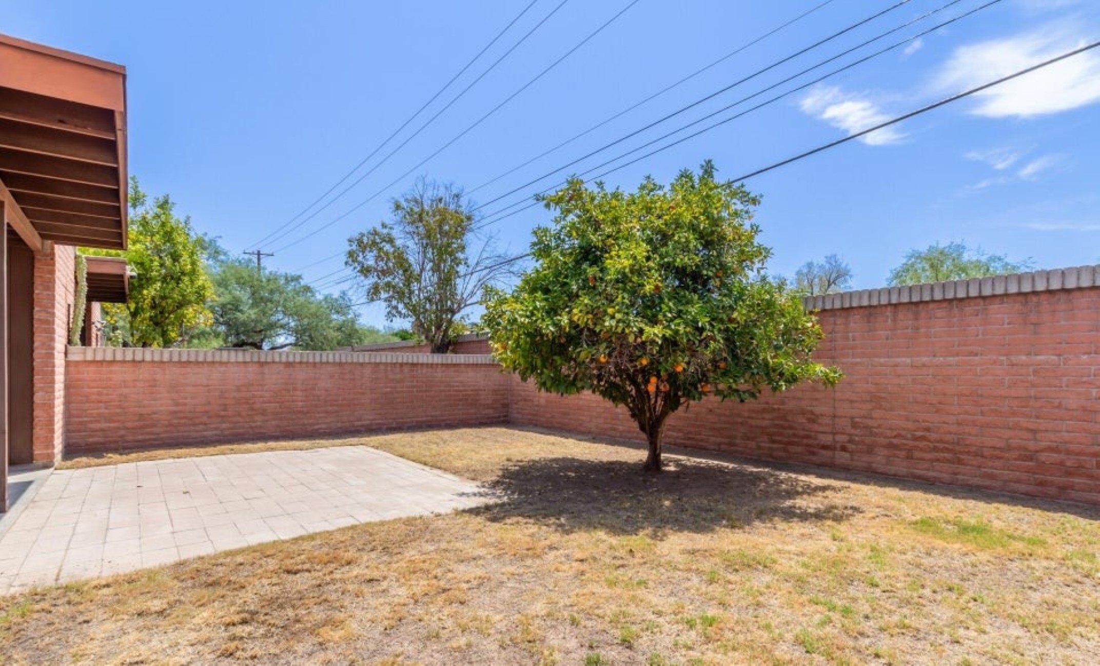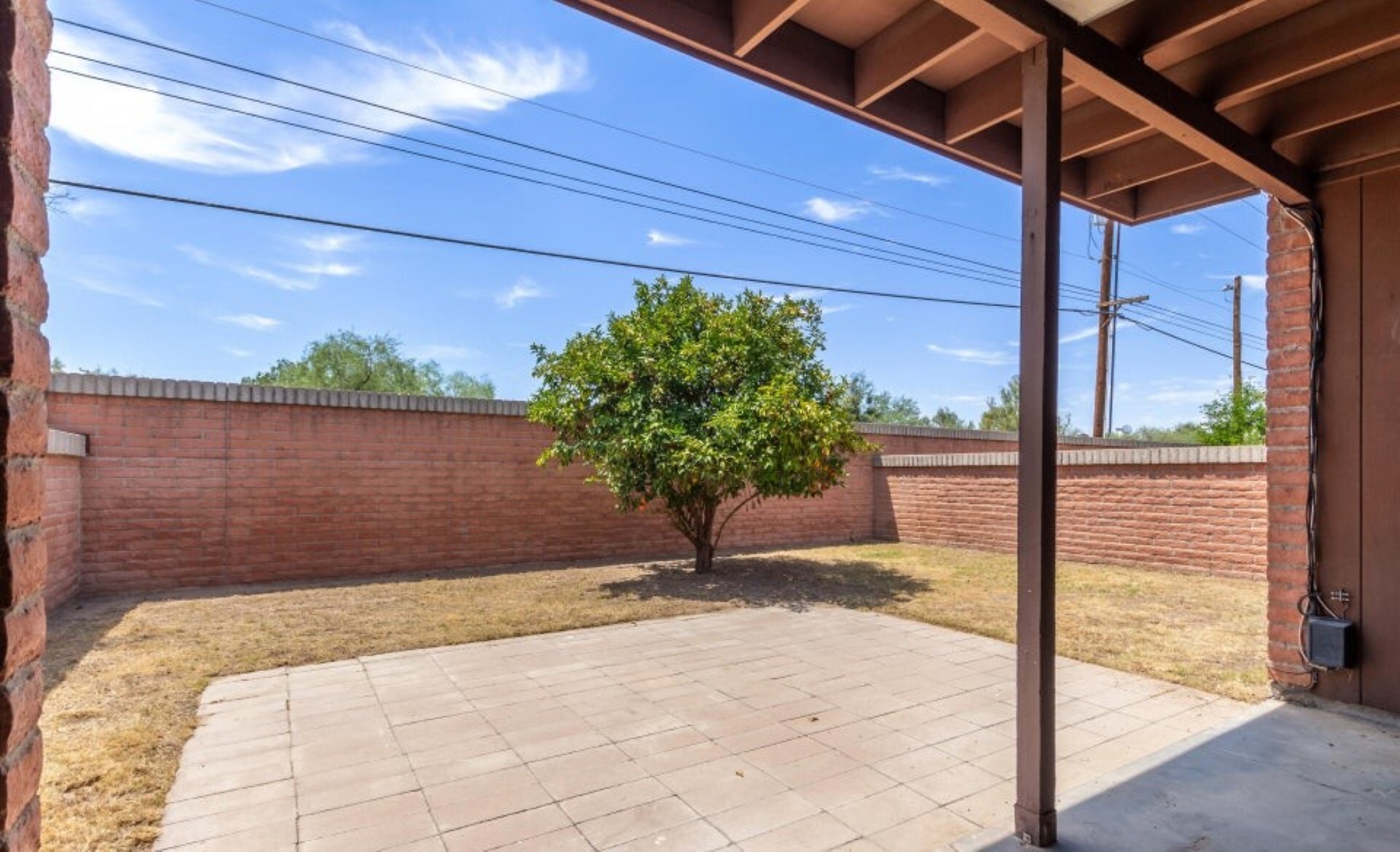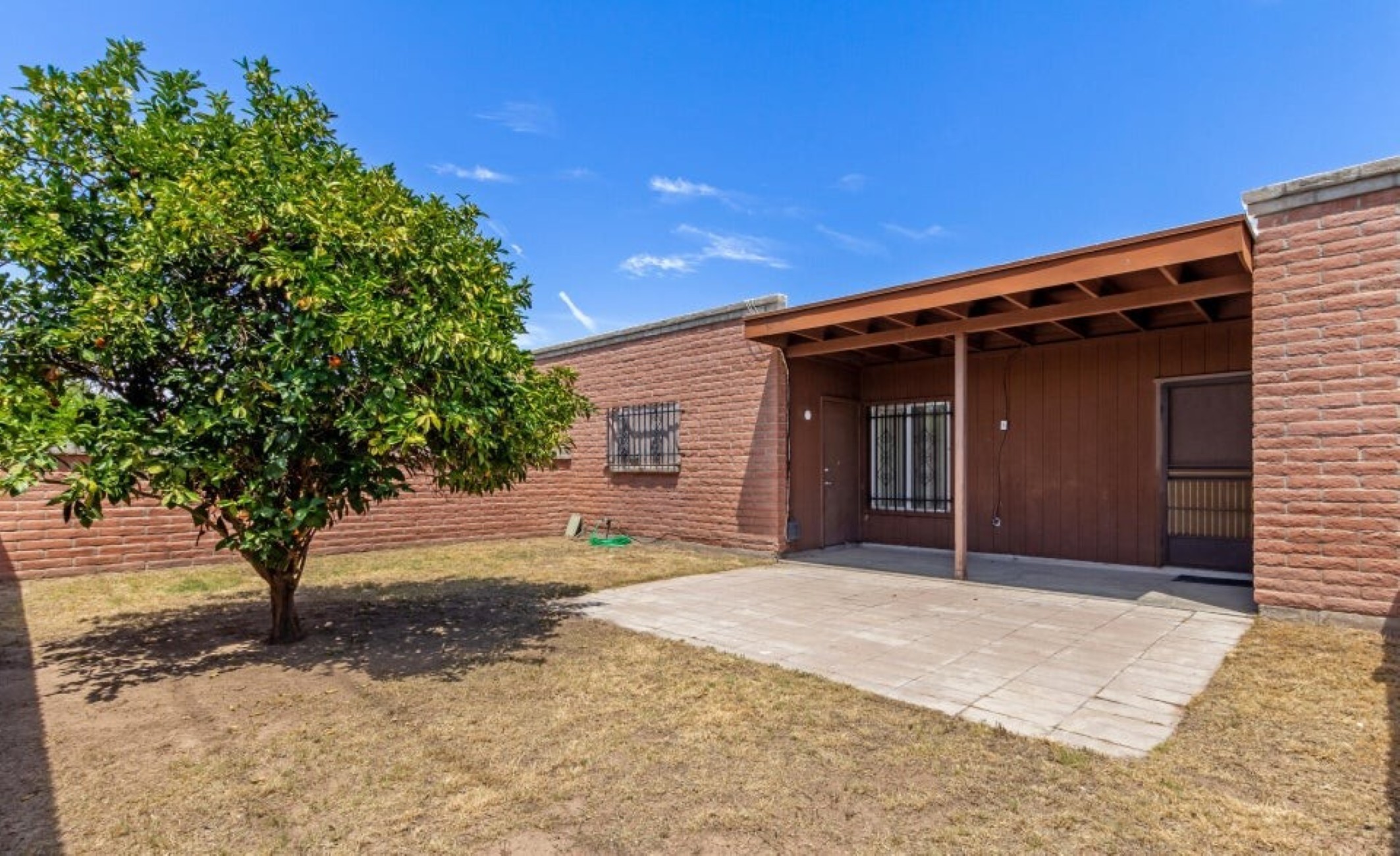 Centrally located townhome with solid block construction, ideally situated next to a 6.6-acre park with/ large shady trees, grass, a basketball court, & a playground. Freshly painted & brand new carpet, this 2-bed, 2-bath townhome is move-in ready! Enclosed garage w/ storage & a gated courtyard that provides privacy. This home has no one behind you, w/ an extra-large backyard w/ grass, a citrus tree. & a covered patio. The great room is spacious & open to the kitchen & dining area. Updated tile throughout. The master suite has a walk-in close & door to the backyard. The ensuite bathroom has a large single vanity w/ a shower. The guest bedroom has a separate bathroom w/ a tub. The community pool is a short walk! HOA covers water, sewer, trash, pool, & common area maintenance.