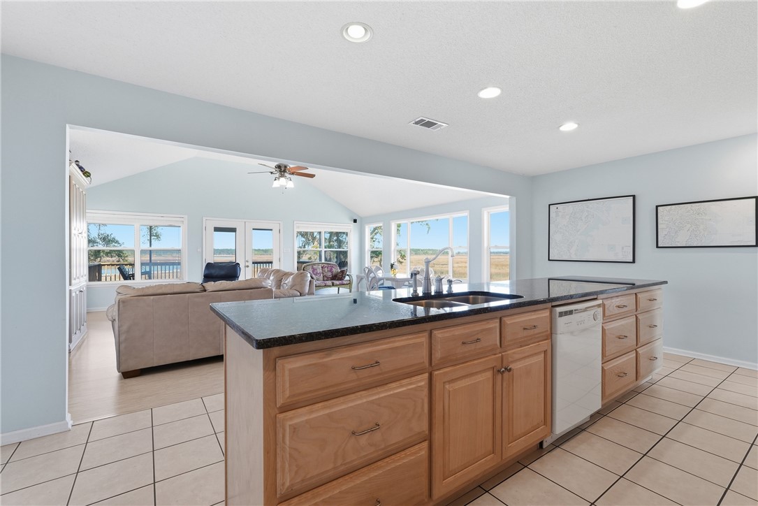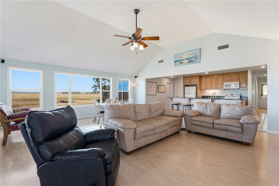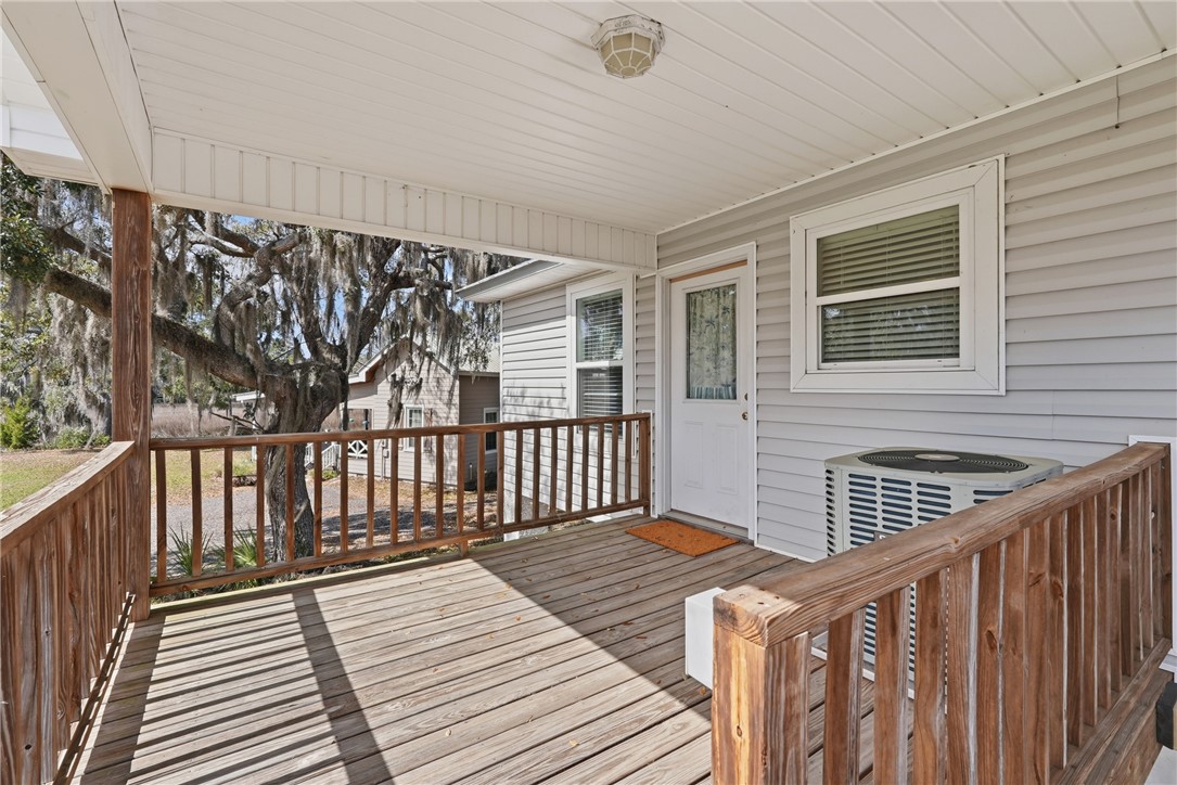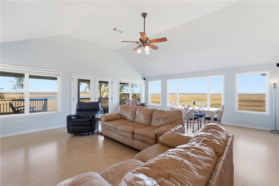 Deep water and marsh views surround this coastal home, offering a truly exceptional waterfront setting. The property fronts the deep waters of the Sapelo River, while the side of the home overlooks a scenic tidal creek and expansive marshland - providing beautiful views in every direction. A community dock is located right next to the property, offering convenient access to the water. Situated within a small, gated community, the setting provides both privacy and a peaceful coastal atmosphere. Inside, the home features an open floor plan with a spacious living and dining room combination. Large windows throughout the main living areas are perfectly positioned to capture the surrounding water and marsh views. The kitchen includes an island with breakfast bar, granite countertops and pull-outs in cabinets. Enjoy the outdoors from the large screened porch or the open deck, both ideal for taking in the waterfront scenery and coastal breezes. The carport area includes an enclosed storage area plus a bathroom (currently water turned off to this toilet). There is a surround sound system with speakers on the exterior and workshop/storage area too! Being sold with some furniture. PLEASURE POINT subdivision is a gated community of only 8 lots featuring Covered Dock with boat slips on Sapelo River. Located near grocery store, Piggly Wiggly, and delicious restaurants such as: Altmans, Fish Dock at Pelican Point, Hunters Cafe at Shellman Bluff, also nearby are Golf Courses. UTILITIES: GA Power, Community Well, Septic, Trash - community dumpster. Metal Roof 9 yrs. Beautiful area!