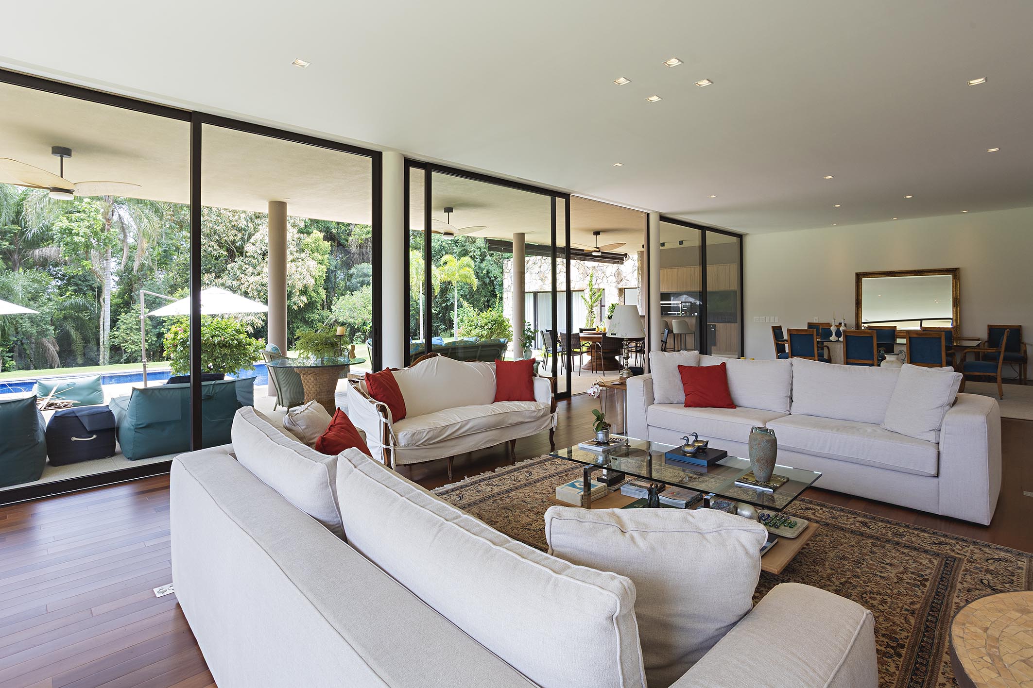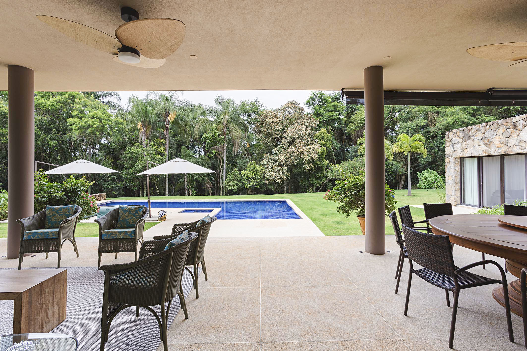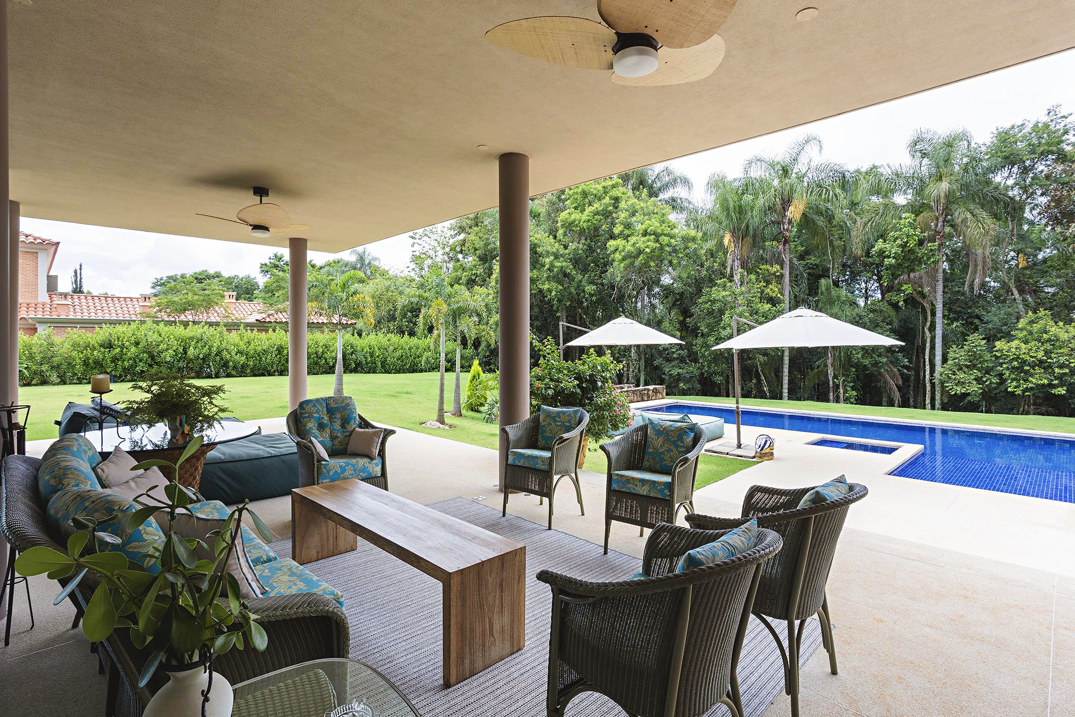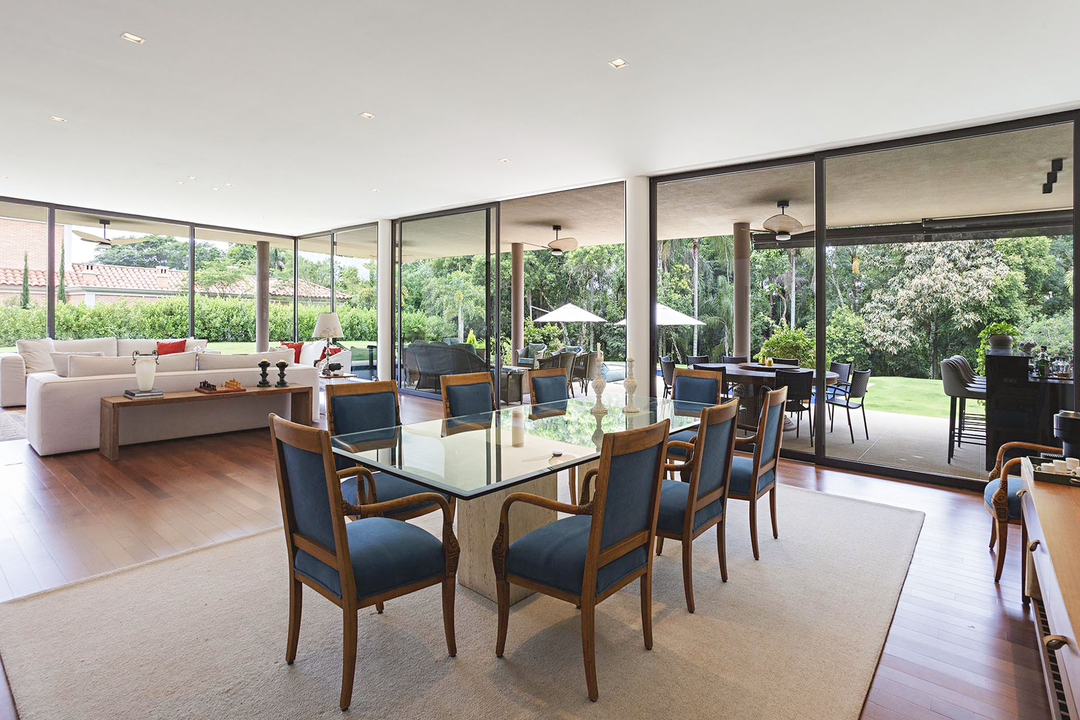 Located within the Quinta da Baroneza condominium, in a quiet countryside setting in the interior of São Paulo, this residence was built in 2023 on a flat plot facing the forest, featuring contemporary architectural lines and generously proportioned interiors. The design emphasizes seamless integration between spaces, with a social area composed of a living room connected to the gourmet area, creating a continuous environment ideal for entertaining, in addition to a home theater and elevator. The outdoor area includes a swimming pool, spa, sauna, and a multipurpose lounge with a bathroom that can be adapted to different uses according to the resident’s needs. On the upper floor are six well-distributed suites, along with a linen room serving the private area. The residence also features a staff suite and a caretaker’s house with two bedrooms, bathroom, living room, and kitchen. The functional layout organizes the spaces in a fluid manner, with abundant natural light, privacy, and permanent views of the surrounding greenery.