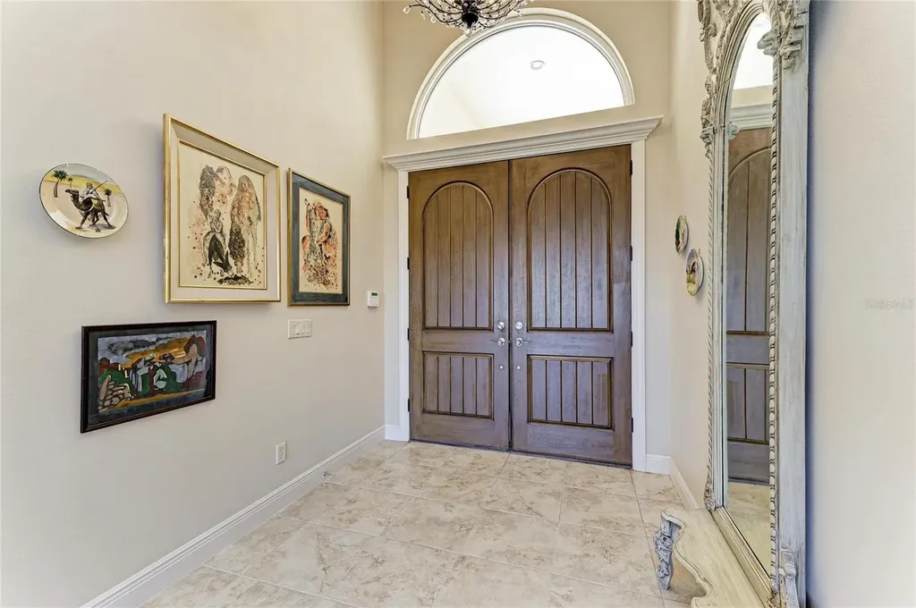 Welcome to your dream home in prestigious Sarasota Ranch Club, where luxury meets tranquility. Nestled on over 10 acres, this stunning John Cannon custom-built residence offers unparalleled privacy. Surrounded by Florida's native trees and natural foliage, making it an ideal setting for equestrian enthusiasts and nature lovers. Imagine waking up to the sight of deer grazing in your backyard and enjoying visits from wild turkeys and sandhill cranes, all while conveniently located near essential amenities. Step inside this Mediterranean-style masterpiece, boasting 3,938 sq. ft. of thoughtfully designed living space. The functional split floor plan seamlessly connects the chef's dream kitchen to the great room and dining area, perfect for entertaining. The kitchen is a culinary haven, featuring 42 cabinetry with soft-close drawers, top-of-the-line Thermador stainless steel appliances, a custom vented hood, and a spacious island. Additional highlights include a wine bar with granite countertops and a wine/beverage cooler, ensuring you have everything you need for hosting gatherings. The home is equipped with impact windows and doors, and a whole-house generator providing peace of mind and security. Step outside to your expansive brick paver screened lanai, where outdoor living reaches new heights. This custom-built space includes an outdoor kitchen, seating and dining areas, and a cozy fire pit. Dive into the heated inground saltwater pool or unwind in the jetted spa, all while enjoying the views of your lush surroundings. The master suite features a recessed tray ceiling with dimmable lights, a ceiling fan, and dual closets. Indulge in the ultimate spa-like experience within the luxurious master bath of this exquisite home. Featuring double vanities (one with a custom 3-way lighted mirror) that provide ample space for your daily routines. The highlight is the expansive two-person tiled step-in shower, perfect for unwinding after a long day. For those who enjoy the outdoors, a private two-person outdoor shower offers a refreshing escape. This master bath is not just a functional space; it is a personal retreat that elevates your everyday living. The thoughtfully designed bonus room adds versatility to this stunning property, allowing you to create a fitness haven, craft sanctuary, or even a future fourth bedroom. Each guest bedroom features custom window treatments, along with easy access to the second and third bath will ensure that your guests feel right at home. Enhance your work-from-home experience with our dual office setup. Practicality meets elegance in the convenient mudroom, which boasts a built-in bench, shelves, and a stylish wood panel design, providing an organized entryway. The laundry room is a dream come true, featuring cabinetry, a built-in ironing board, washer/dryer, and laundry sink for added functionality. Don't forget the 9 x 11 air-conditioned storage room. The oversized two-car garage with a side entry, 220-volt charger for electric car and pull-down stairs, complemented by a separate single-car garage, offers ample storage and parking solutions. Nestled in a beautiful community with a reasonable HOA fee that covers gated entry, common area maintenance, and horse trail upkeep, this meticulously maintained home is a must-see for those seeking luxury and comfort in their next residence while remaining close enough to the premier amenities of Lakewood Ranch and Sarasota. Call today to schedule your private showing.