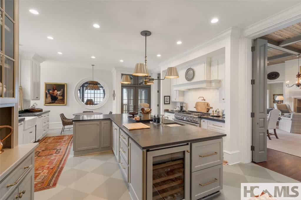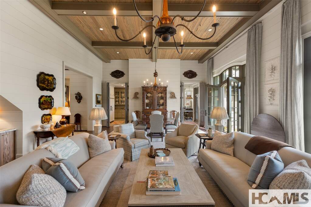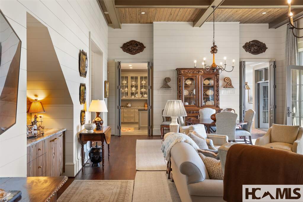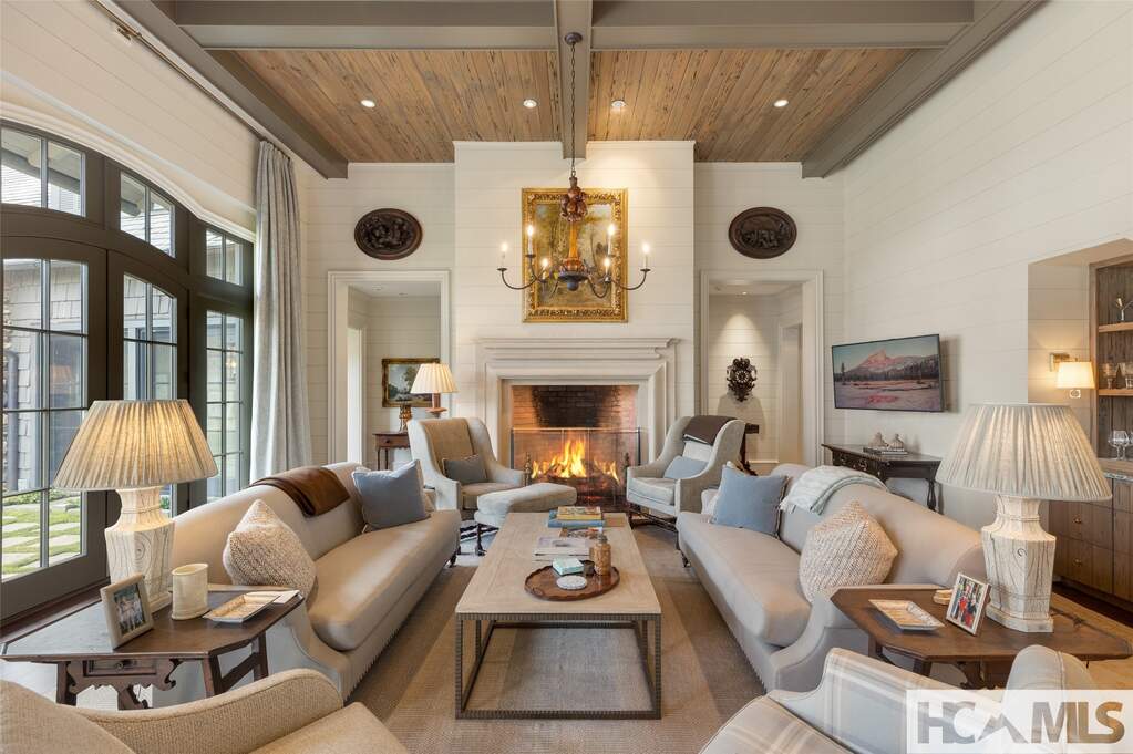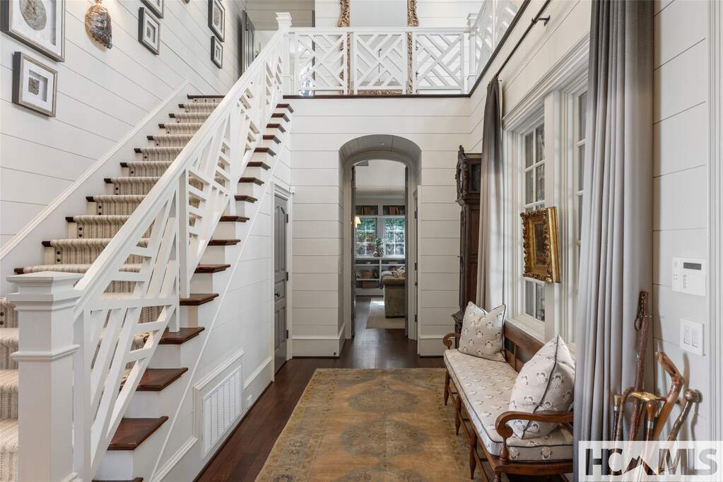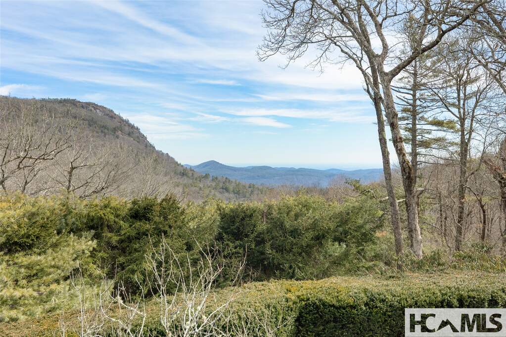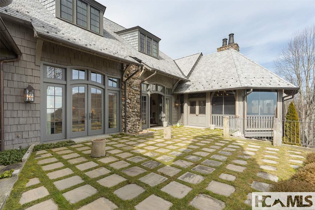 This architectural classic within Highlands Country Club reveals itself bit by bit. Expecting simplicity from the street view, you will be charmed by the arched porte cochere and the babbling brook at the front door. Once inside the two story foyer, the delights multiply as you admire details and begin to catch views over Blue Valley. The large family room with soaring pecky cypress ceilings opens to a flat grass and stone terrace revealing long range views to South Carolina. Opening to the terrace as well is an exquisite outdoor great room for dining and lounging in front of a fabulous stone fire place. Just adjacent, the roomy cook's kitchen, equipped with lots of storage and pantry areas, will make entertaining a breeze. The main floor also boasts the luxurious primary suite which entails bedroom, bath, closets, as well as private office and beautiful library. Three of the home's six fireplaces are found in these primary rooms. On the upper level, grand guest rooms, one with its own fireplace, plus a bonus bunk room and a play room, will welcome all the guests in comfort. The unique guest apartment with full kitchen and private entrance will delight and surprise you. On the lower terrace level, you will find a stone entry to the quintessential wine tasting room. The large work out room and heated garden room complete the package. Attention to detail will be evident throughout the home: Brazilian Cherry floors, elevator, Lutron lighting systems, radiant floor heat in the porch, garage and garden room; luxury bath features as heated floors, towel rack, and steam shower; remote shades and drapes, and more. Builder, John Underwood. Interiors, Nancy Warren. Landscape design, Alex Smith
