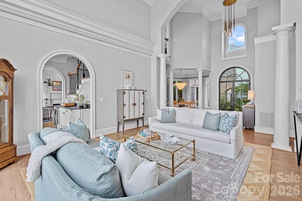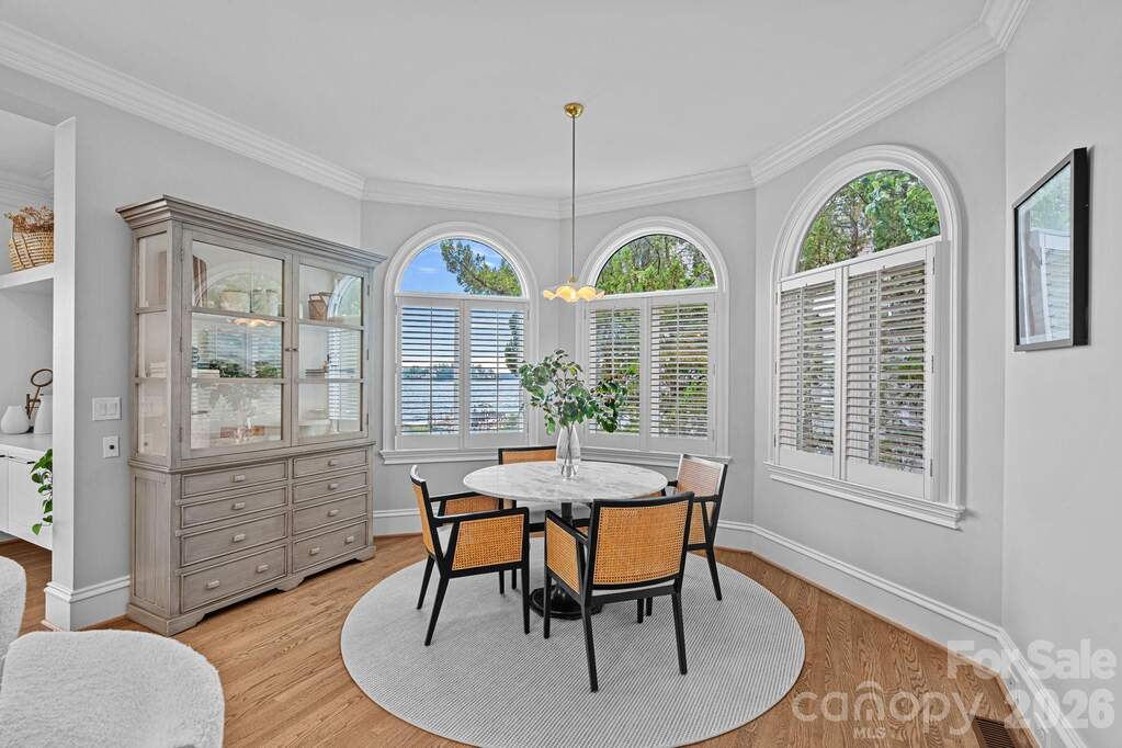 Experience designer waterfront living on one of the most coveted streets in The Peninsula. This rare turn-key estate offers over 6,000 sq ft of beautifully updated living space with 5 bedrooms and 6.5 baths, all thoughtfully designed with high-end finishes and striking designer lighting throughout. The open floor plan welcomes you with a dramatic two-story great room framed by expansive windows capturing breathtaking long-range Lake Norman views. A chef's kitchen features a Wolf range with custom hood, dual wall ovens, Sub-Zero refrigerator/freezer, custom cabinetry with under-cabinet lighting, quartzite island, beverage bar, and an inviting keeping room overlooking the water. The main-level owner's suite offers stunning lake views, private terrace access, and a spa-inspired bath with dual vanities, designer tile, quartz countertops, and a custom walk-in closet with marble waterfall island. A main-level guest suite and additional ensuite bedrooms provide comfort and privacy for family and guests. The walk-out lower level is designed for entertaining with expansive recreation space, billiards and poker areas, TV lounge, fitness room with lake views, pool bath access, and a lakeside storage garage. Situated on nearly acre with approximately 100 feet of shoreline, the resort-style backyard features a custom pool, expansive terrace, covered patio with outdoor kitchen, professionally designed landscaping with lake-fed irrigation, and a deeded covered dock with 10,000 lb lift. A gated courtyard entry with fountain and a two-car garage with lift capability for four vehicles complete this exceptional property. Enjoy the ultimate Lake Norman lifestyle just a golf cart ride to The Peninsula Club, walking distance to the Yacht Club, and minutes from Jetton Park, shopping, dining, and Uptown Charlotte.