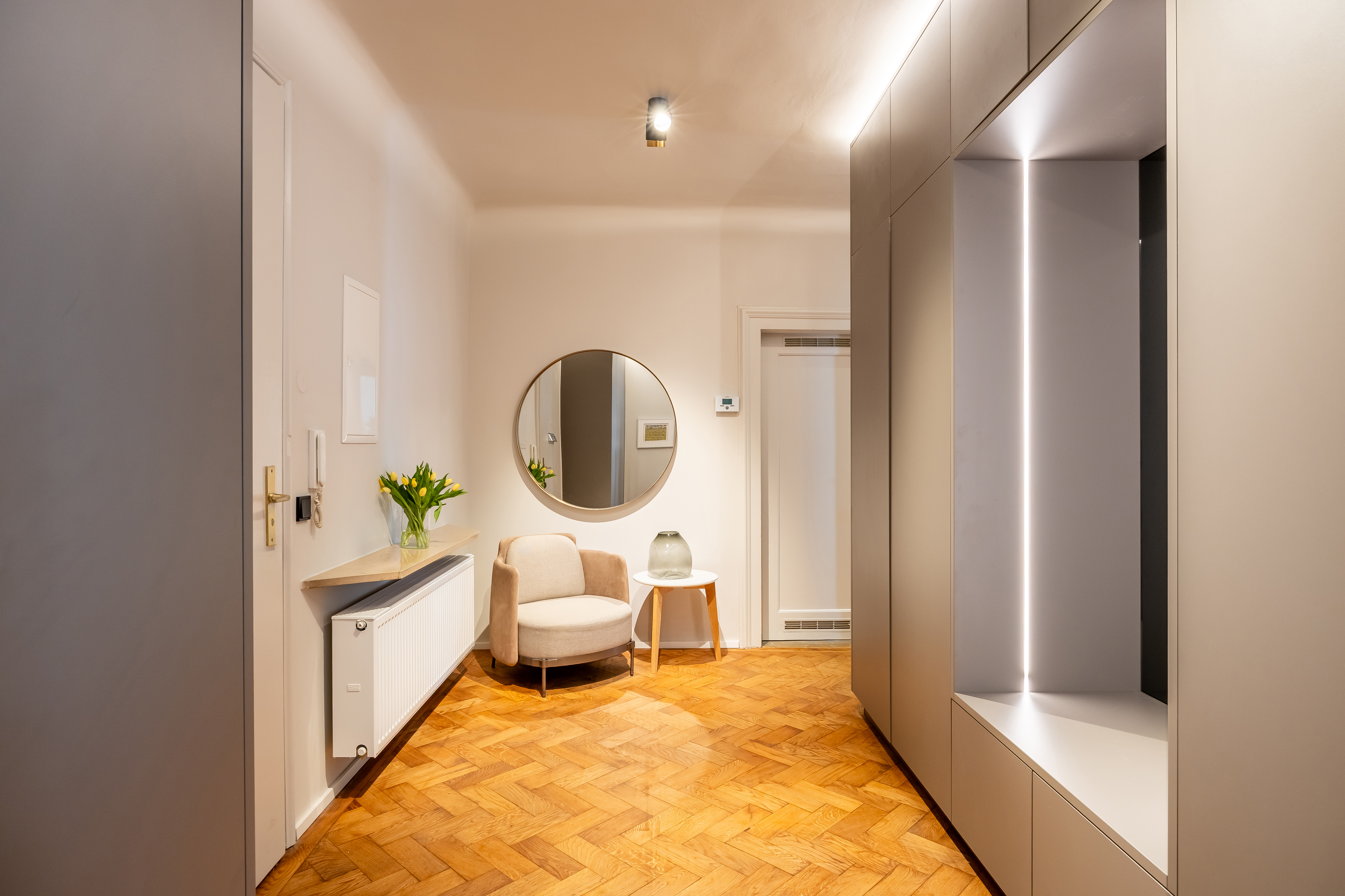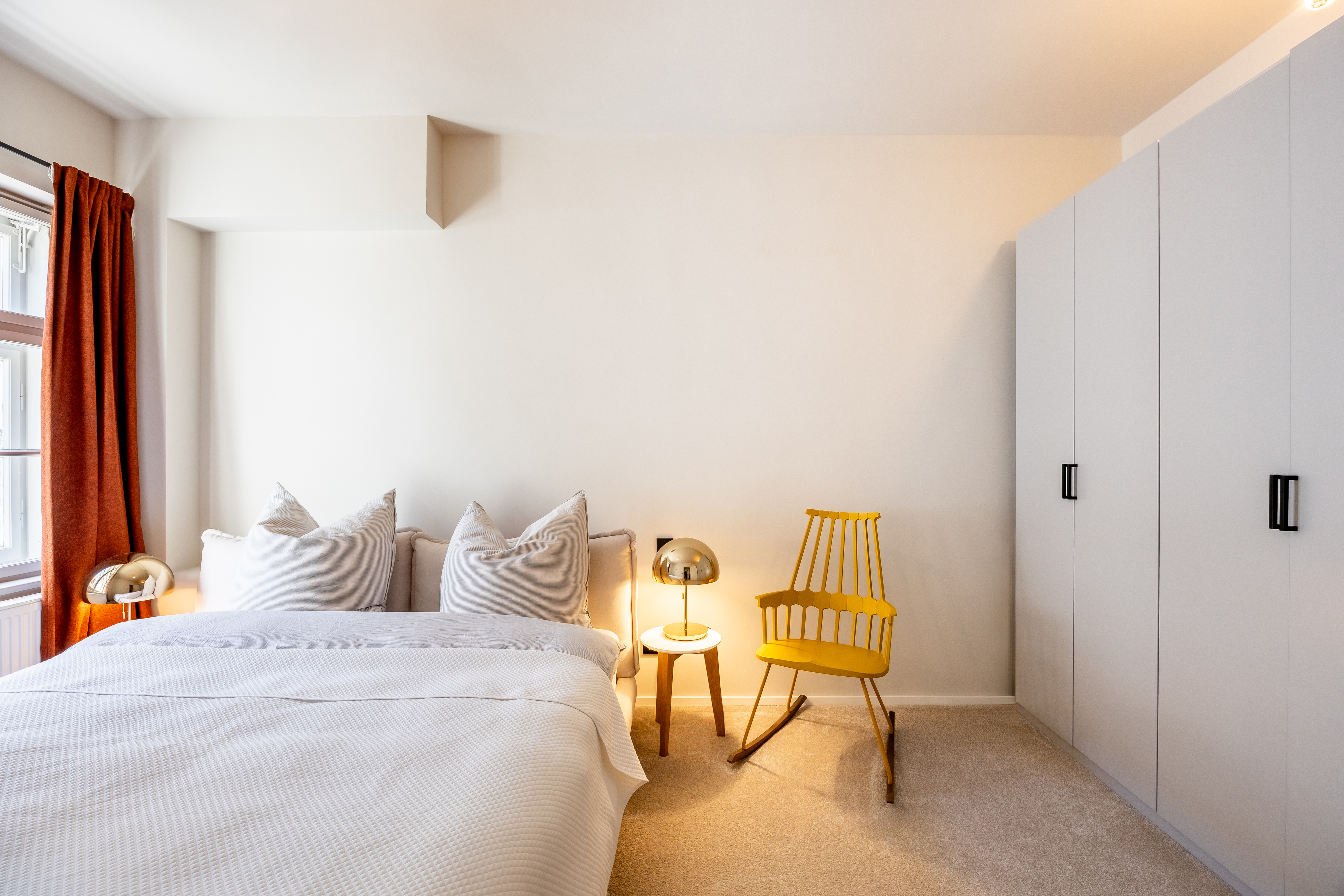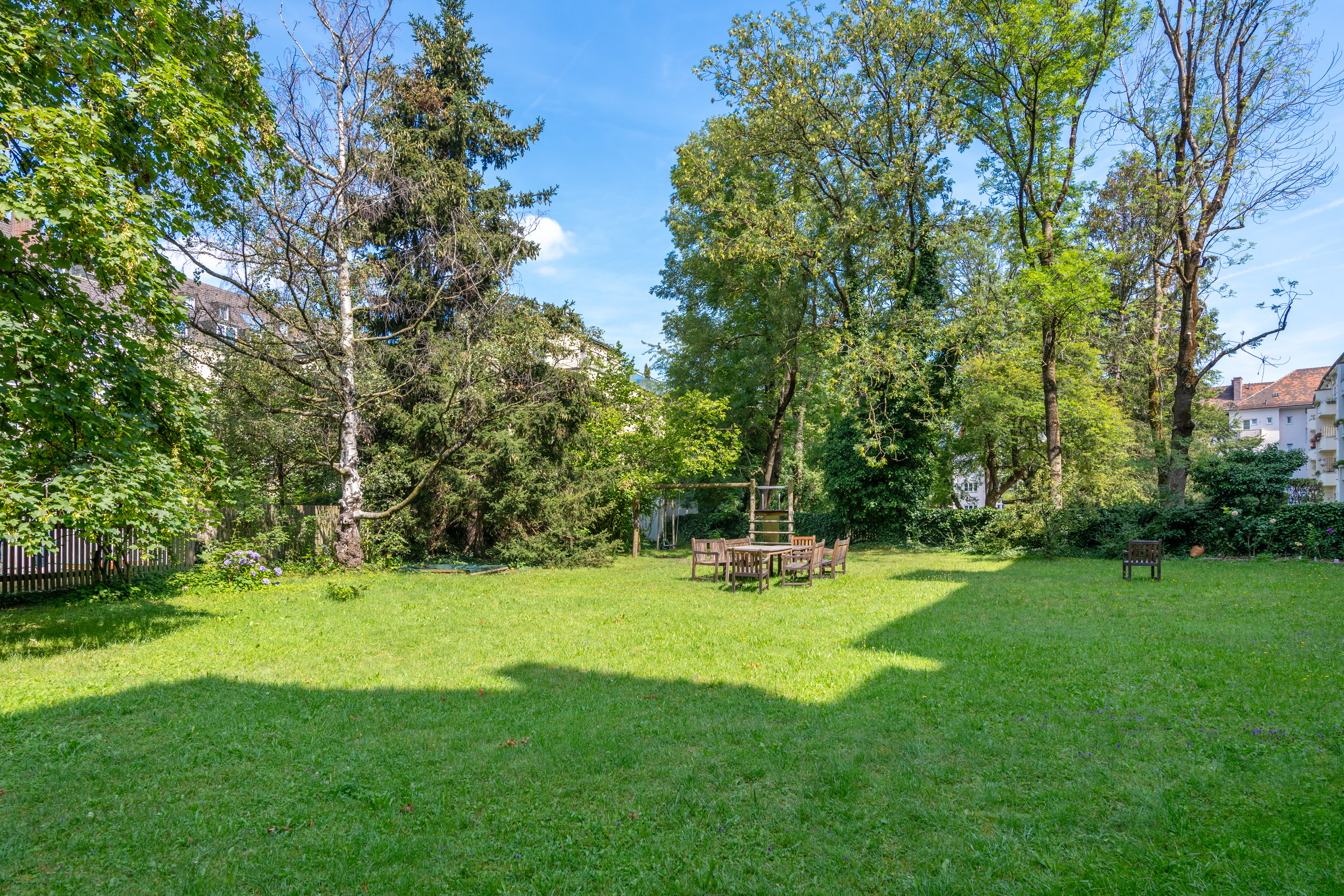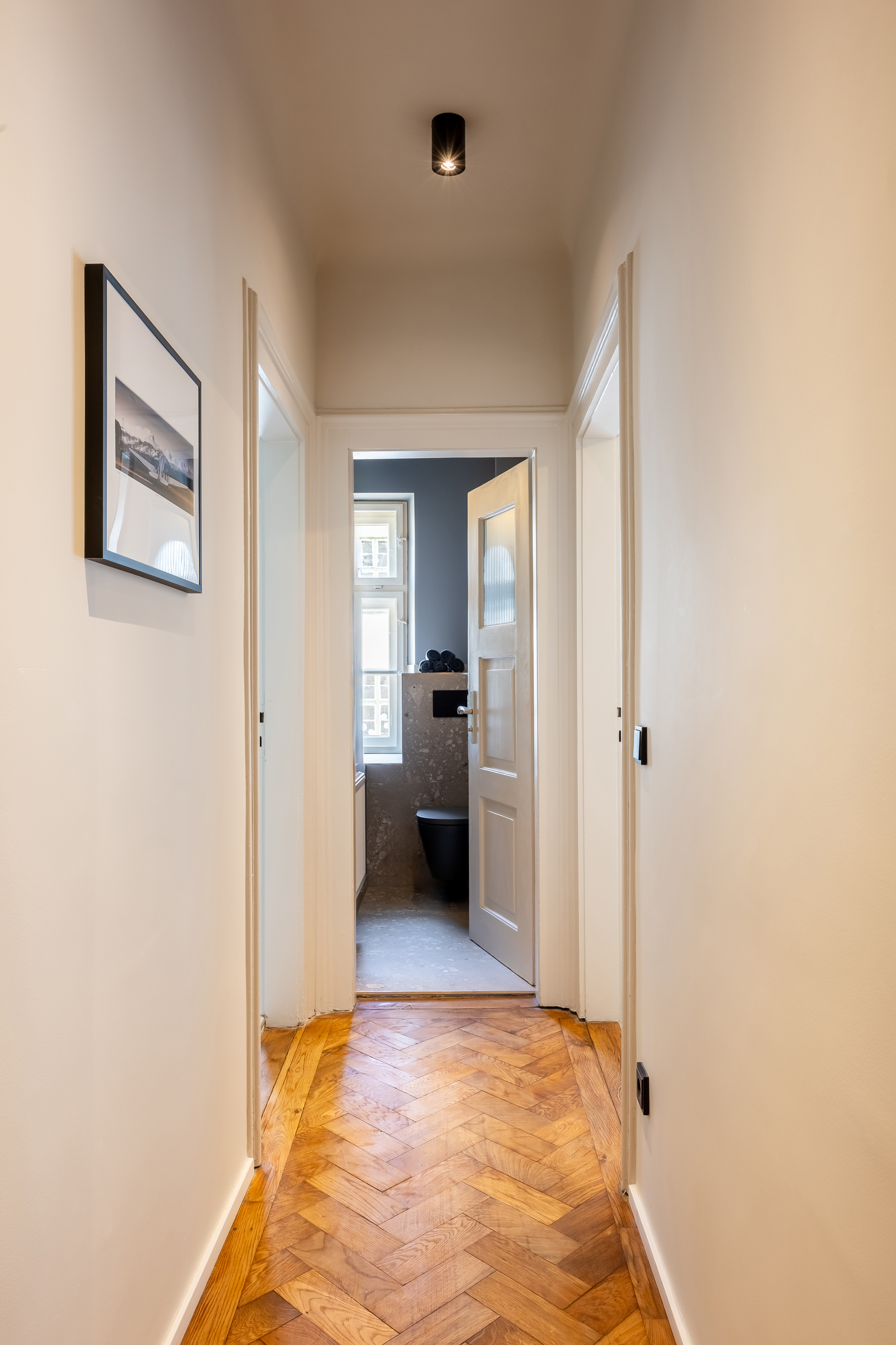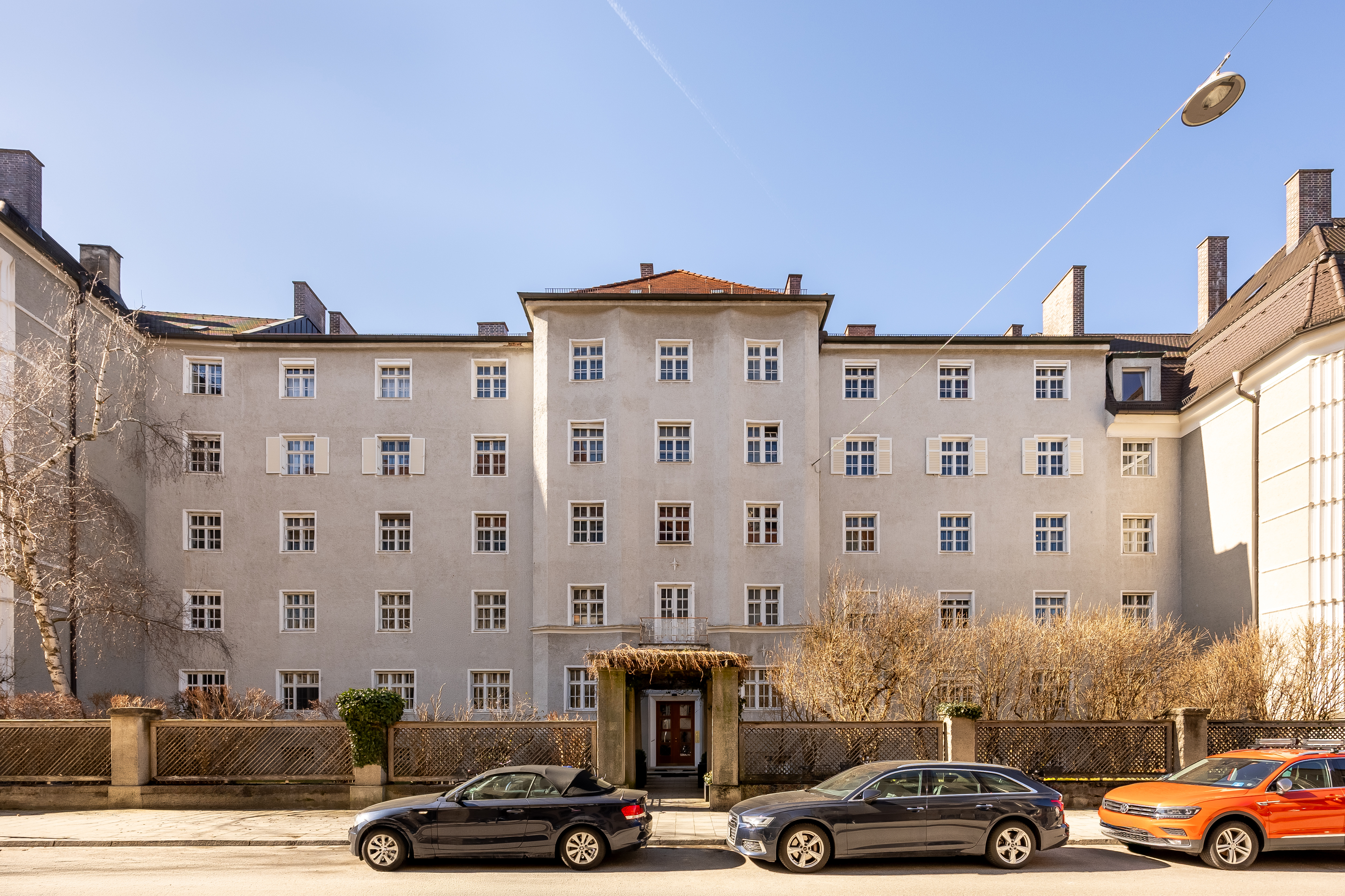 Design domicile in a central yet quiet location: This apartment, lavishly modernized in 2024/25 with a special aesthetic sensibility, is located on the 2nd floor and forms a stylish, ideally cut city domicile near Münchner Freiheit.A representative room structure combines living, dining and cooking. There is also a bedroom, a daylight bathroom, a guest WC and a spacious utility/storage room with self-sufficient gas floor heating. In the course of the modernization, the floor plan was adapted to contemporary ideas, brought up to date technically and designed with a feel for trends. The fixtures and fittings include an exclusive carpenter's kitchen and other beautiful custom-made fixtures, original oak herringbone parquet flooring as well as historic panel doors and box-type windows. The bathroom and guest WC impress with their stylishly minimalist design. The result is a successful symbiosis of old building charm and modern living comfort.Valuable storage space is available in a cellar compartment. A highlight is the spacious, sunny communal garden, which is a rarity in this location and offers an enormous increase in quality of life.