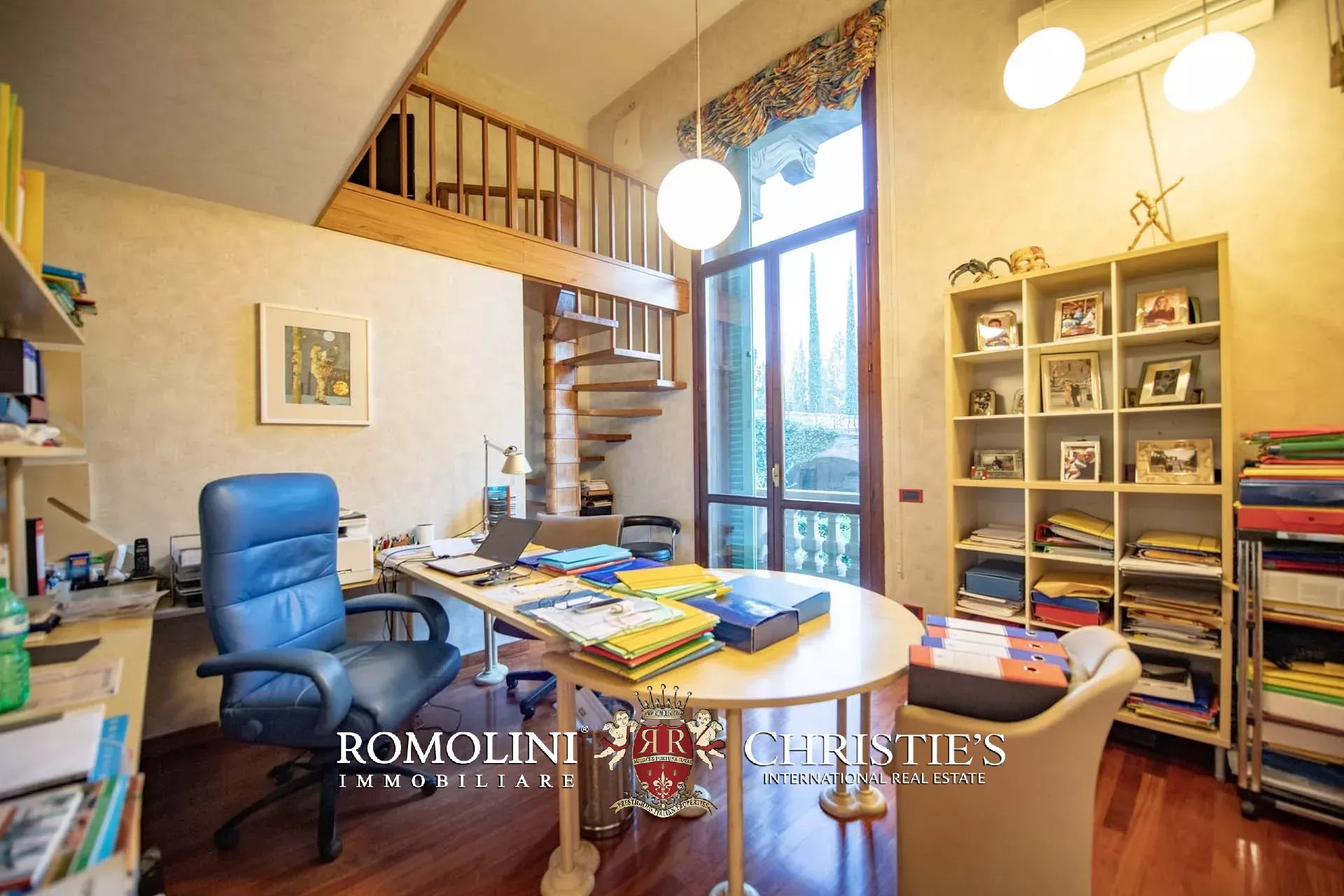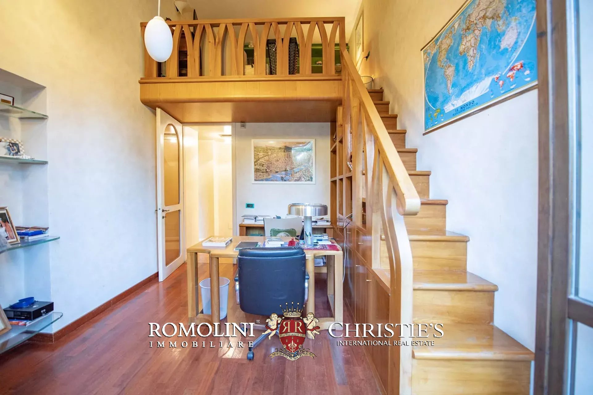 The apartment (365 m² – 3,927 ft², 5 bedrooms and 4 bathrooms) is located on the two lowest floors of a Liberty-style period villa set on the heights above Florence. From the stately external staircase, one arrives at a central entrance hall, and from here one goes to the spacious living room with balconies on the left. On the right, a hallway leads to the apartment's small kitchen, the apartment's three bedrooms (all with exit to the outdoor terraces) and the bathroom. The last room provides access via a spiral staircase to a loft where there is currently a bed but which could be used as a study. From the central room, another wooden staircase ascends to a second loft consisting of a walk-in closet and private bathroom. Back at the entrance, an internal staircase descends to the basement where there is a large living room (also known as taverna in Italian) with a fireplace, ideal as a play area, a kitchen with dining room, bathroom and bedroom.