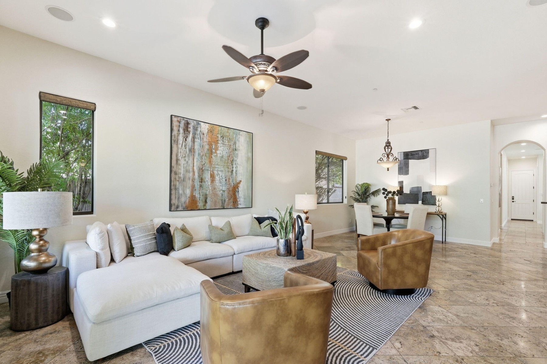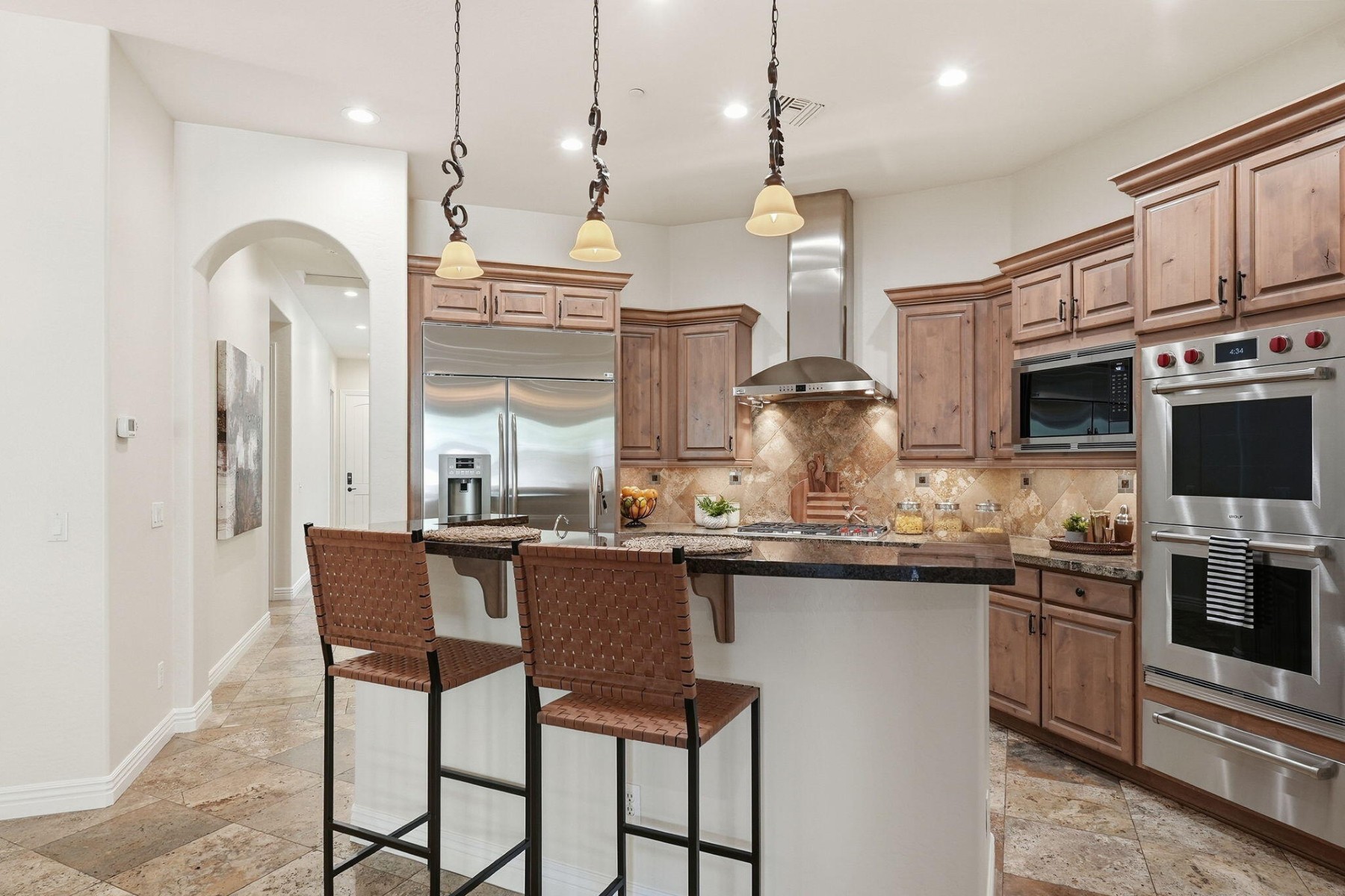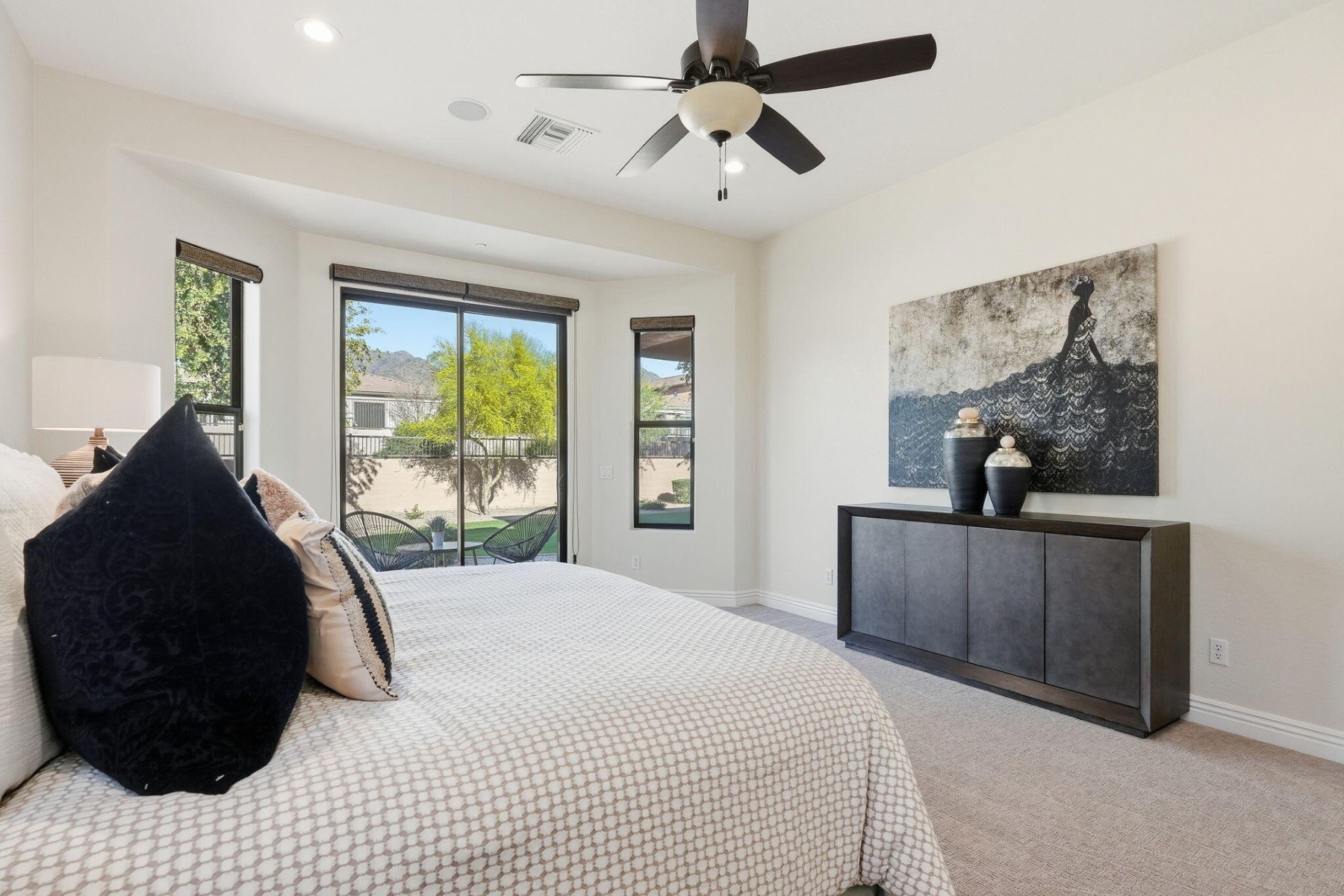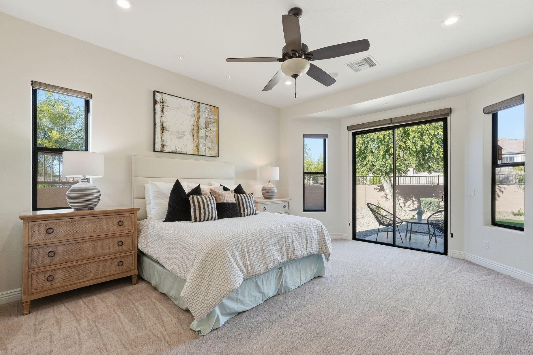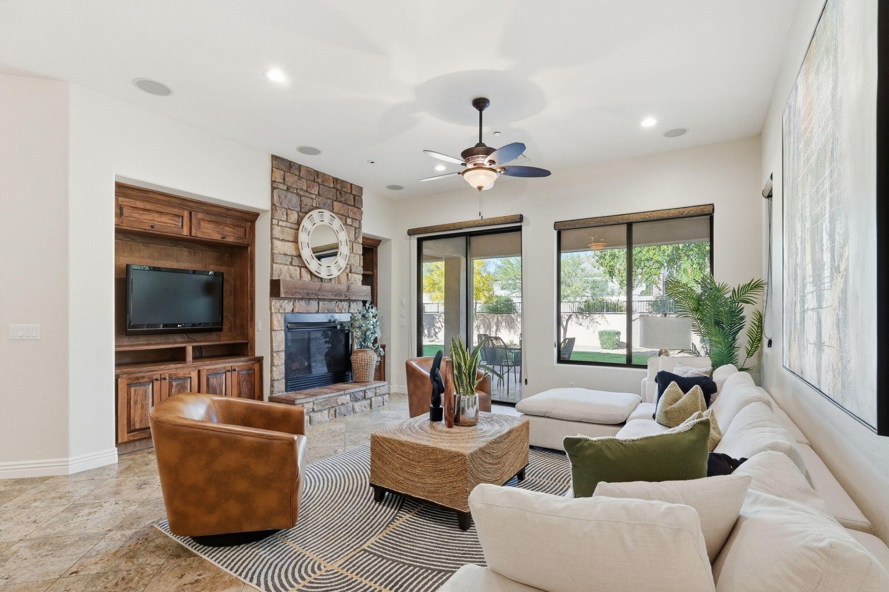 Located in the luxurious guard-gated community of Windgate Ranch, this single-level Toll Brothers home sits on a quiet cul-de-sac. The open floor plan features 4 bedrooms, 2.5 bathrooms, a spacious great room & split layout ideal for privacy & entertaining. Chef's kitchen offers a large island, breakfast bar, new Wolf gas cooktop/microwave/double ovens, Cove dishwasher, ample cabinetry, & a casual dining area that opens to the family room. The primary suite includes patio access, a spa-like bath with dual vanities, jetted tub, walk-in shower, & large walk-in closet. Newly carpeted bedrooms. Backyard features a covered patio & grassy area for outdoor living. Short walk to amenities including 3 resort-style pools, clubhouse, fitness center, tennis courts, pickleball, parks, & walking paths.