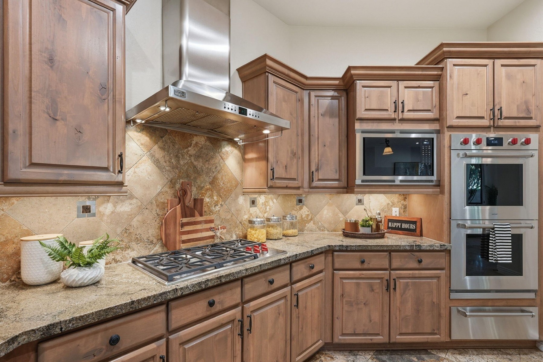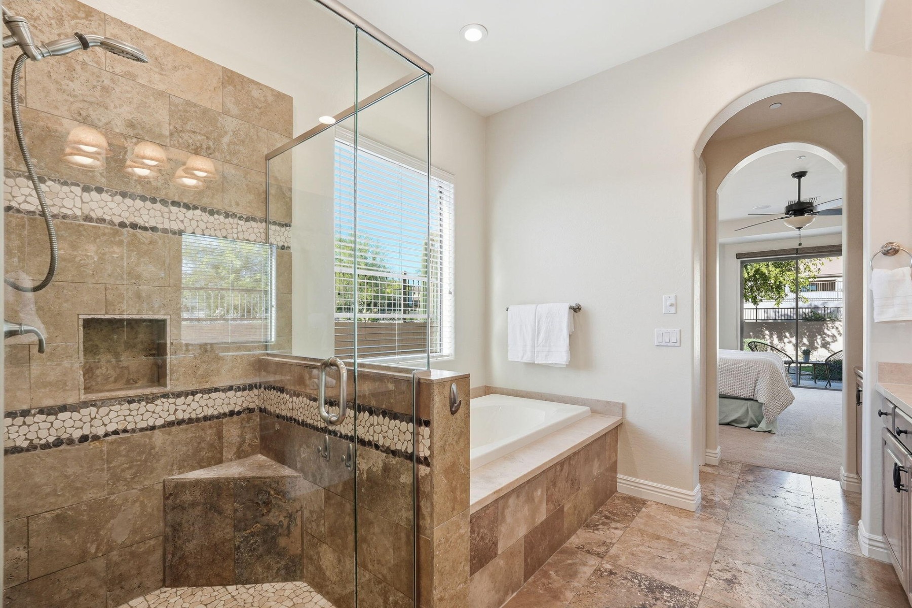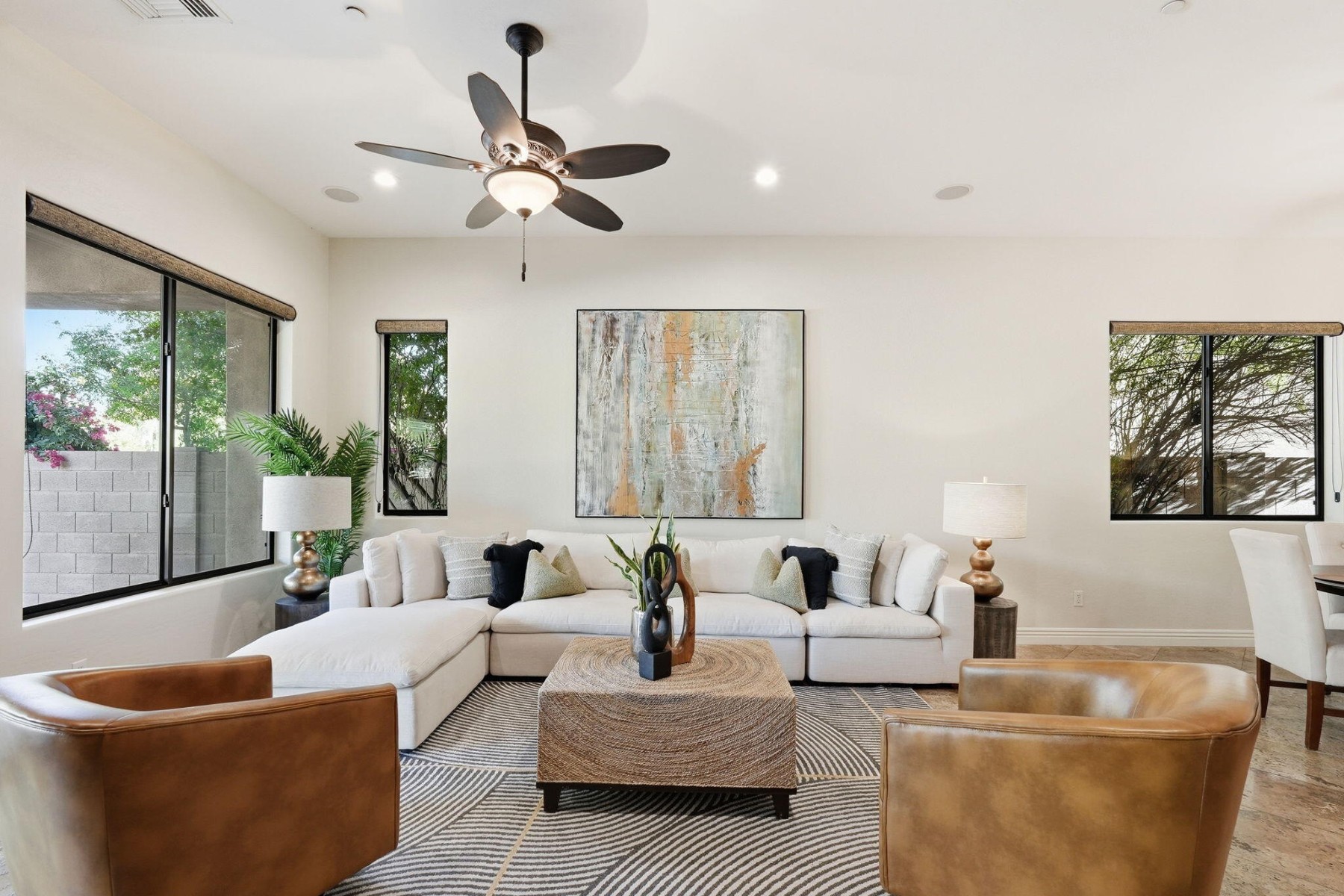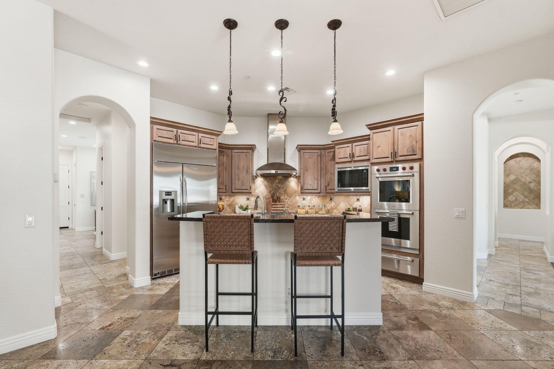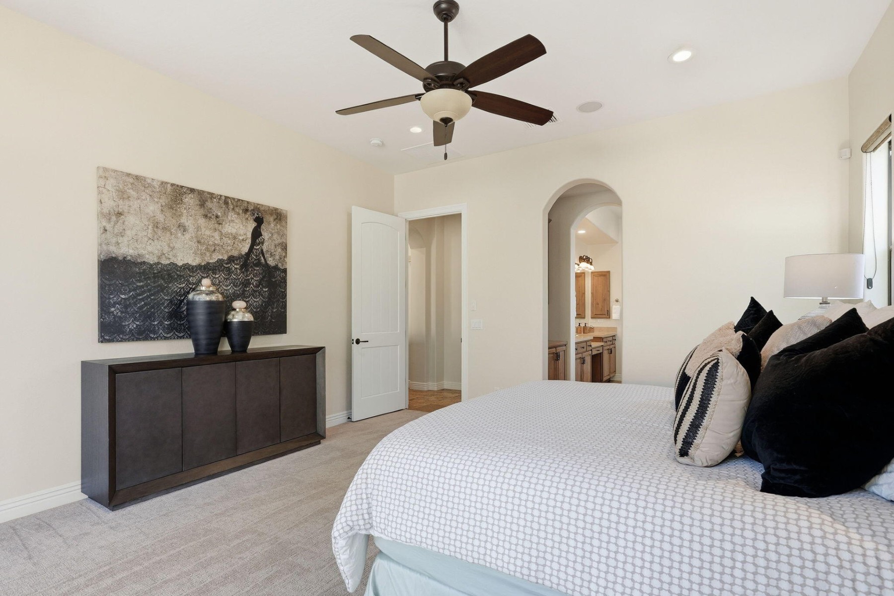 Located in the luxurious guard-gated community of Windgate Ranch, this single-level Toll Brothers home sits on a quiet cul-de-sac. The open floor plan features 4 bedrooms, 2.5 bathrooms, a spacious great room & split layout ideal for privacy & entertaining. Chef's kitchen offers a large island, breakfast bar, new Wolf gas cooktop/microwave/double ovens, Cove dishwasher, ample cabinetry, & a casual dining area that opens to the family room. The primary suite includes patio access, a spa-like bath with dual vanities, jetted tub, walk-in shower, & large walk-in closet. Newly carpeted bedrooms. Backyard features a covered patio & grassy area for outdoor living. Short walk to amenities including 3 resort-style pools, clubhouse, fitness center, tennis courts, pickleball, parks, & walking paths.