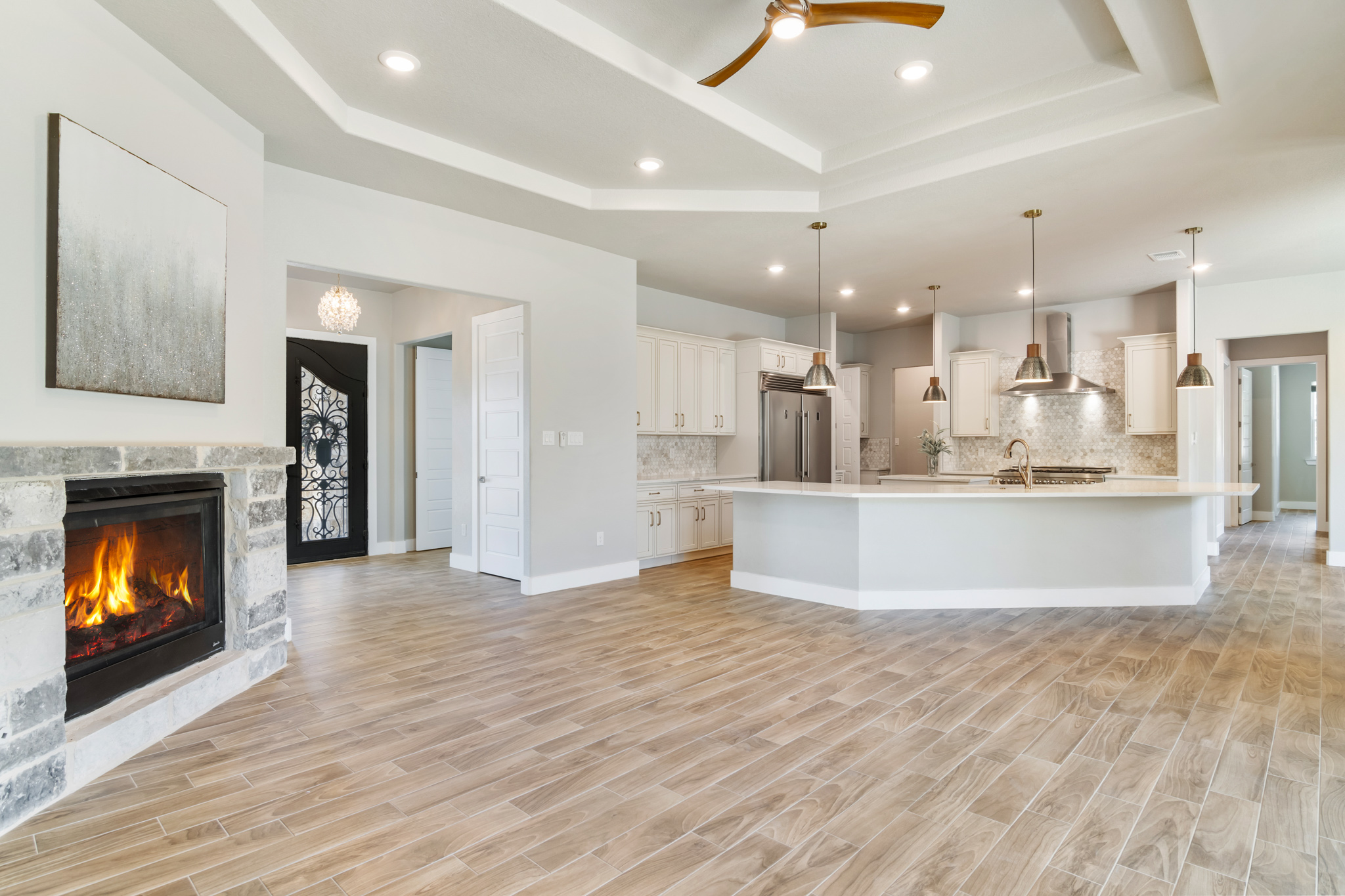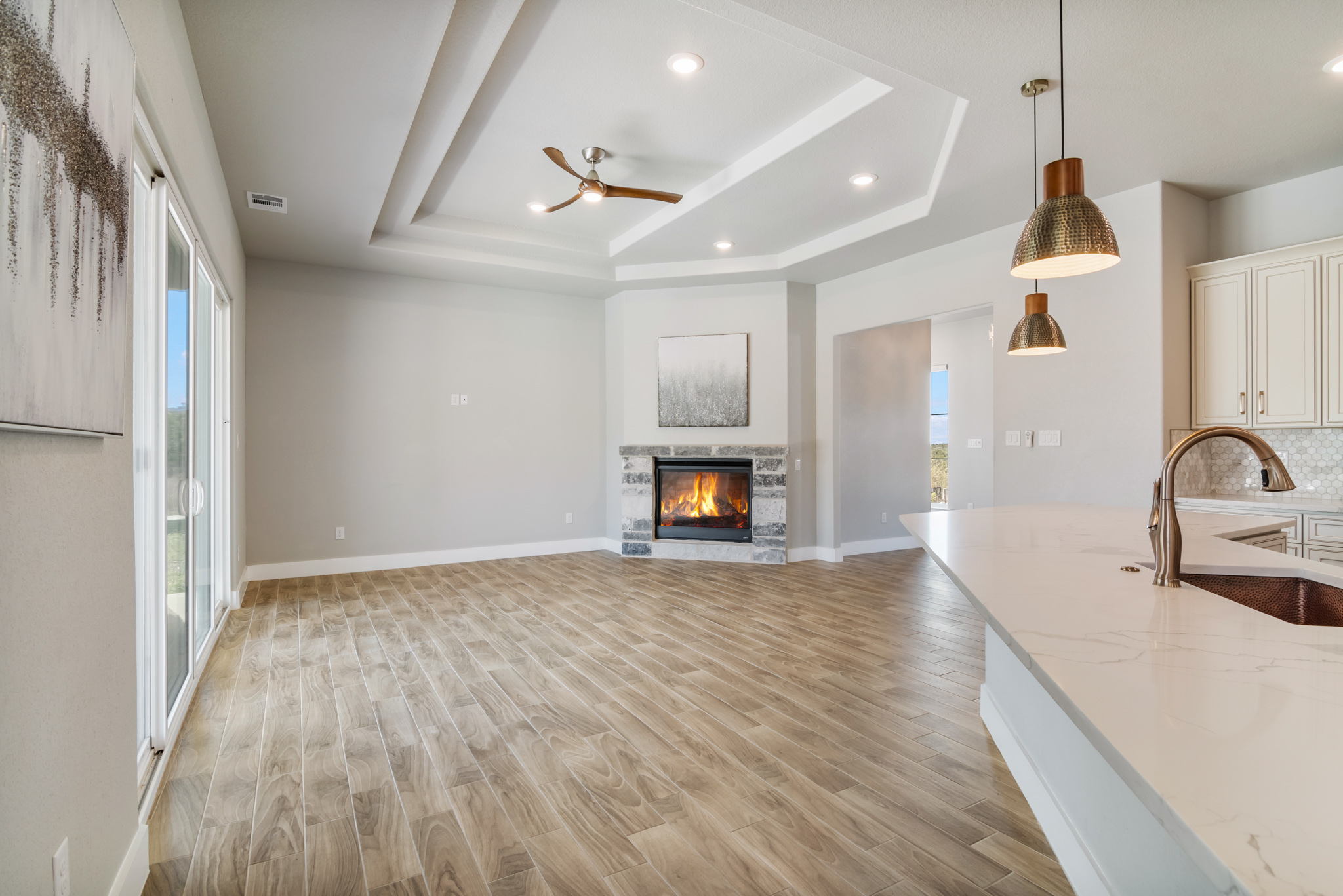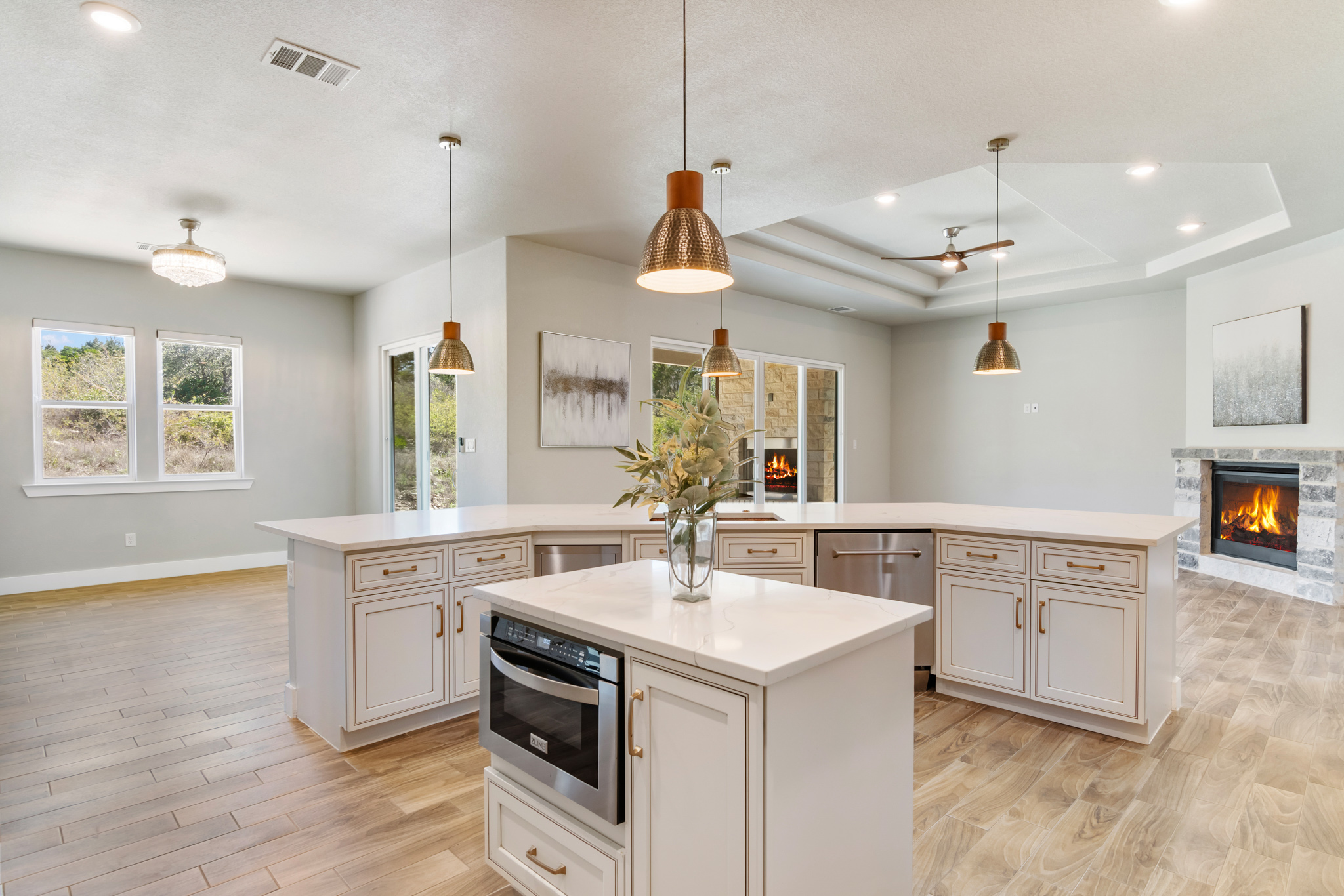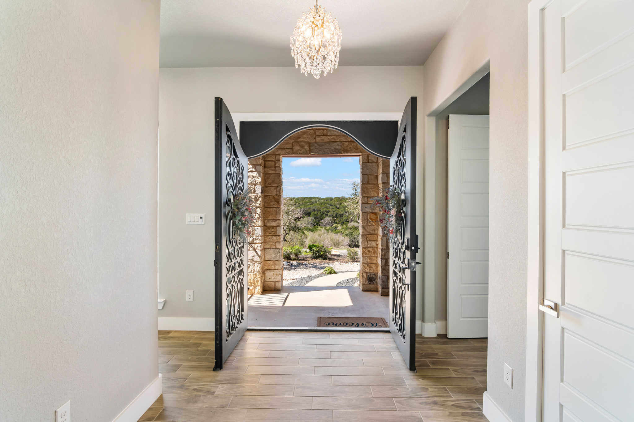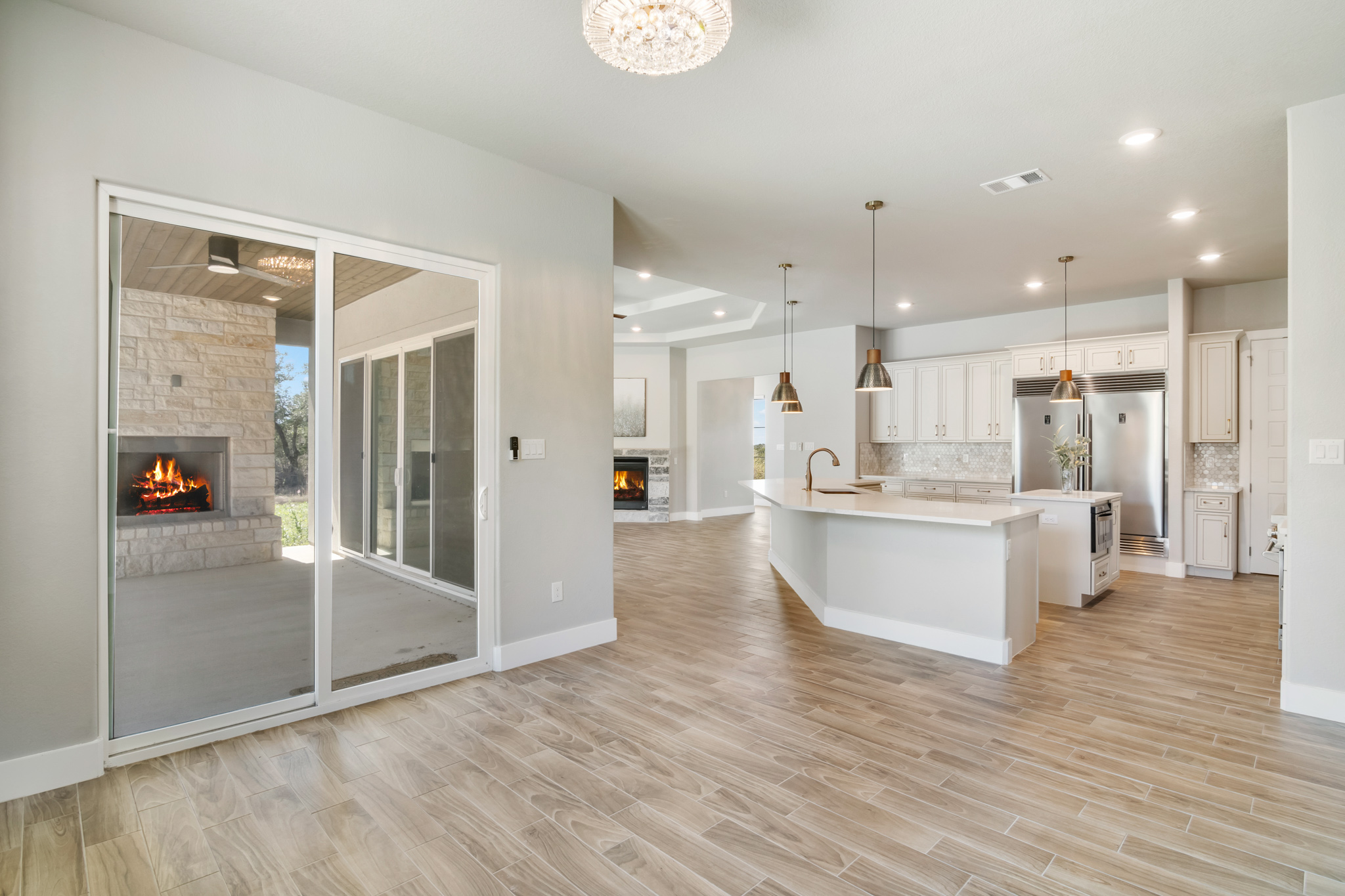 Set on 2 acres in Summit Ridge, this well appointed residence offers a balance of scale, comfort, and everyday livability just minutes from Medina Lake. A pillared entrance, circular drive, and all masonry stucco and stone exterior create a strong first impression, while the oversized side entry three car garage adds both function and presence. Inside, the floor plan is designed to accommodate both daily living and entertaining, with a dedicated study, media room, and thoughtfully arranged living spaces throughout. The kitchen is centered around an oversized quartz island with counter seating, complemented by professional grade appliances and an oversized side by side refrigerator. Wood look tile flooring carries through the main living areas, adding warmth and durability. The primary suite offers a private retreat with a tray ceiling, sitting area, and a spacious bath featuring a garden tub, separate vanities, separate shower, and walk in closets. Secondary spaces are equally well considered, including a game room with a beverage refrigerator and microwave. Outdoor living is just as inviting, with a covered patio, integrated speakers, and a floor to ceiling stacked stone fireplace overlooking the expansive homesite.