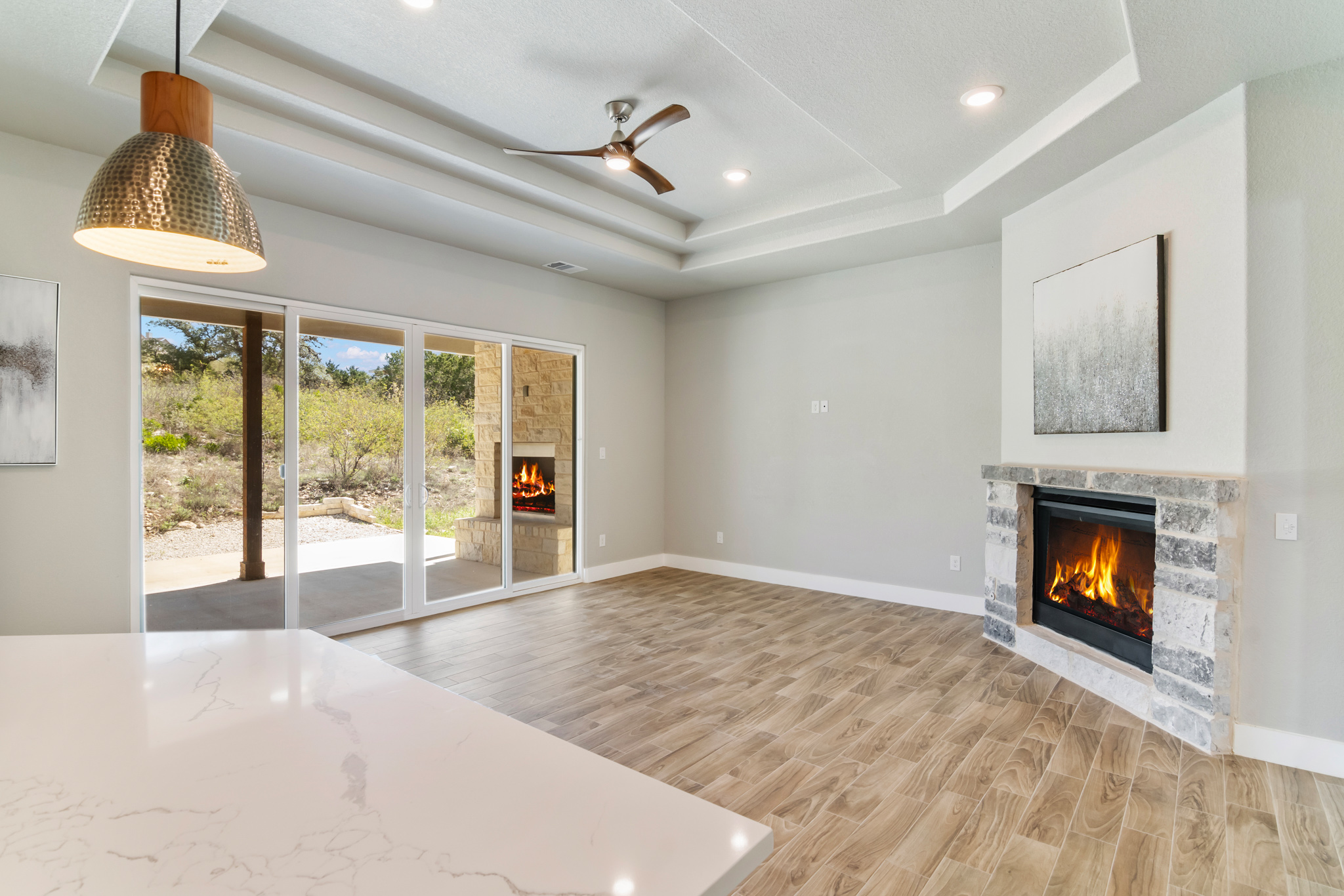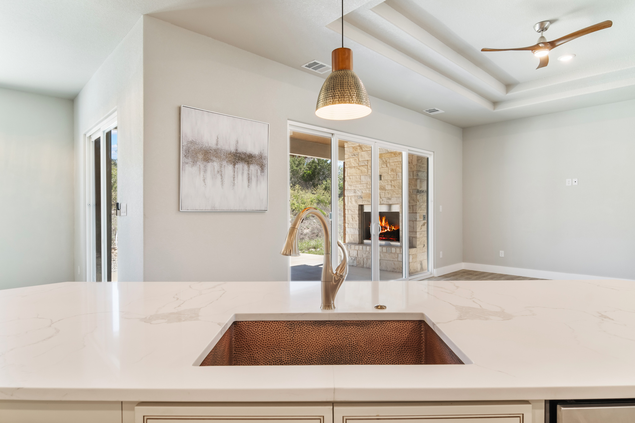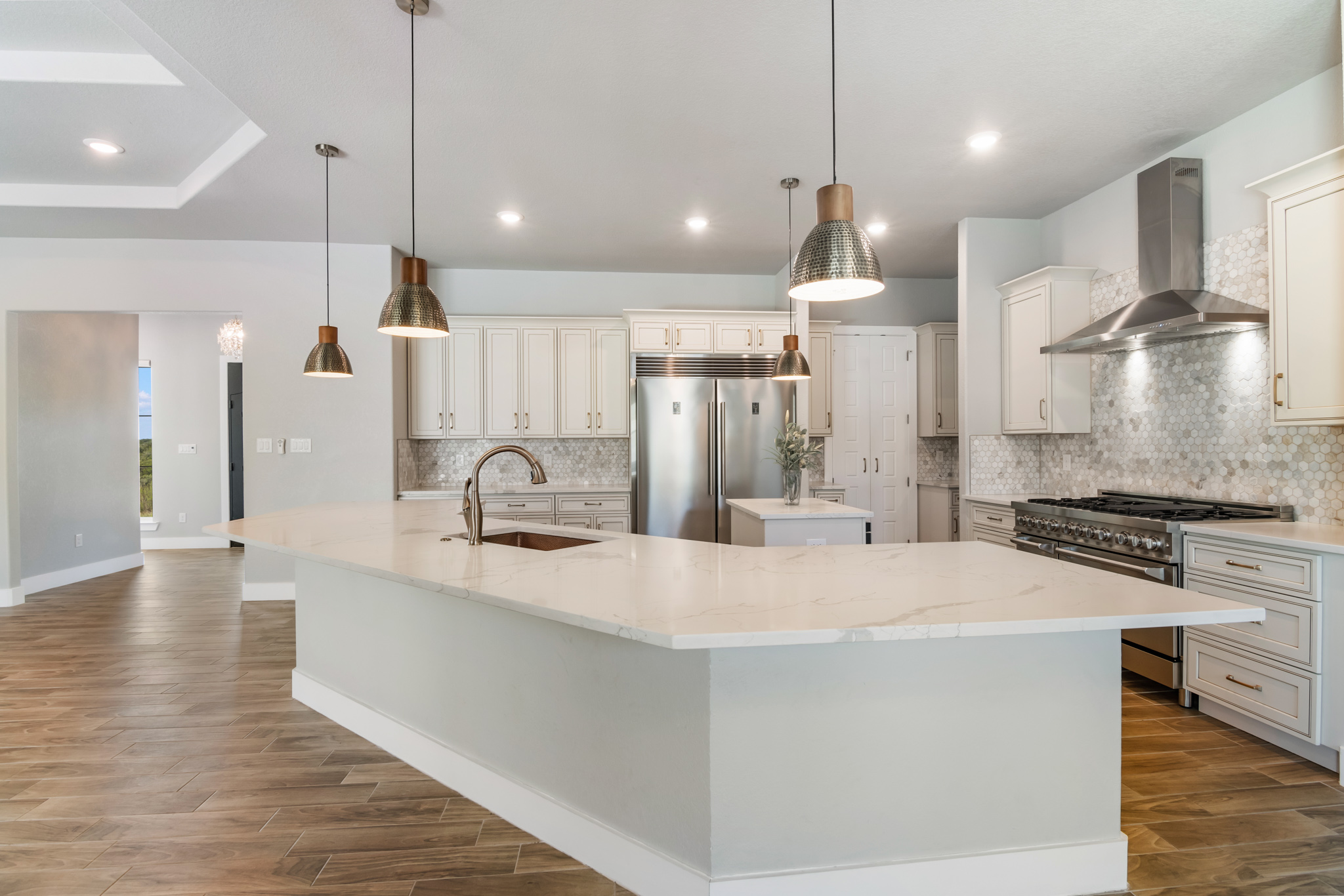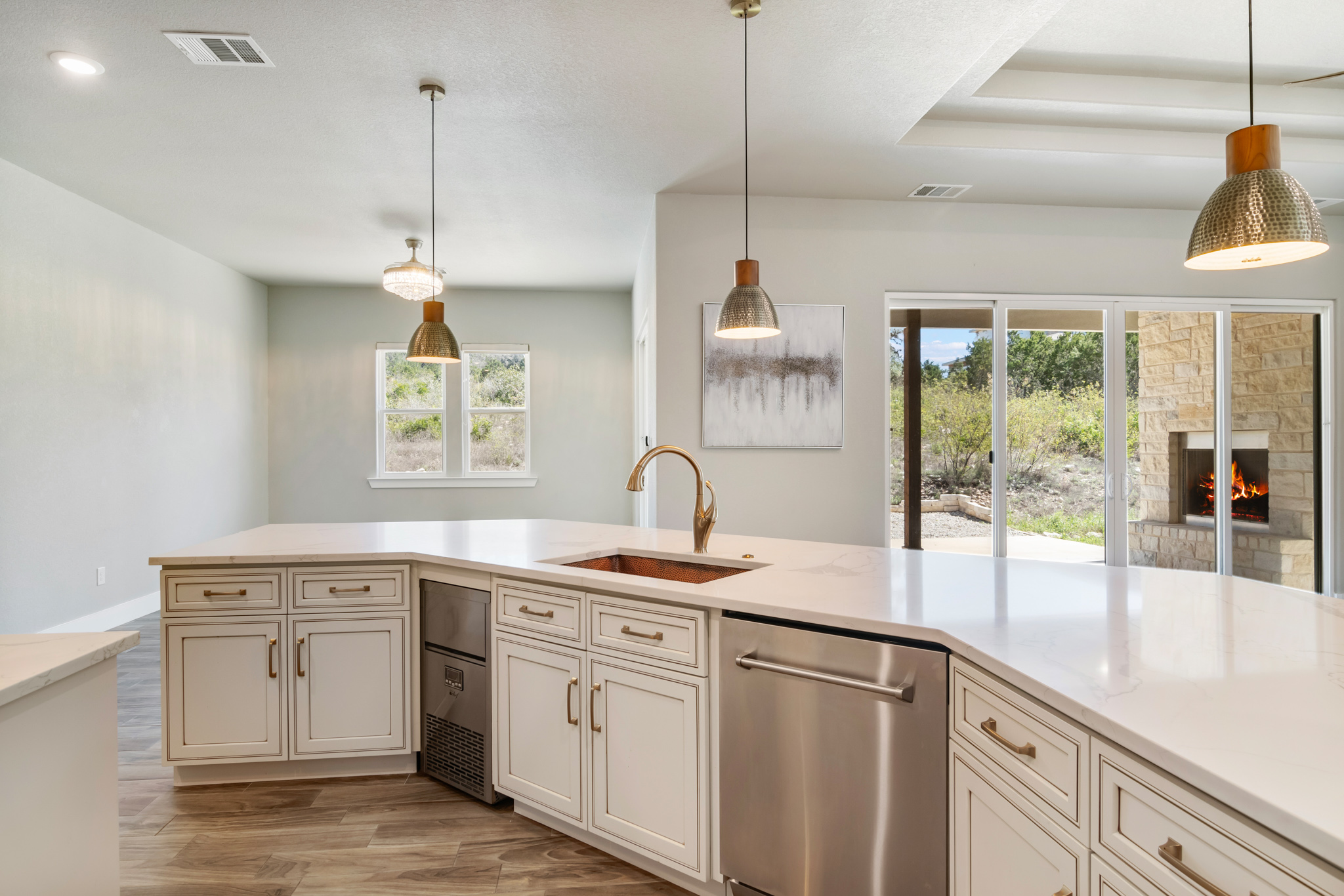 Set on 2 acres in Summit Ridge, this well appointed residence offers a balance of scale, comfort, and everyday livability just minutes from Medina Lake. A pillared entrance, circular drive, and all masonry stucco and stone exterior create a strong first impression, while the oversized side entry three car garage adds both function and presence. Inside, the floor plan is designed to accommodate both daily living and entertaining, with a dedicated study, media room, and thoughtfully arranged living spaces throughout. The kitchen is centered around an oversized quartz island with counter seating, complemented by professional grade appliances and an oversized side by side refrigerator. Wood look tile flooring carries through the main living areas, adding warmth and durability. The primary suite offers a private retreat with a tray ceiling, sitting area, and a spacious bath featuring a garden tub, separate vanities, separate shower, and walk in closets. Secondary spaces are equally well considered, including a game room with a beverage refrigerator and microwave. Outdoor living is just as inviting, with a covered patio, integrated speakers, and a floor to ceiling stacked stone fireplace overlooking the expansive homesite.