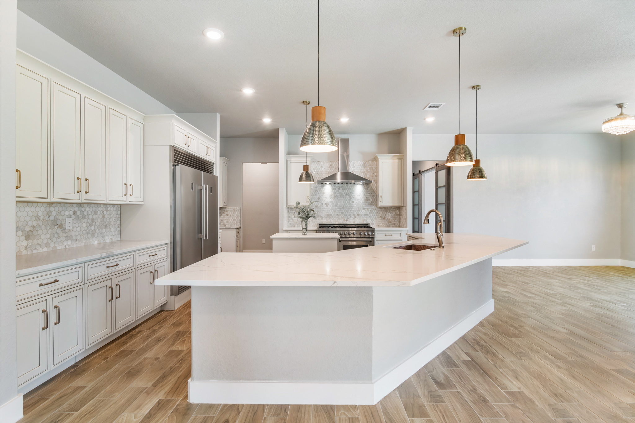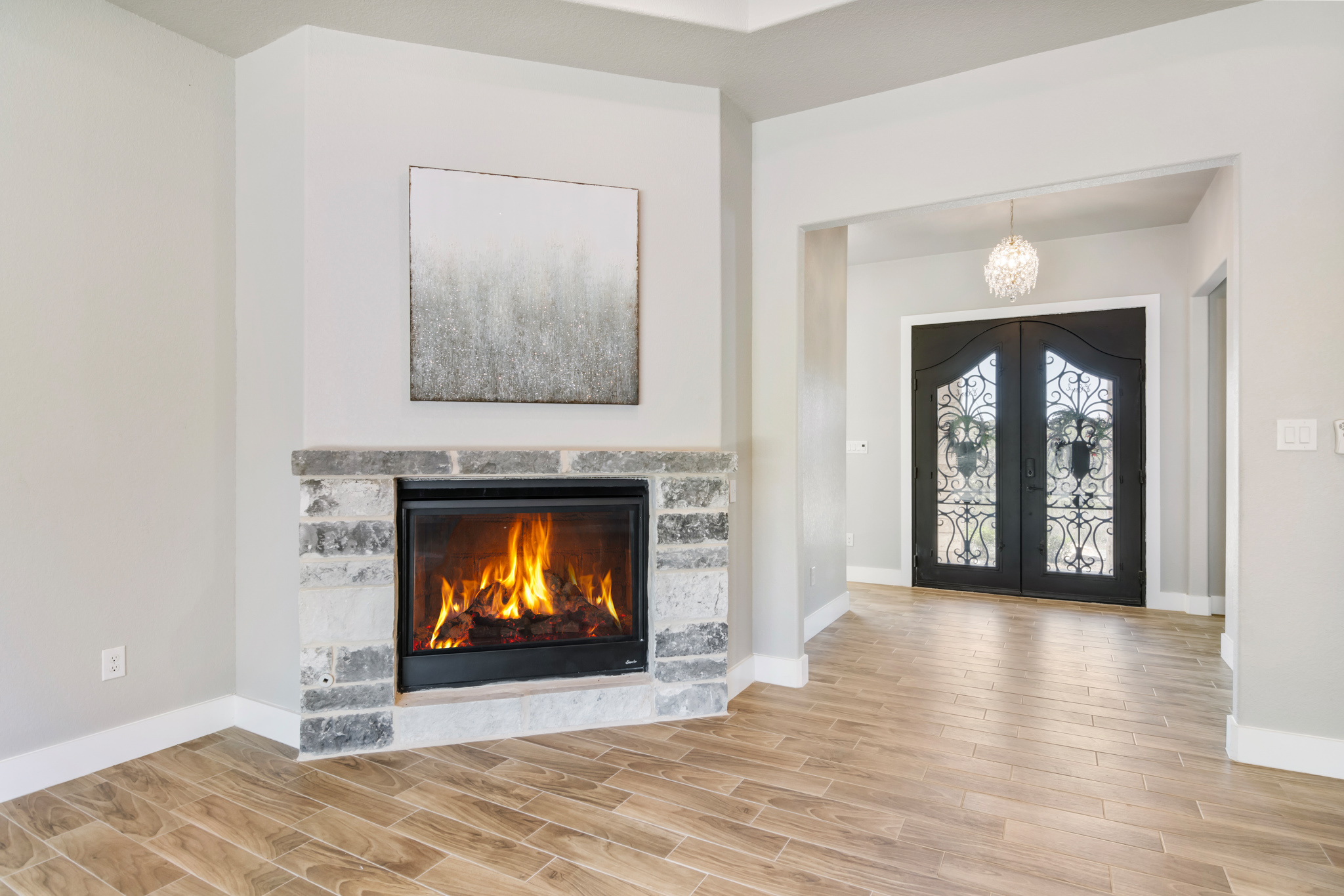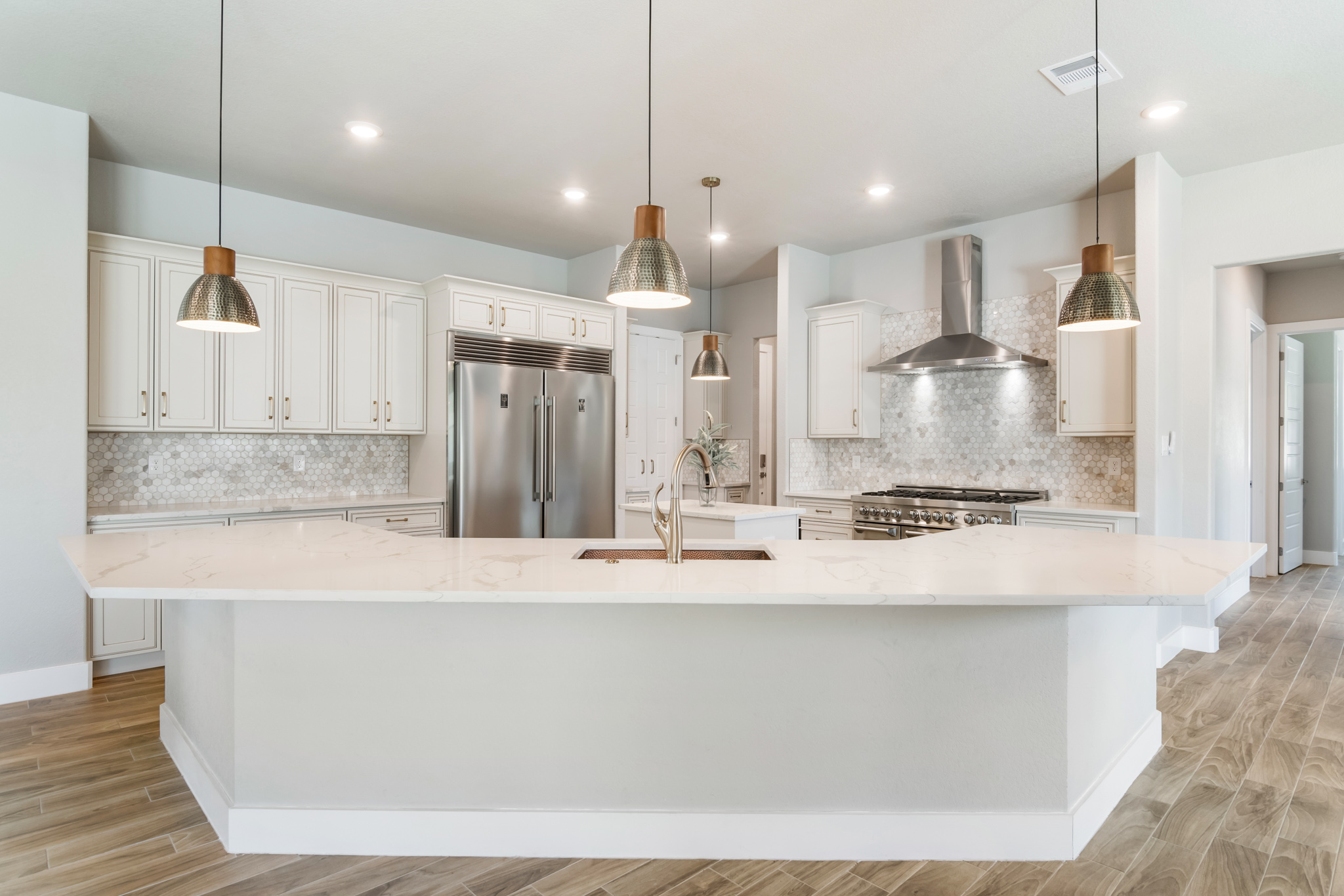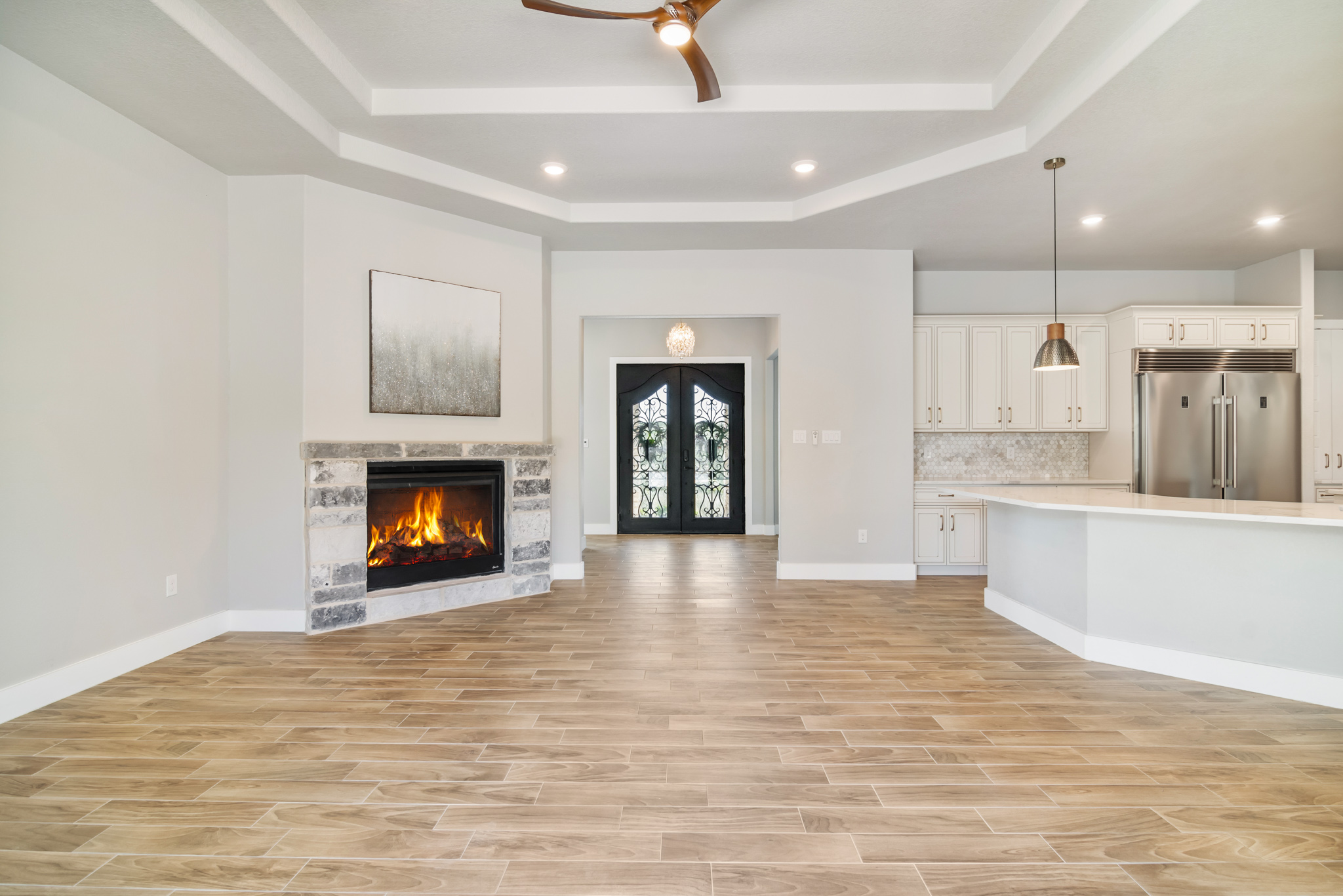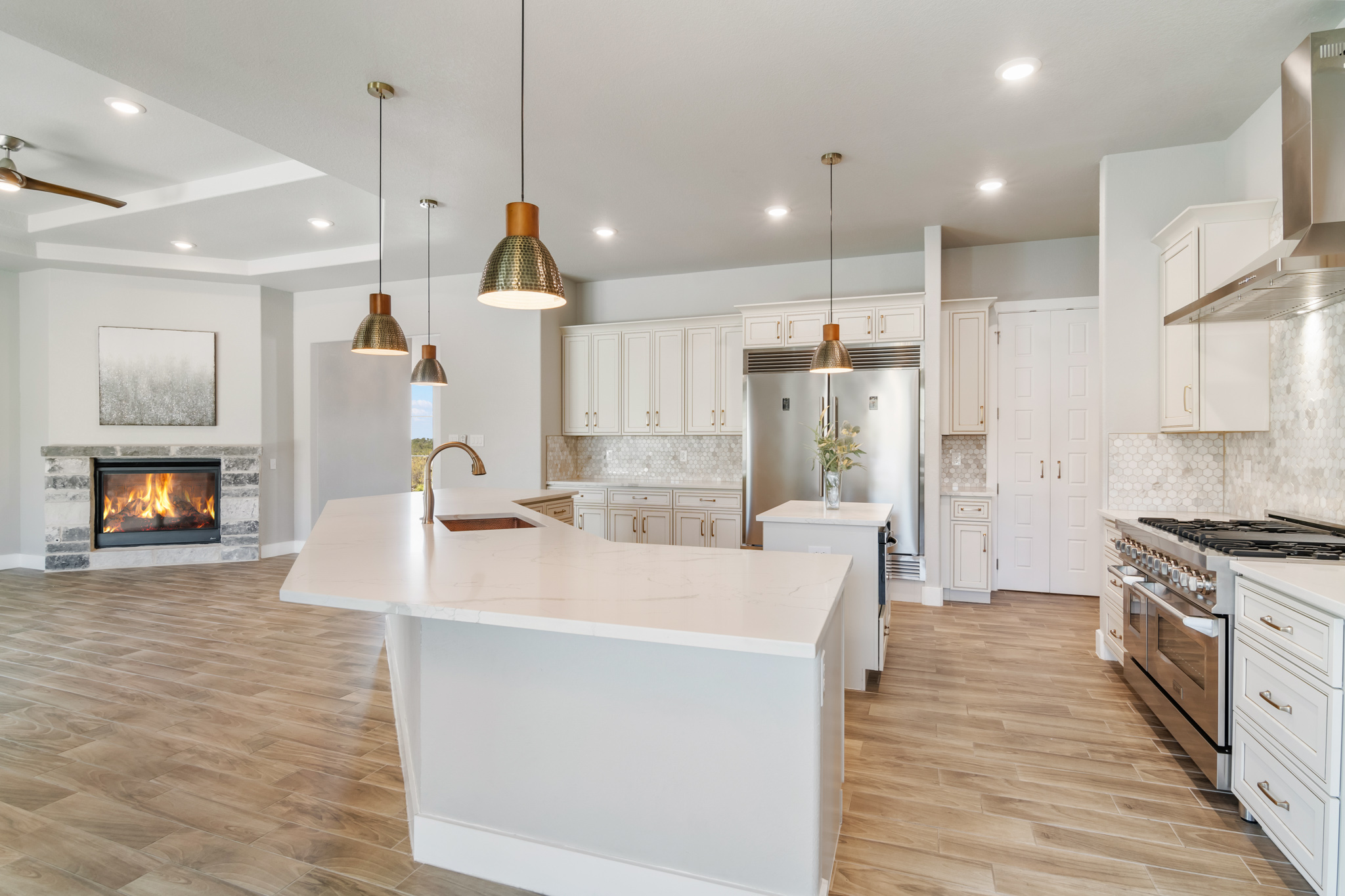 Set on 2 acres in Summit Ridge, this well appointed residence offers a balance of scale, comfort, and everyday livability just minutes from Medina Lake. A pillared entrance, circular drive, and all masonry stucco and stone exterior create a strong first impression, while the oversized side entry three car garage adds both function and presence. Inside, the floor plan is designed to accommodate both daily living and entertaining, with a dedicated study, media room, and thoughtfully arranged living spaces throughout. The kitchen is centered around an oversized quartz island with counter seating, complemented by professional grade appliances and an oversized side by side refrigerator. Wood look tile flooring carries through the main living areas, adding warmth and durability. The primary suite offers a private retreat with a tray ceiling, sitting area, and a spacious bath featuring a garden tub, separate vanities, separate shower, and walk in closets. Secondary spaces are equally well considered, including a game room with a beverage refrigerator and microwave. Outdoor living is just as inviting, with a covered patio, integrated speakers, and a floor to ceiling stacked stone fireplace overlooking the expansive homesite.