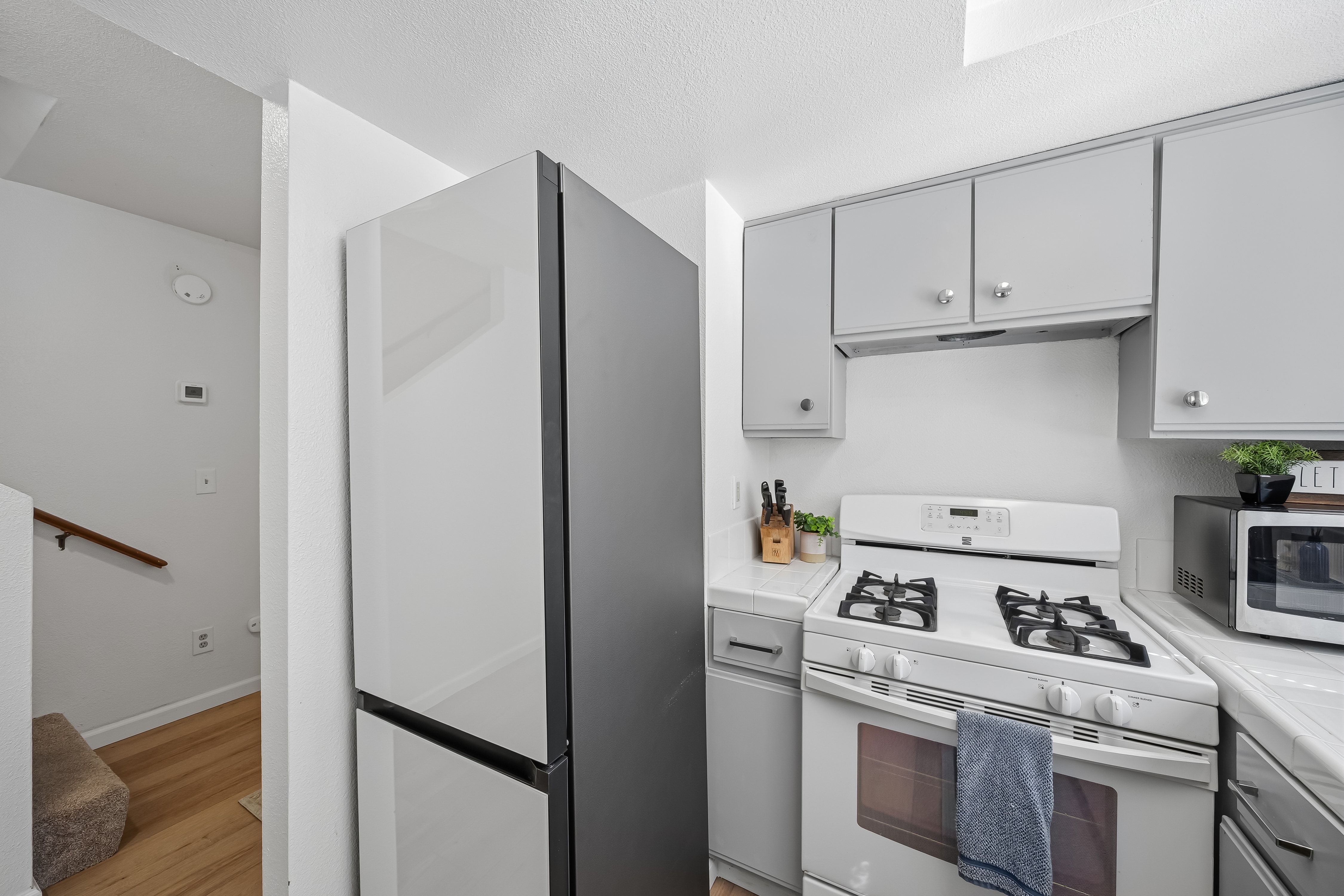 Lowest-priced market-rate two-bedroom condo in San Luis Obispo. Set against the idyllic backdrop of the South Hills, this residence is located in the cozy enclave of Rockview Heights, a 20-unit condominium community conveniently situated near local eateries, parks, hiking trails, and the vibrant downtown of San Luis Obispo. This move-in-ready home features an open floor plan with over 900 square feet of living space, two spacious bedrooms, and one full bathroom. As you enter, you’re welcomed by newly installed luxury vinyl plank flooring and an abundance of natural light. Open to the comfortable living room and dining area, the kitchen features recently painted cabinetry with polished nickel pulls, a gas range, refrigerator, spring-coil pull-down faucet, a sunny window over the sink, tile countertops, and a breakfast bar. Situated adjacent to the full bathroom—appointed with a quartz countertop and updated fixtures—the primary bedroom offers an oversized closet and a balcony with peaceful views, while the secondary bedroom enjoys serene vistas of the surrounding open space and natural beauty. The private rear patio is ideal for weekend BBQs or simply unwinding at the end of the day. Additional highlights include window coverings, a large under-stair closet, a detached exterior storage closet, and an available bike locker. With only two units per building, these duplex-style condos offer just one shared wall. This is a wonderful opportunity to invest in one of San Luis Obispo’s most convenient locations.
