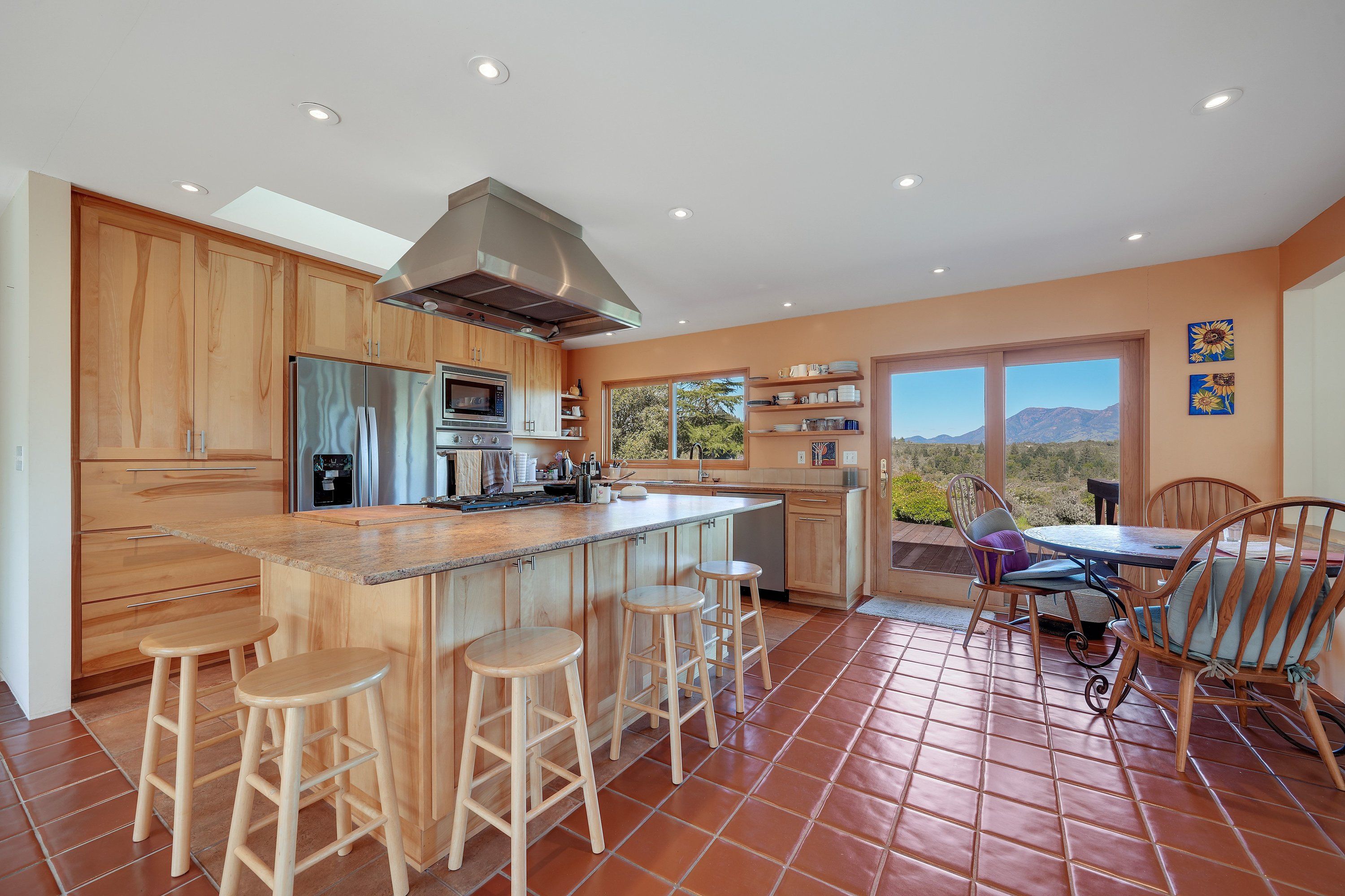 The three-bedroom, two-bath residence is oriented to capture sweeping views of Mount St. Helena, with the landscape unfolding dramatically beyond the home’s main living spaces. A generous family room with vaulted ceilings creates an airy gathering place where large windows frame the mountain backdrop, while the open-concept kitchen connects seamlessly to the living areas, enhancing both the sense of space and the home’s natural flow.