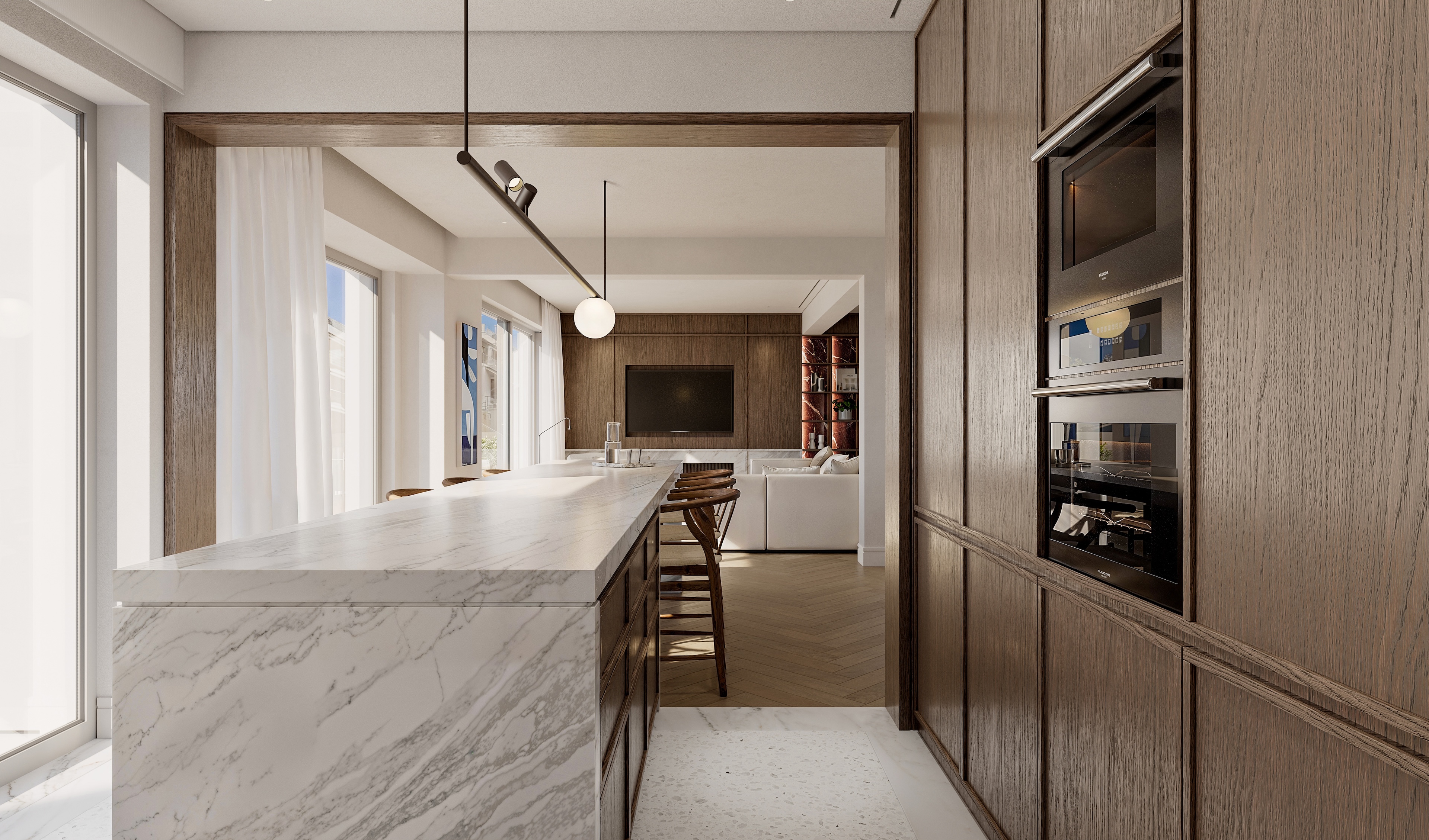 The open-plan living and dining area flows naturally into a sleek, modern kitchen, creating an inviting setting for both everyday living and entertaining. Expansive floor-to-ceiling windows fill the interiors with natural light and open onto a spacious balcony, where Lycabettus Hill provides a striking and unmistakably Athenian backdrop.
