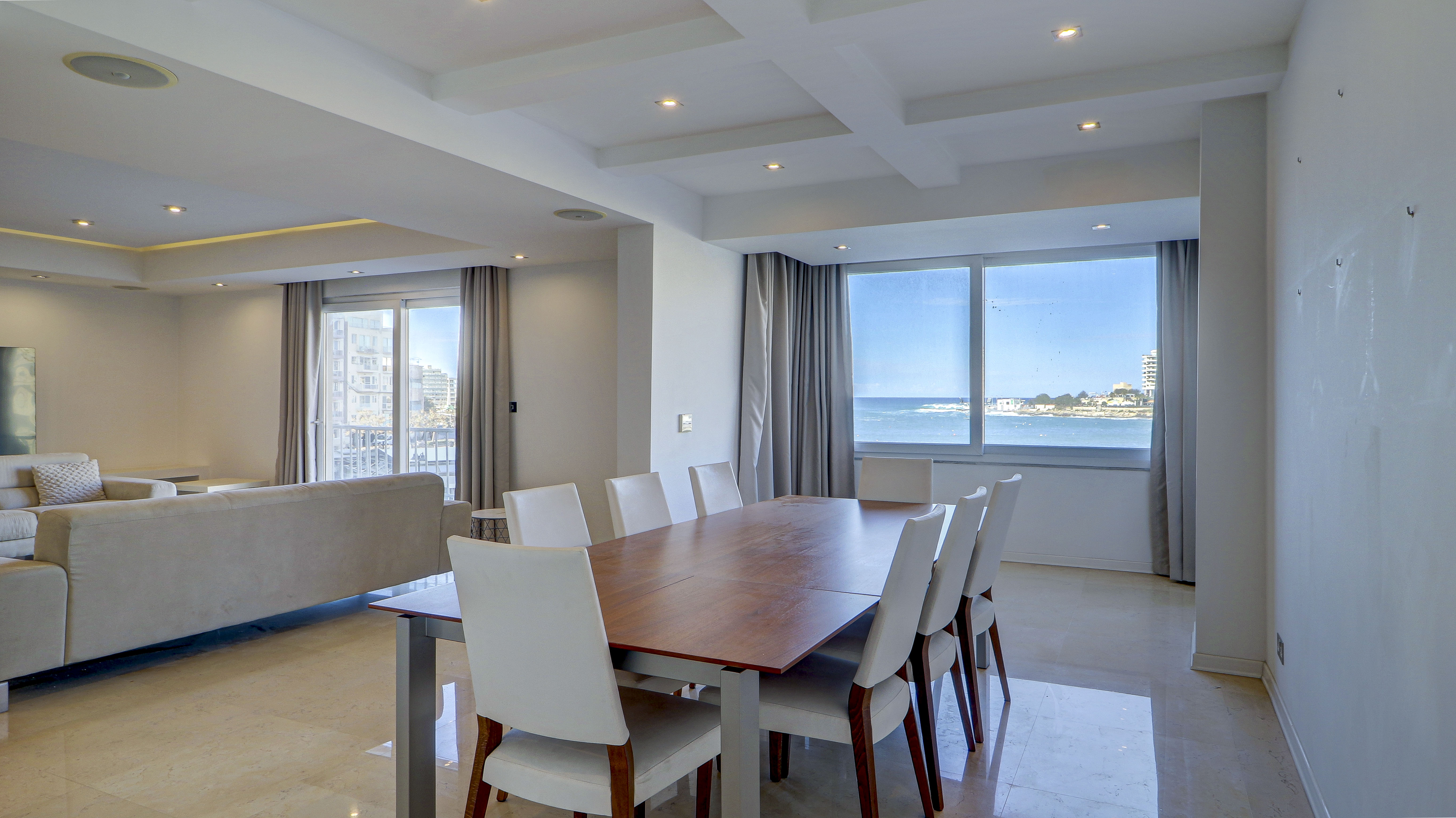This expansive 190 m-- property in St. Julian's offers a rare blend of classic luxury and prime seafront living. The interior is defined by elegant pink marble flooring and a spacious, fully air-conditioned layout. Upon entering, you are greeted by a hall featuring a unique split-level design. The living quarters are designed for high-end entertaining, centred around a large, high-standard kitchen and a formal dining room equipped with a table for eight. A bright sitting room with two sofas provides a comfortable retreat, while the highlight of the home is the stunning seafront balcony that wraps around the front of the block, offering unobstructed coastal views. The sleeping arrangements are both generous and flexible, comprising two double bedrooms, a single bedroom currently housing two beds, and an additional empty room that can be easily converted into a fourth single bedroom or a home office. Storage is well-catered for with a dedicated walk-in wardrobe in the master suite and a separate box room. Functionality is key, with three shower rooms including one en-suite and one large family shower as well as a separate guest WC. The property also includes a small secondary balcony for the AC units and a drying area. Located in a building serviced by a lift, this residence is a perfect match for those seeking space and prestige in Malta---s most vibrant district.