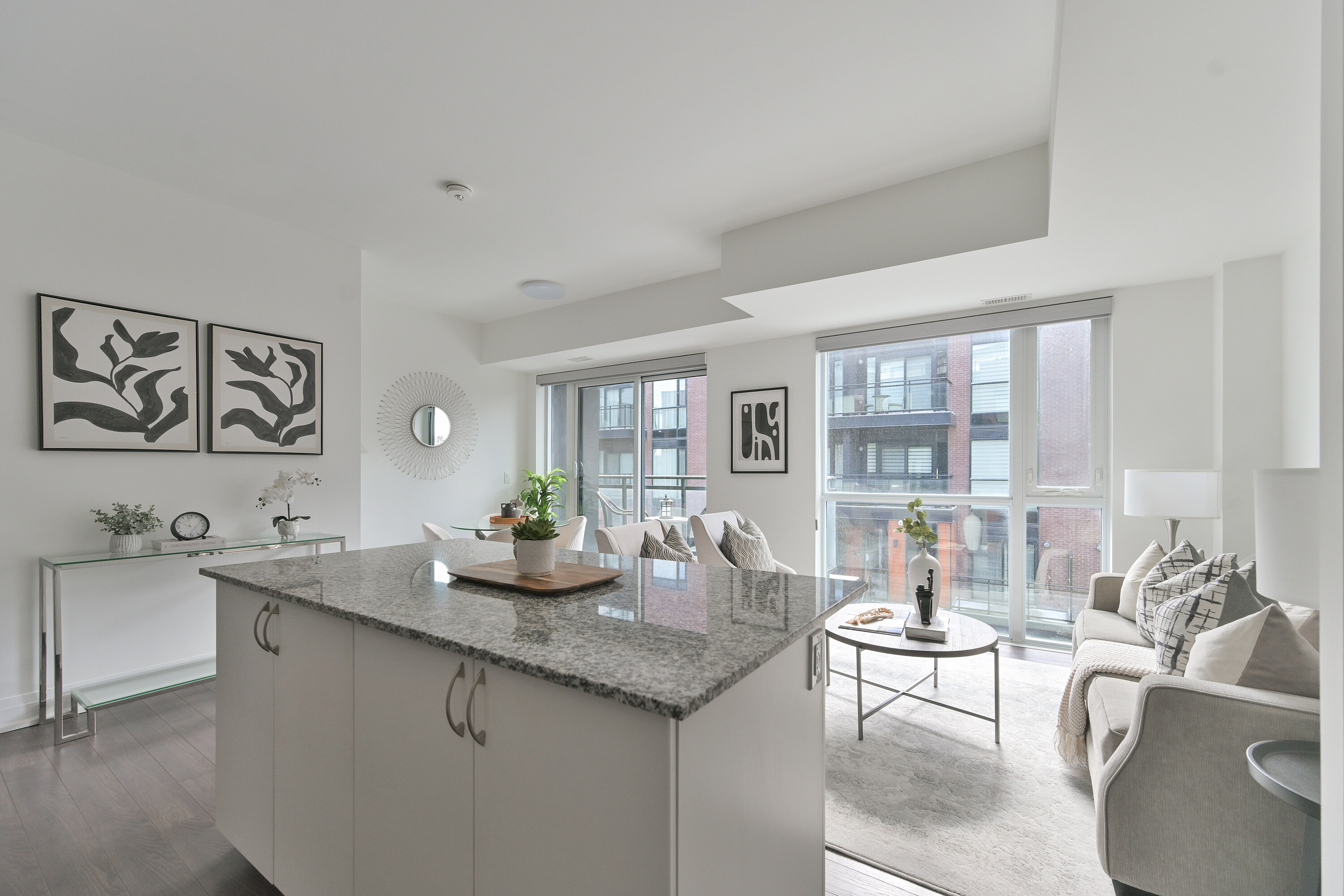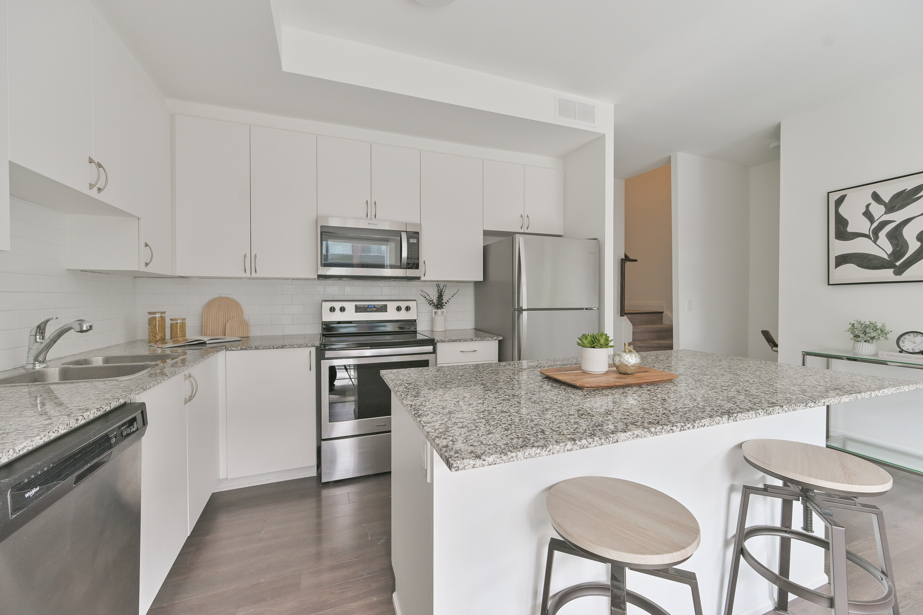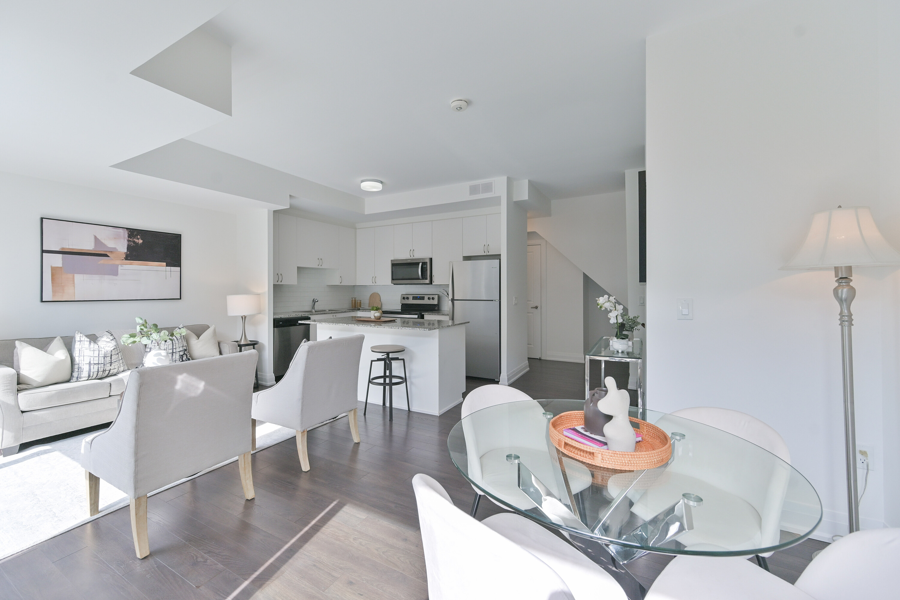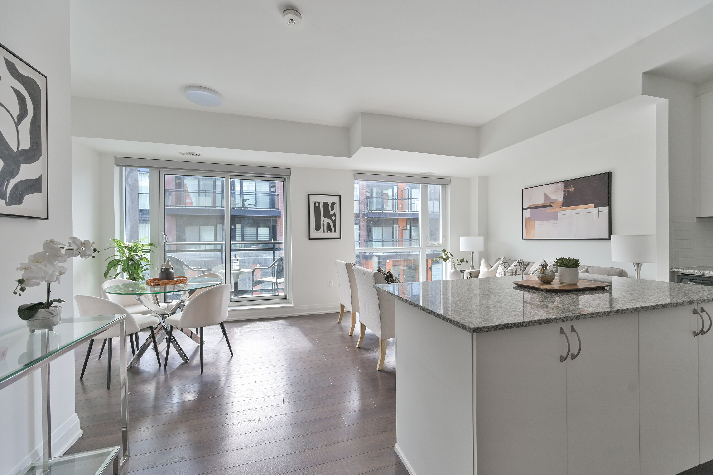 A rare opportunity to own a newly built stacked condominium townhome featuring exceptional outdoor space, including two private balconies and a spectacular rooftop terrace with nearly 400 square feet of combined outdoor living. With outdoor access from every level, this thoughtfully designed residence blends indoor comfort with effortless outdoor living. The south-facing exposure and floor-to-ceiling windows fill the home with natural light, creating a bright and welcoming atmosphere throughout. The main level features an open-concept kitchen, living and dining area ideal for both everyday living and entertaining. The kitchen is equipped with granite countertops, a subway tile backsplash, centre island, and ample cabinetry, while a walkout to the balcony extends the living space outdoors. Laminate flooring and smooth ceilings run throughout, complemented by Hunter Douglas motorized blinds. A convenient two piece powder room with ensuite laundry completes the main level. Upstairs, two generously sized bedrooms offer excellent privacy, each with access to their own bathroom. The primary bedroom features a walk-in closet and a private four-piece ensuite. The second bedroom offers a private balcony and is conveniently located beside the three-piece hallway bathroom. The expansive south-facing rooftop terrace offers 271 square feet of private outdoor space, perfect for outdoor dining, entertaining, or lounging in the sun. Additional highlights include two tandem parking spaces and an oversized storage locker. Ideally located minutes from Vaughan Metropolitan Centre, an emerging urban hub with restaurants, retail, parks, and public spaces. Enjoy excellent connectivity with quick access to Highway 400, Highway 407, and Highway 427, TTC subway access at Vaughan Metropolitan Centre, and rapid bus transit along Highway 7.