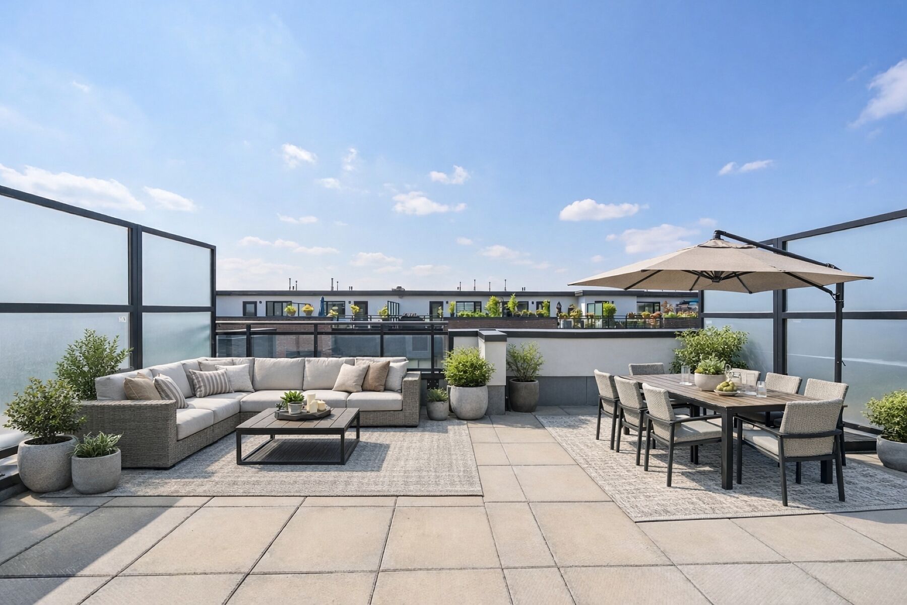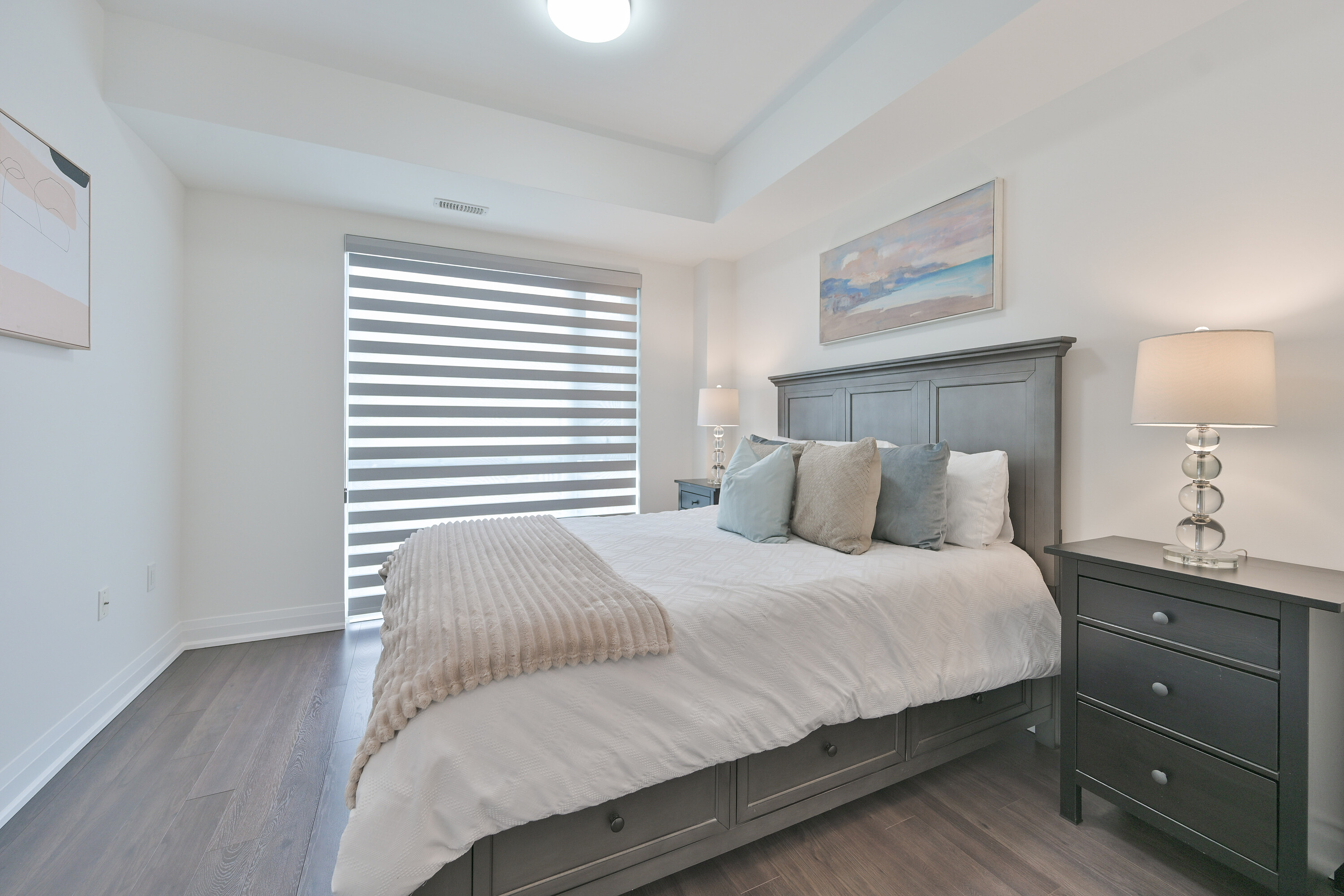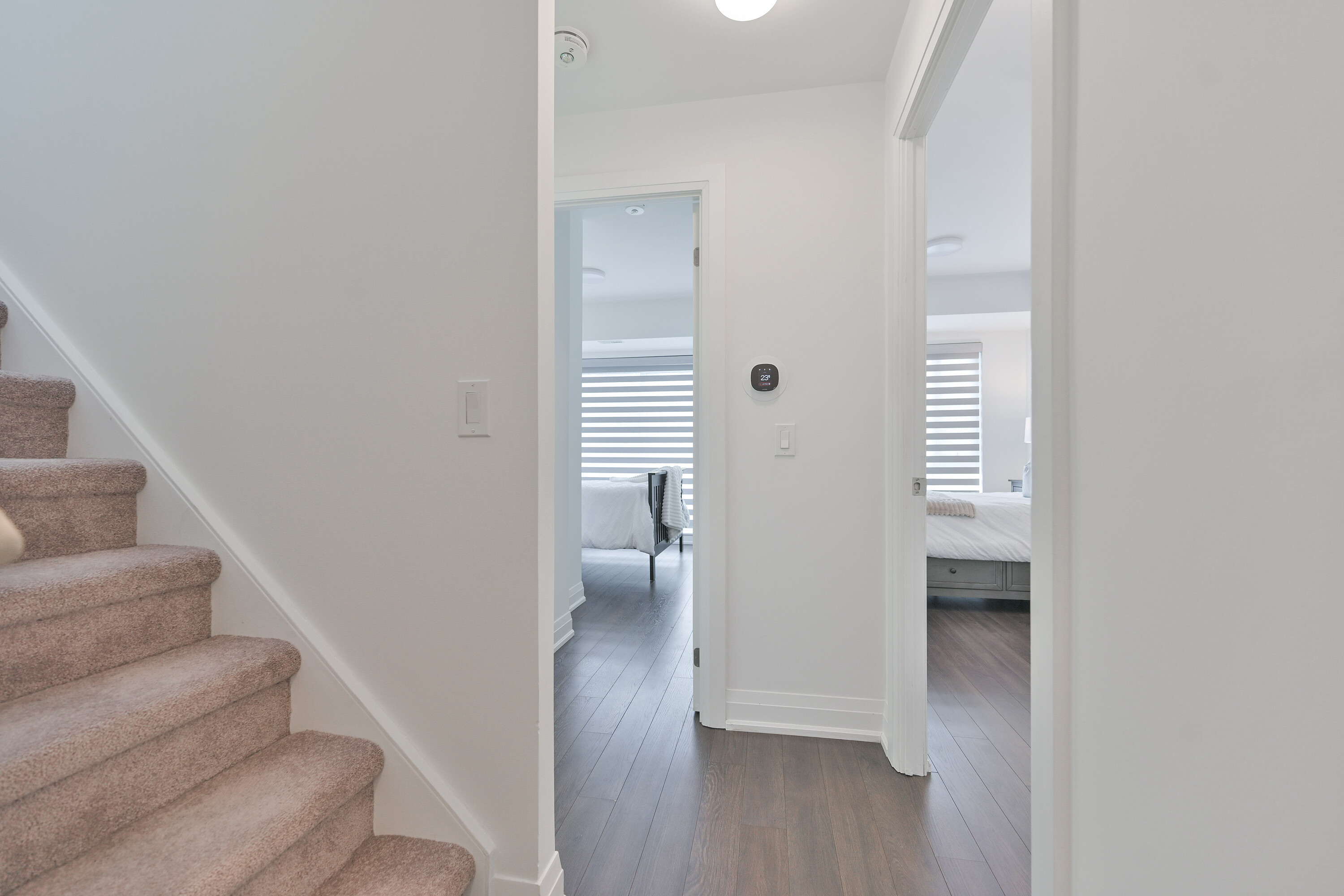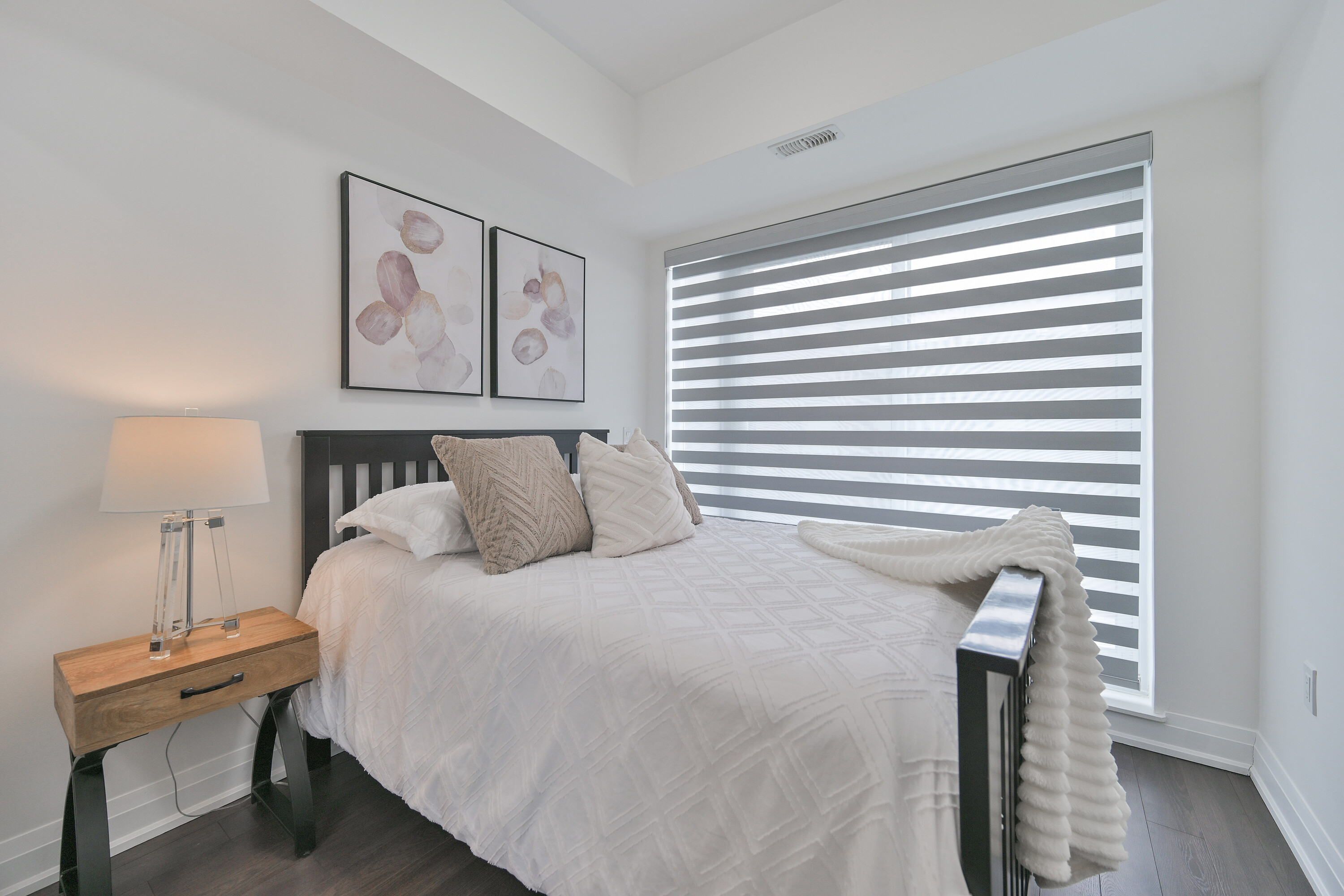 A rare opportunity to own a newly built stacked condominium townhome featuring exceptional outdoor space, including two private balconies and a spectacular rooftop terrace with nearly 400 square feet of combined outdoor living. With outdoor access from every level, this thoughtfully designed residence blends indoor comfort with effortless outdoor living. The south-facing exposure and floor-to-ceiling windows fill the home with natural light, creating a bright and welcoming atmosphere throughout. The main level features an open-concept kitchen, living and dining area ideal for both everyday living and entertaining. The kitchen is equipped with granite countertops, a subway tile backsplash, centre island, and ample cabinetry, while a walkout to the balcony extends the living space outdoors. Laminate flooring and smooth ceilings run throughout, complemented by Hunter Douglas motorized blinds. A convenient two piece powder room with ensuite laundry completes the main level. Upstairs, two generously sized bedrooms offer excellent privacy, each with access to their own bathroom. The primary bedroom features a walk-in closet and a private four-piece ensuite. The second bedroom offers a private balcony and is conveniently located beside the three-piece hallway bathroom. The expansive south-facing rooftop terrace offers 271 square feet of private outdoor space, perfect for outdoor dining, entertaining, or lounging in the sun. Additional highlights include two tandem parking spaces and an oversized storage locker. Ideally located minutes from Vaughan Metropolitan Centre, an emerging urban hub with restaurants, retail, parks, and public spaces. Enjoy excellent connectivity with quick access to Highway 400, Highway 407, and Highway 427, TTC subway access at Vaughan Metropolitan Centre, and rapid bus transit along Highway 7.