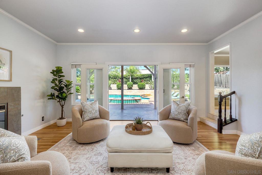 Ideally located in Poway, this 4-Bedroom, 3.5-Bath home sits on a 10,531 sq. ft. lot and offers an incredible opportunity to enjoy one of the area's most sought-after neighborhoods. Across the street from top-rated Poway schools, near the Poway Rodeo Grounds, Old Poway Park, weekly farmer's market and miles of scenic walking and horse trails, the location perfectly captures the outdoor lifestyle Poway is known for. The home features a main-level bedroom with en-suite bathroom and its own private entrance and separate climate control, offering flexible living options for multi-generational households or extended family and guests. Upstairs you will find two more guest bedrooms, a guest bathroom and the primary bedroom suite featuring a private deck, large walk-in closet and vaulted ceilings. The spacious floor plan offers comfortable living areas filled with natural light and vaulted ceilings. The 35-owned solar panels provide excellent energy efficiency in addition to the updated dual-paned windows throughout. The backyard is designed for enjoying Southern California living with a pool and spa, expansive patio space, built-in BBQ, turf with putting green and mature landscaping. Two sheds allow for extra storage. With great curb appeal, a two-car garage with epoxy flooring and storage, large driveway and a prime location near parks, schools, and trails, this Poway property offers space, flexibility and an exceptional setting to call home.