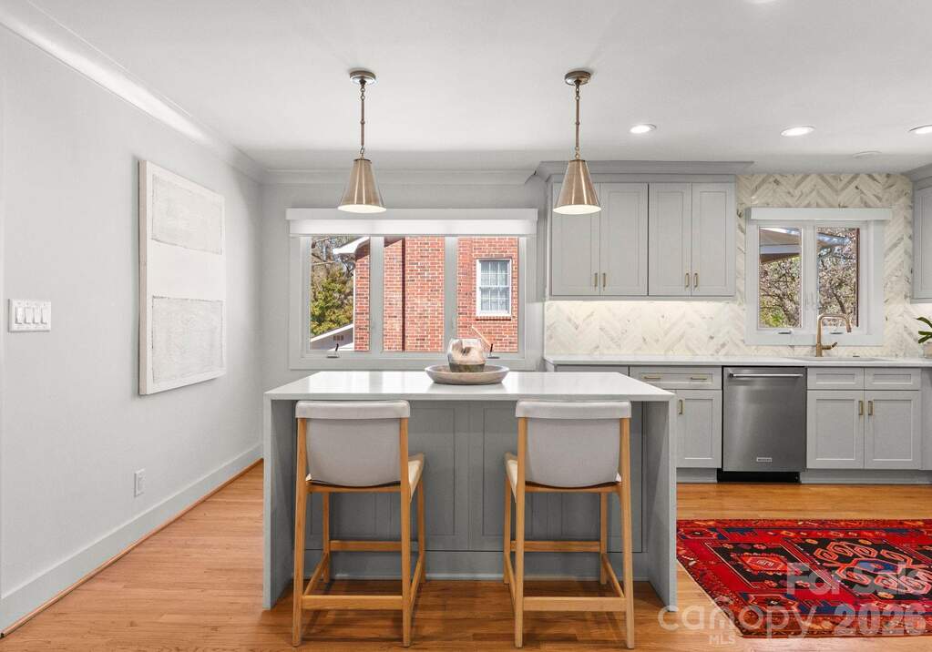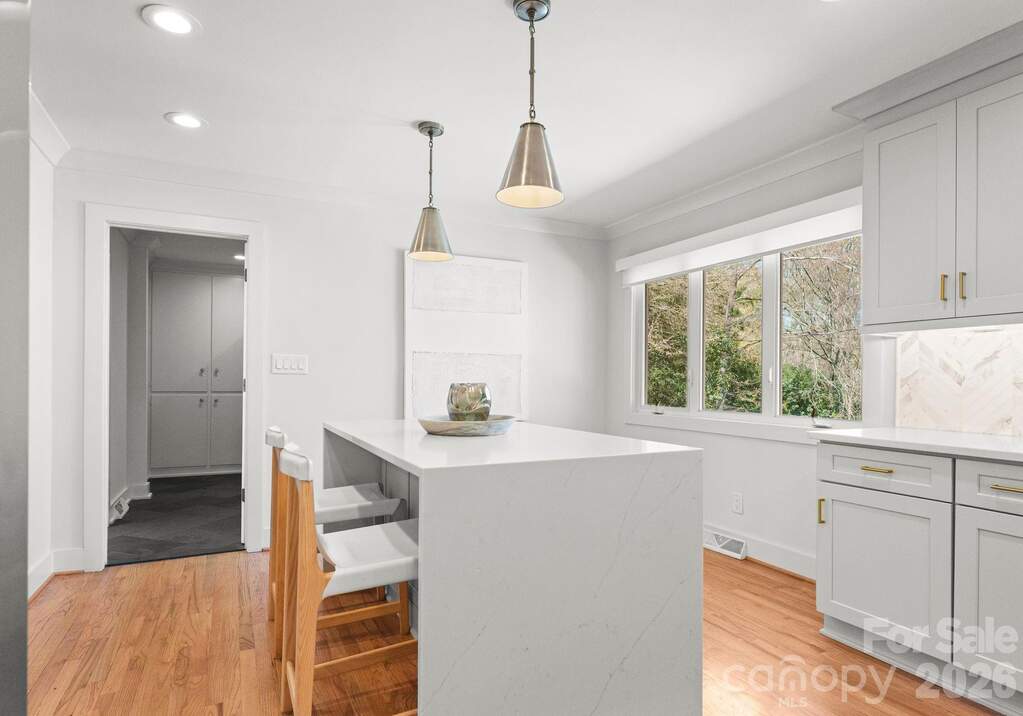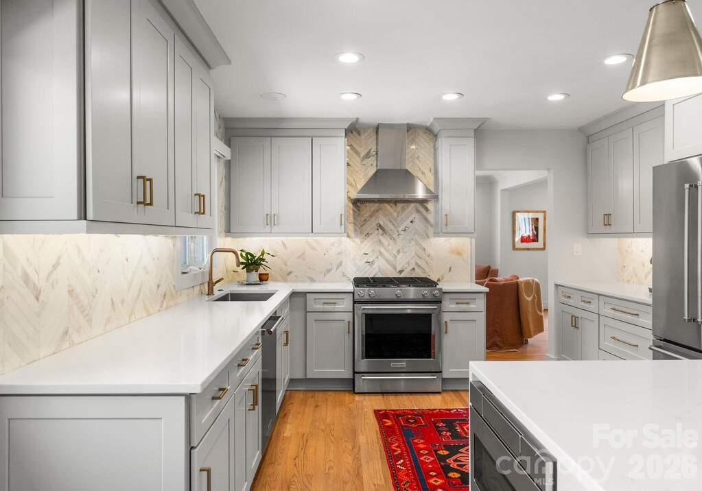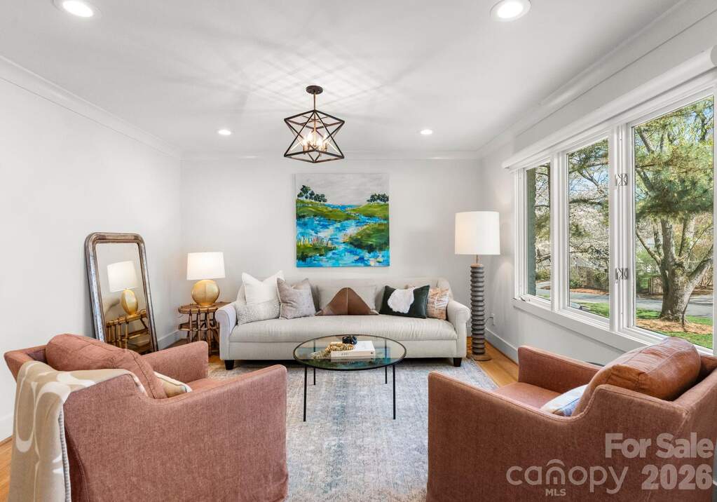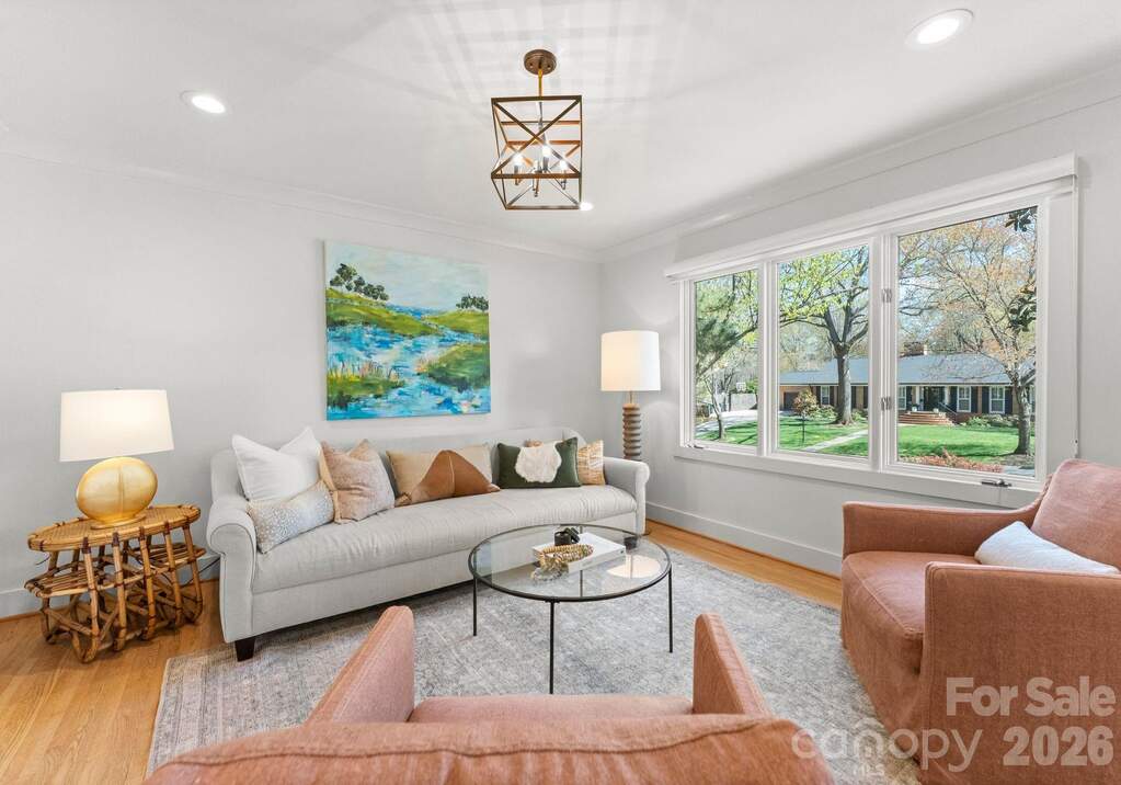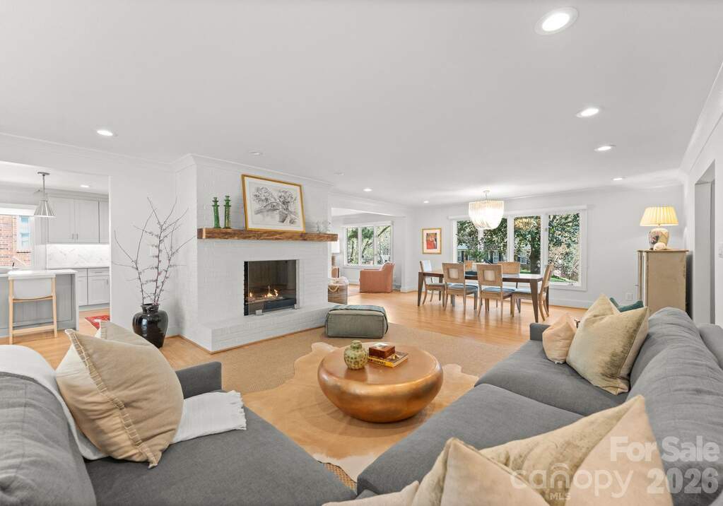 Architecturally reimagined in 2019, this exquisitely updated ranch-style home in Charlotte's desirable Mountainbrook neighborhood offers just under 3,000 square feet of style and functionality in the open-concept layout. Natural hardwoods newly installed in bedrooms and hallway and refinished floors in main living areas, add to the charm of this 4 bedroom 2.5 bath home in the heart of SouthPark. Interior features include coved crown molding, solid core doors, designer lighting, and a custom gas fireplace with a mantel crafted from a poplar tree sourced from the historic Duke Mansion property. Renovated kitchen with custom cabinetry, quartz countertops, waterfall-edge island, marble herringbone backsplash, and KitchenAid stainless steel appliance suite with professional gas range. The luxury primary suite features a spa-inspired bathroom with freestanding soaking tub, marble walk-in shower with frameless glass, quartzite countertops, and brass fixtures. Walls of windows from the sunroom overlook the stately backyard; access to the backyard allows for easy indoor-outdoor private entertaining and peaceful play for furry friends, entertaining with friends and family of all ages. Professionally designed landscaping (2021) includes a bluestone patio, custom hardscape, irrigation system, and low-maintenance turf (2025). Major system updates include new electrical and plumbing (2019) and new HVAC system and ductwork (2023). This home is move-in ready for anyone who wants to enjoy maintenance free urban living in the heart of SouthPark. Convenient access to shopping, dining, and schools. Membership to the Mountainbrook Swim & Racquet Club offers access to tennis, pickleball, swimming pool, playground, track, and volleyball court.