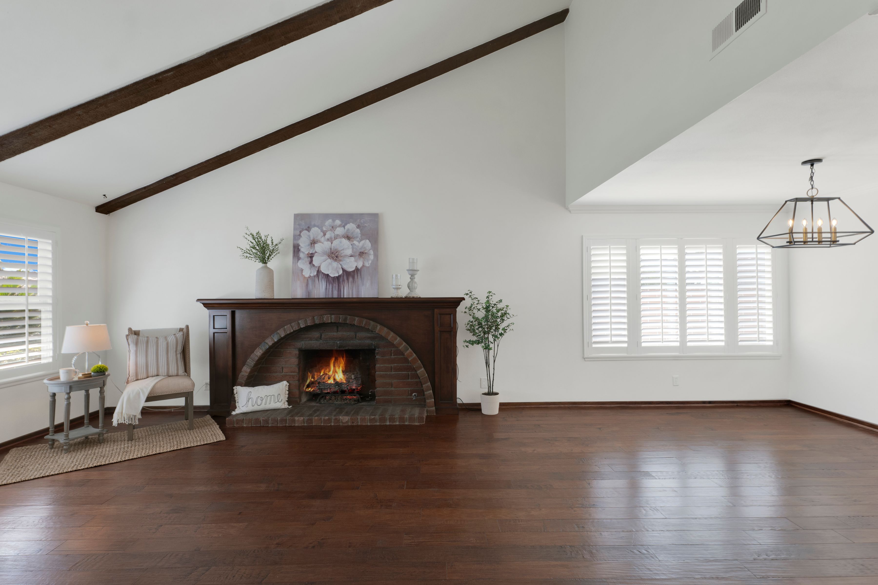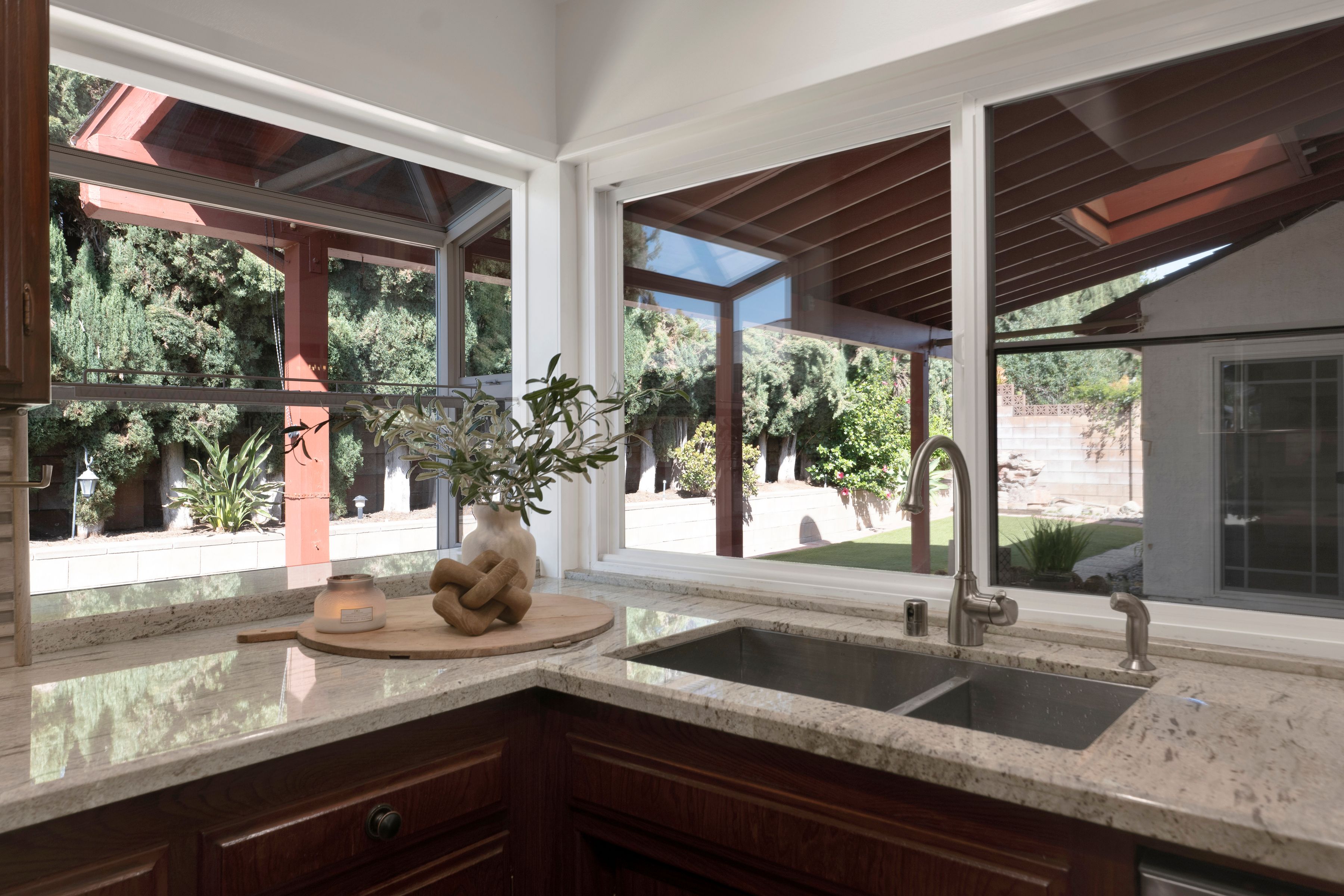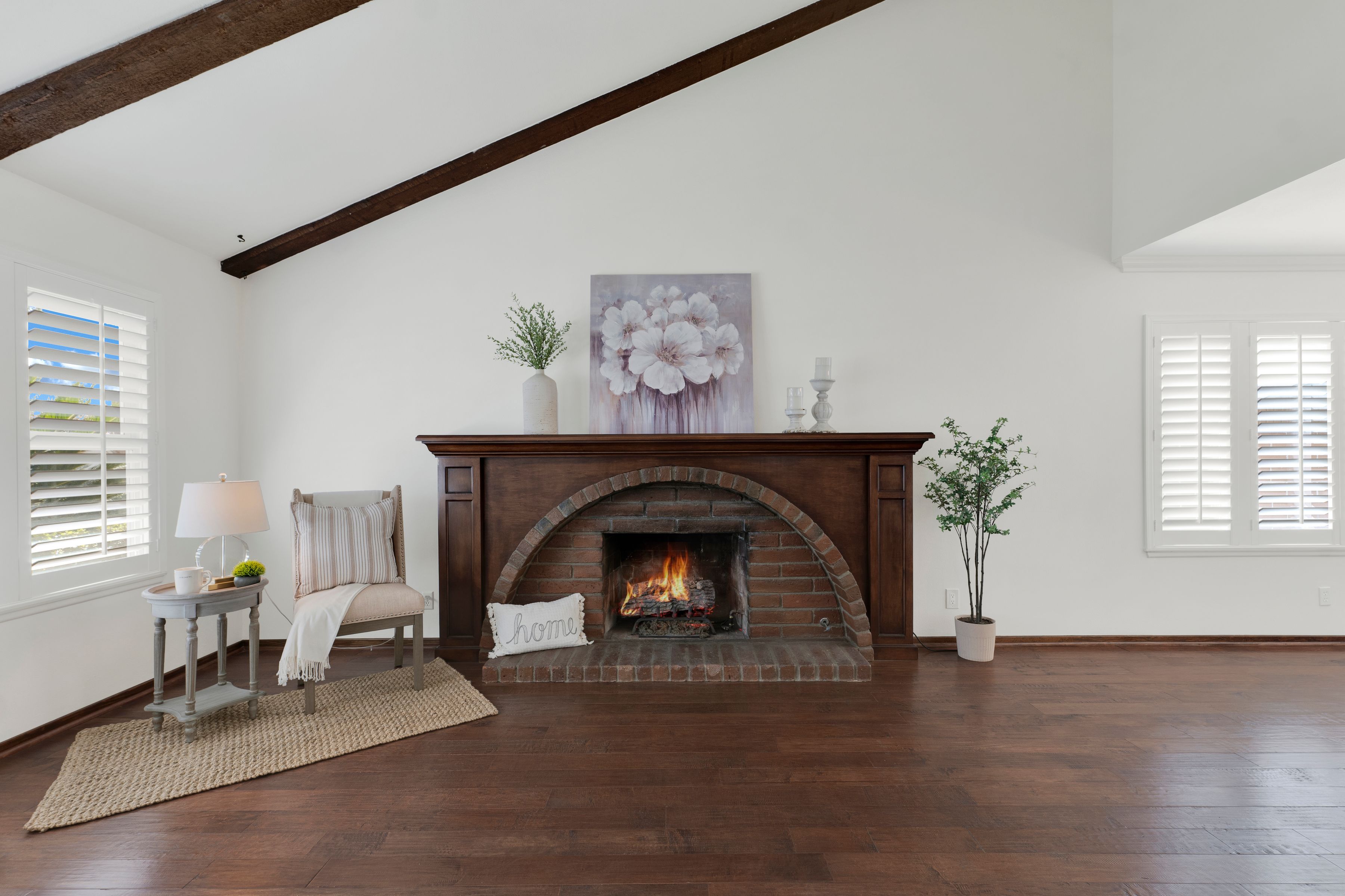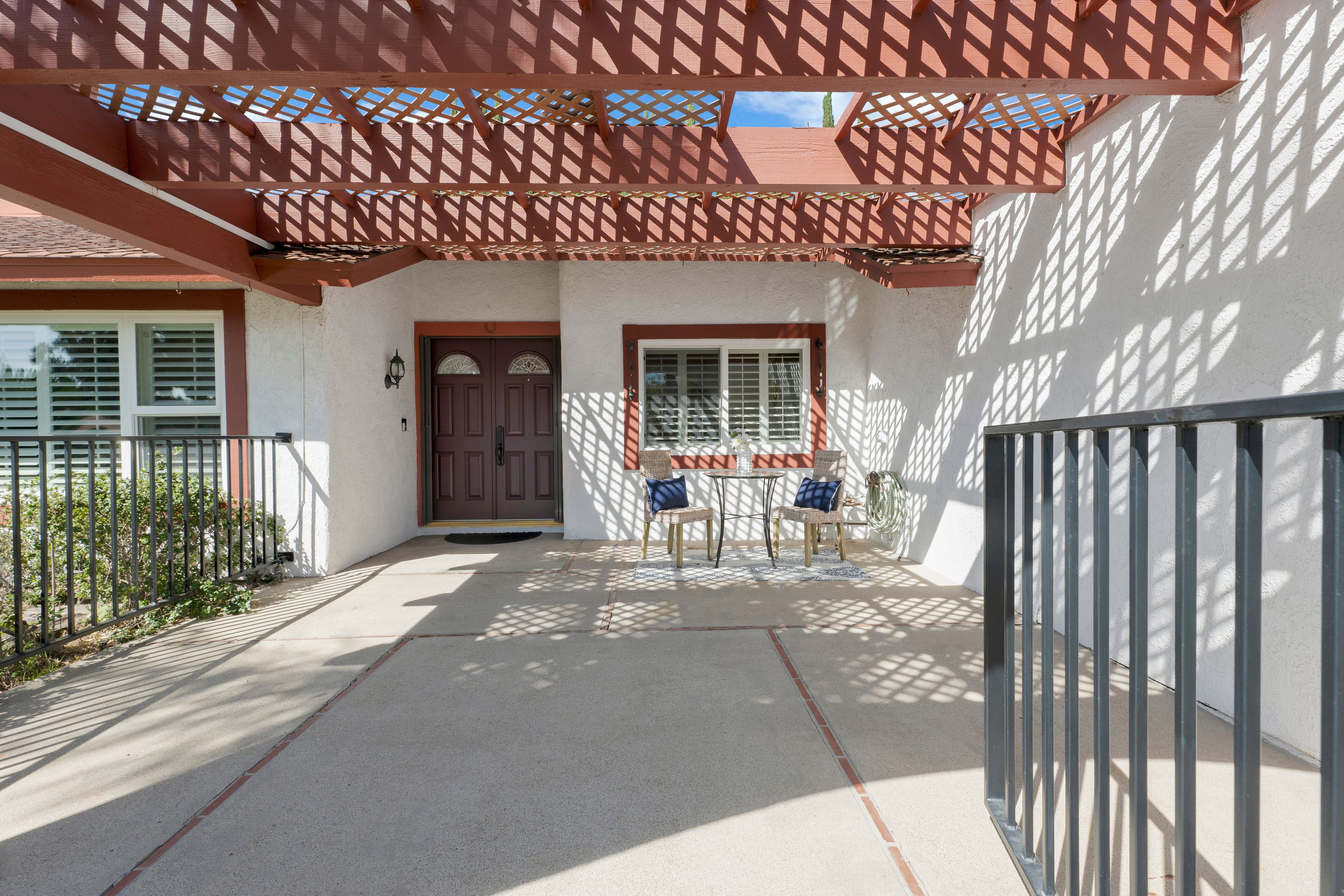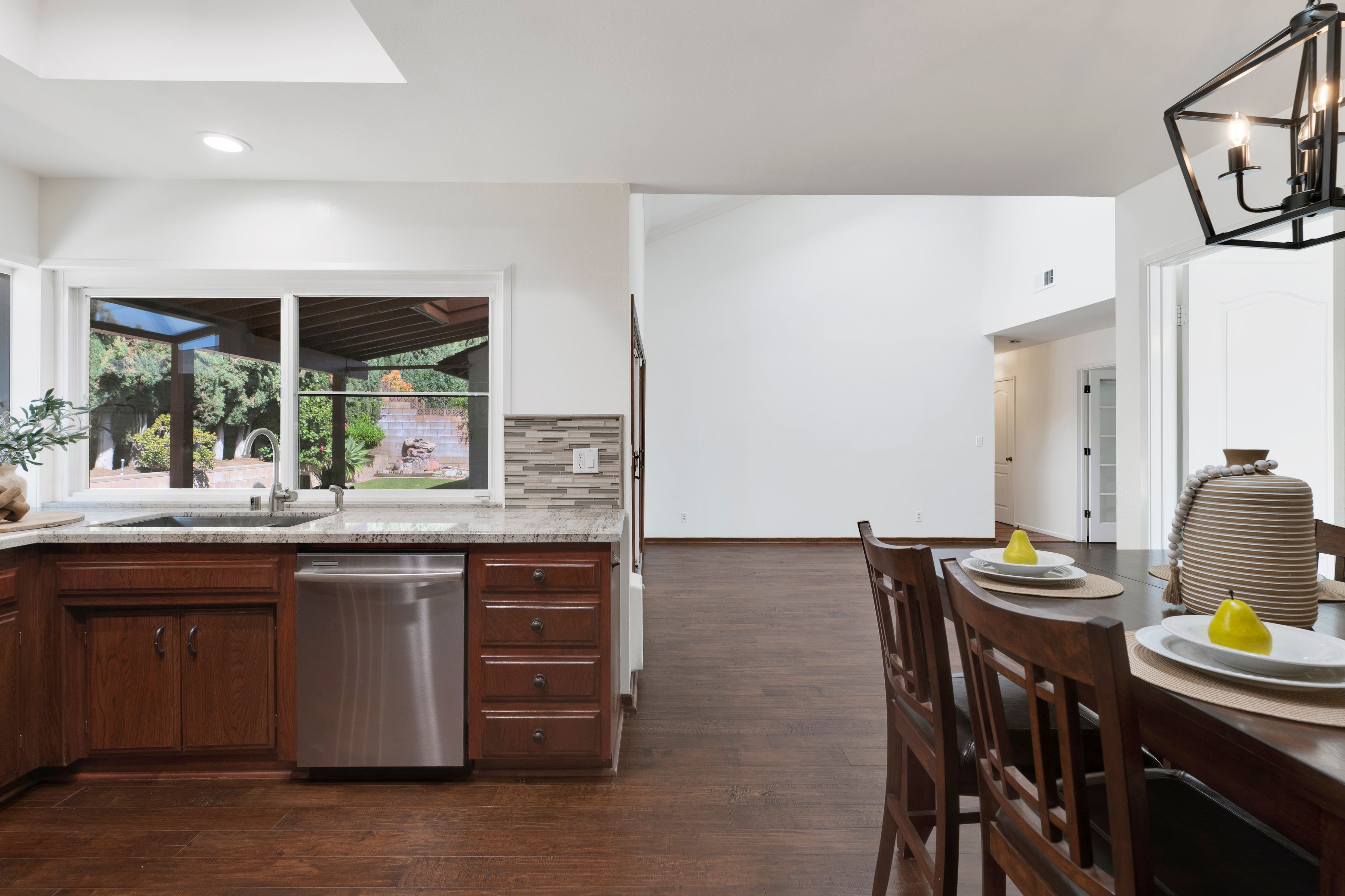 Welcome home to this beautifully updated single-story residence in the desirable east end of Simi Valley, where comfort, style, and exceptional curb appeal come together effortlessly. Surrounded by scenic mountain views, this charming home showcases thoughtful upgrades and inviting living spaces throughout. Step inside to a bright and airy living room featuring rich wood-like flooring, neutral designer paint, soaring vaulted ceilings with striking wood beams, and an oversized brick fireplace that serves as a stunning focal point-perfect for cozy evenings at home. A dramatic living room with expansive sliding doors opens seamlessly to the backyard, creating the ideal indoor-outdoor living experience. The light-filled kitchen is both functional and stylish, offering granite countertops, a charming garden window, and a spacious dining area perfect for casual meals and entertaining. Both bathrooms have been tastefully updated with granite and quartz countertops, modern finishes, and designer touches. Highlights include a walk-in shower with custom tile, an oversized sunken tub, and sleek vessel sinks. The generously sized primary suite features vaulted ceilings and direct access to the tranquil backyard, creating a peaceful retreat. Secondary bedrooms are equally spacious, complete with mirrored wardrobes and ceiling fans for year-round comfort. Additional upgrades include solar panels, dual-pane windows, plantation shutters, fresh interior paint, new ceiling fans, and elegant chandeliers that enhance the home's modern appeal and energy efficiency. Step outside to an oversized wood-covered patio- an inviting space perfect for entertaining or relaxing at the end of the day. The low-maintenance private yard offers ample room to enjoy outdoor living. A standout feature of this property is the expansive paved RV storage--ideal for all your recreational needs. Located near top-rated schools and nestled in one of the most desirable neighborhoods with no HOA, this home offers the perfect blend of beauty, comfort, and convenience.