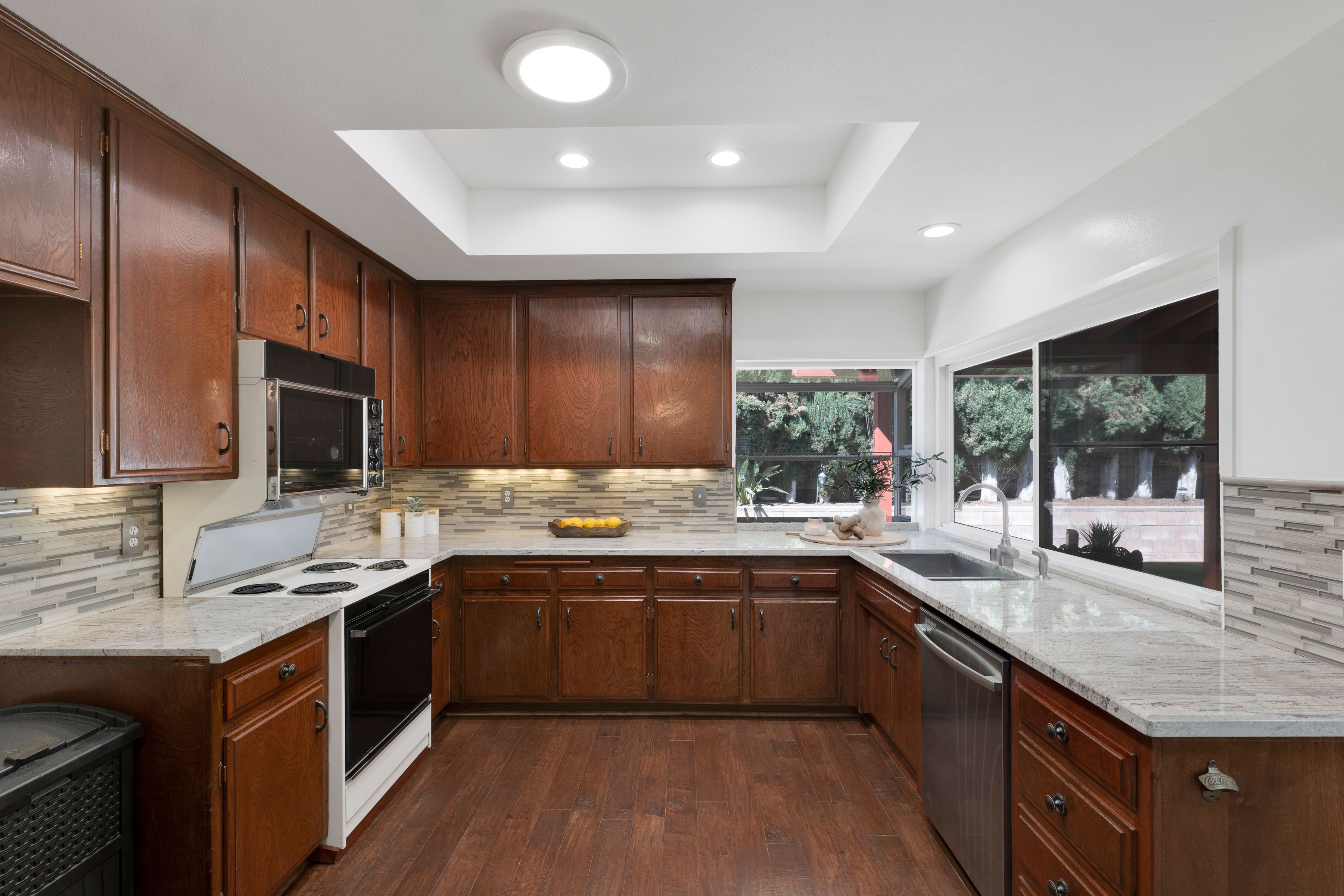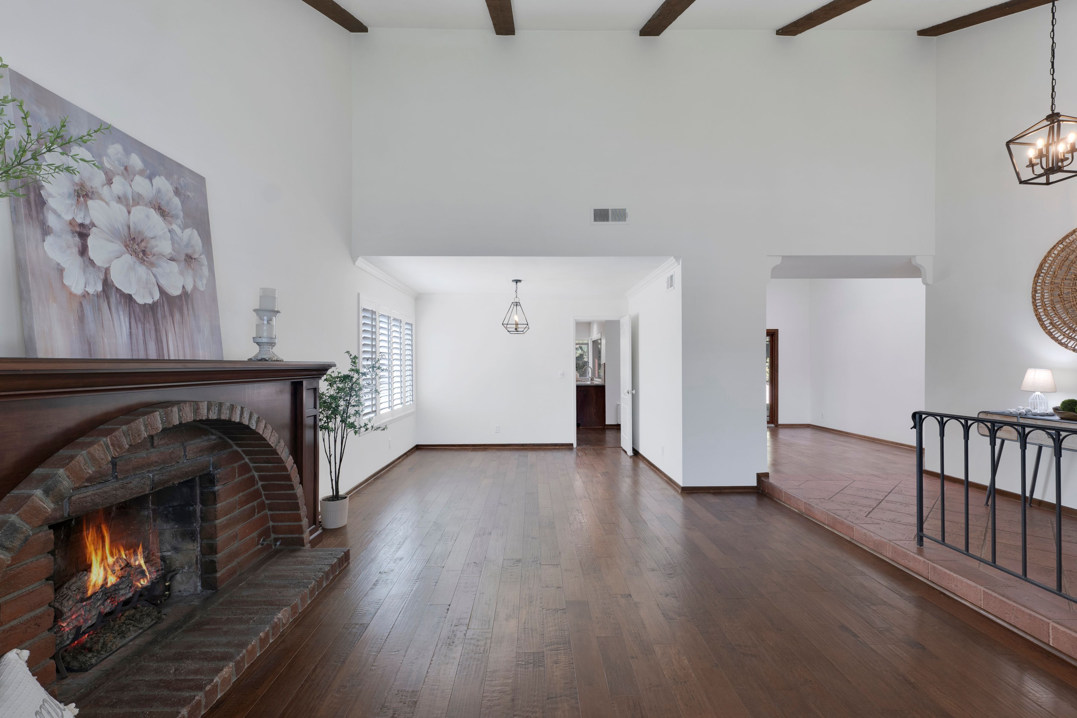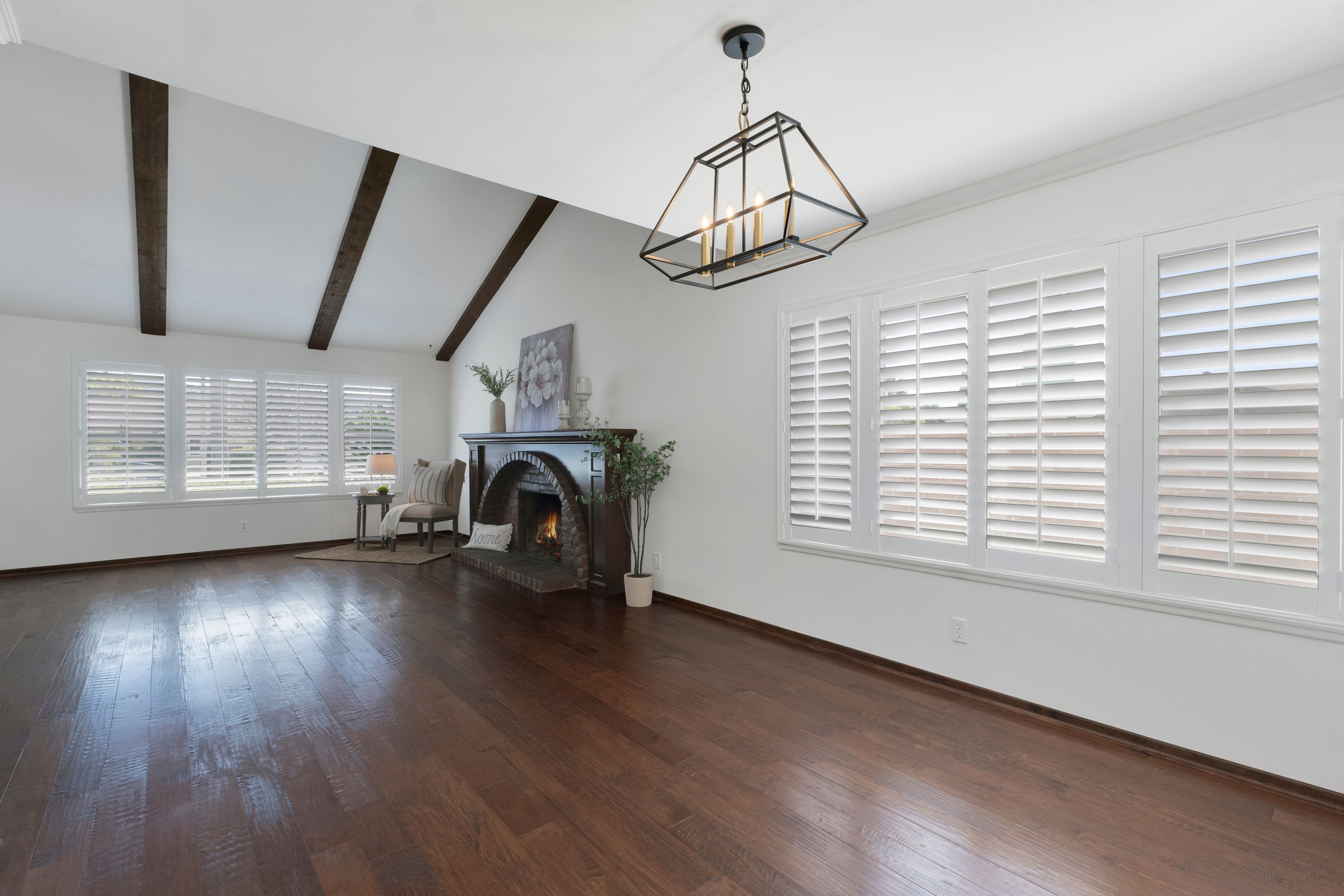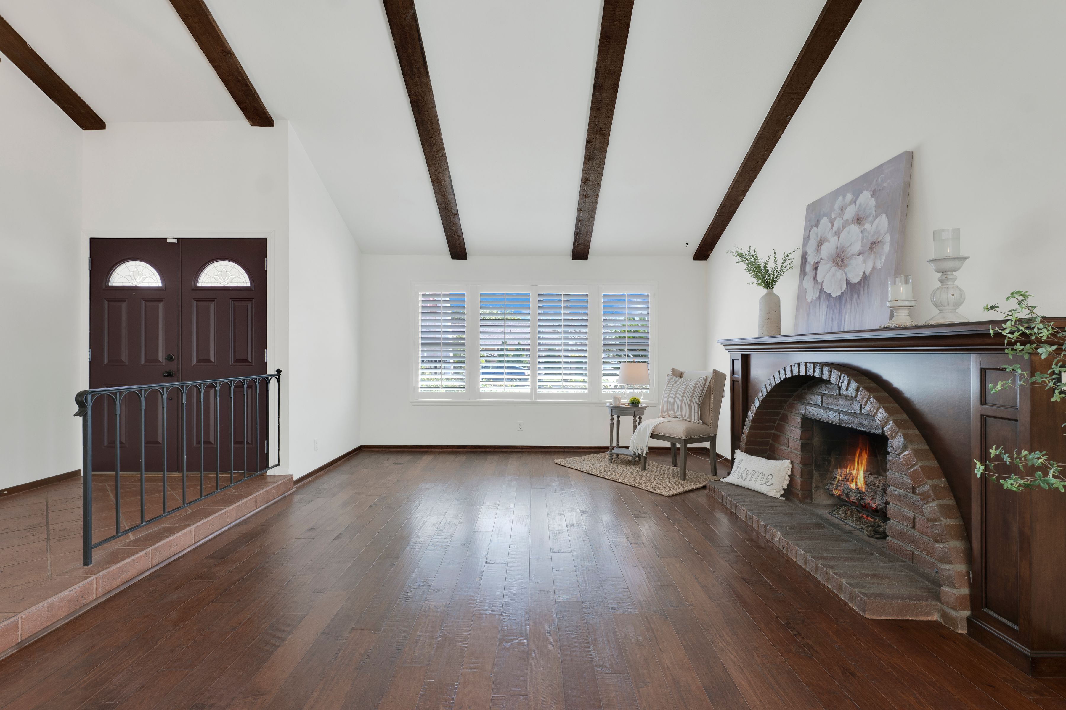 Welcome home to this beautifully updated single-story residence in the desirable east end of Simi Valley, where comfort, style, and exceptional curb appeal come together effortlessly. Surrounded by scenic mountain views, this charming home showcases thoughtful upgrades and inviting living spaces throughout. Step inside to a bright and airy living room featuring rich wood-like flooring, neutral designer paint, soaring vaulted ceilings with striking wood beams, and an oversized brick fireplace that serves as a stunning focal point-perfect for cozy evenings at home. A dramatic living room with expansive sliding doors opens seamlessly to the backyard, creating the ideal indoor-outdoor living experience. The light-filled kitchen is both functional and stylish, offering granite countertops, a charming garden window, and a spacious dining area perfect for casual meals and entertaining. Both bathrooms have been tastefully updated with granite and quartz countertops, modern finishes, and designer touches. Highlights include a walk-in shower with custom tile, an oversized sunken tub, and sleek vessel sinks. The generously sized primary suite features vaulted ceilings and direct access to the tranquil backyard, creating a peaceful retreat. Secondary bedrooms are equally spacious, complete with mirrored wardrobes and ceiling fans for year-round comfort. Additional upgrades include solar panels, dual-pane windows, plantation shutters, fresh interior paint, new ceiling fans, and elegant chandeliers that enhance the home's modern appeal and energy efficiency. Step outside to an oversized wood-covered patio- an inviting space perfect for entertaining or relaxing at the end of the day. The low-maintenance private yard offers ample room to enjoy outdoor living. A standout feature of this property is the expansive paved RV storage--ideal for all your recreational needs. Located near top-rated schools and nestled in one of the most desirable neighborhoods with no HOA, this home offers the perfect blend of beauty, comfort, and convenience.