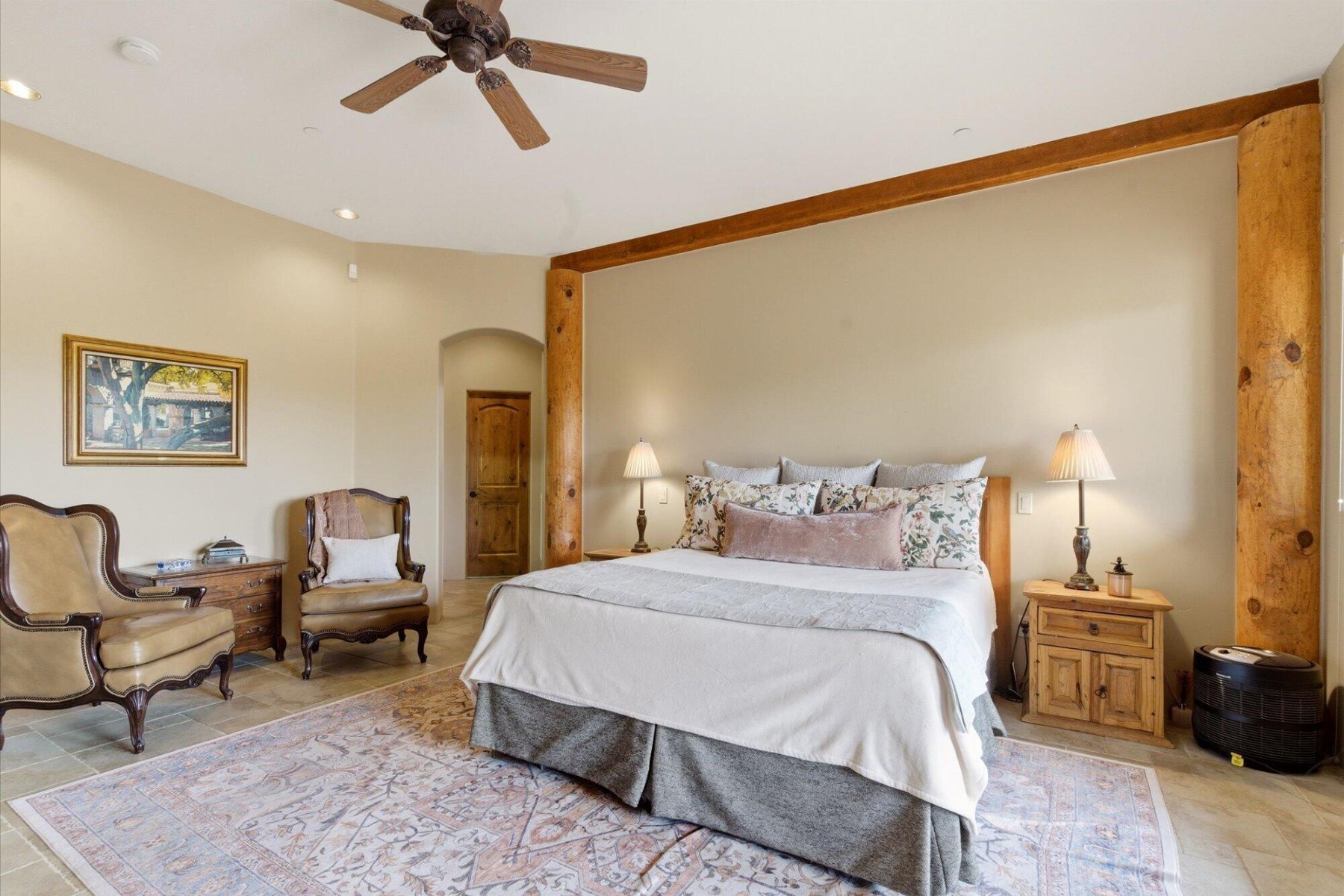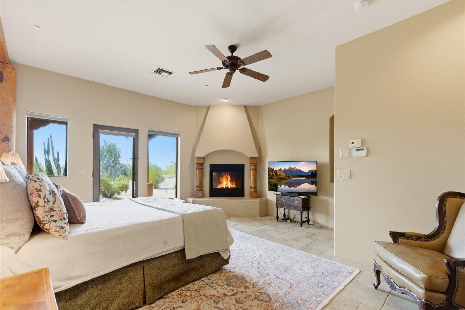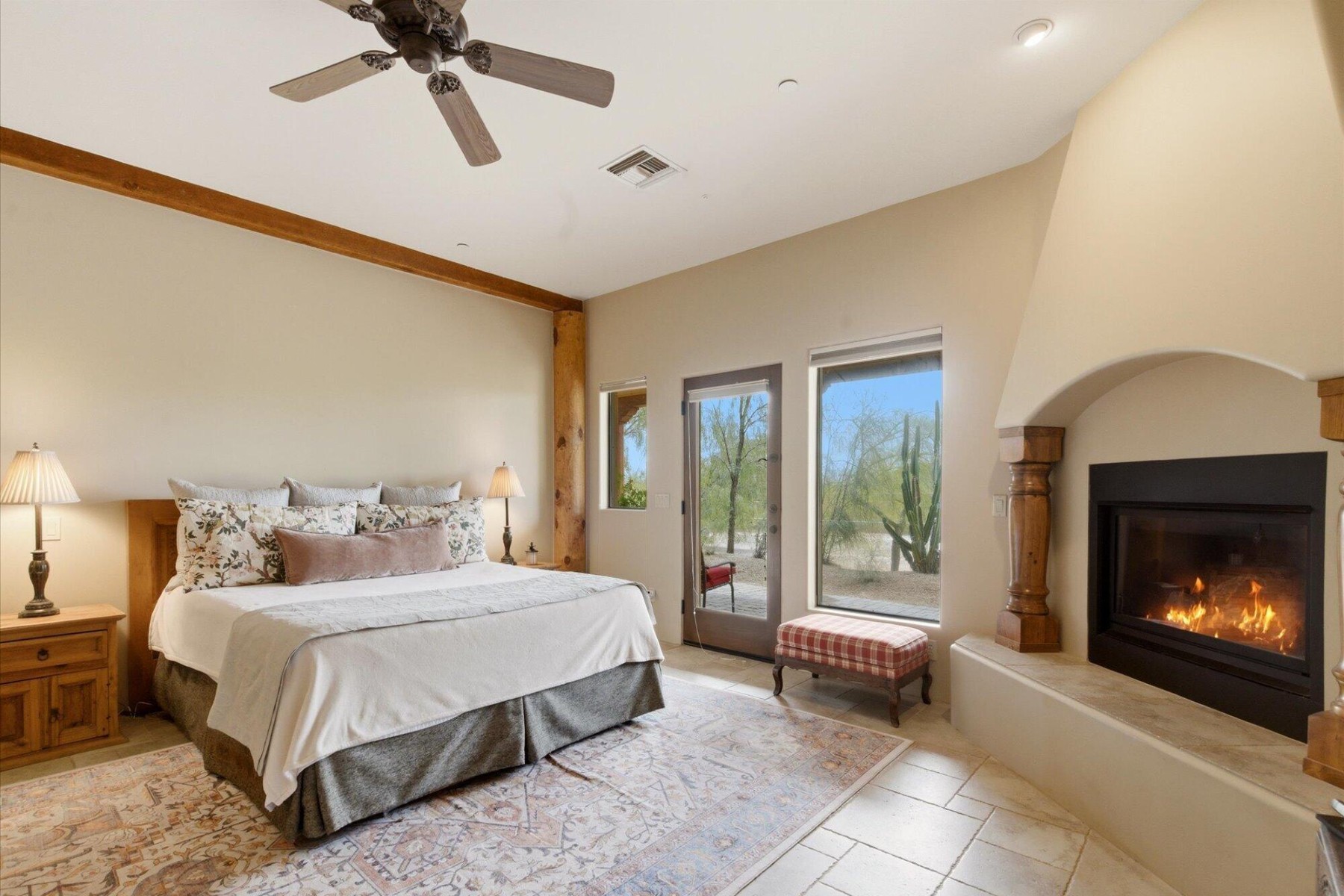 The master suite is a true retreat, featuring a cozy gas fireplace, custom alder accents, and a sitting area. French doors open to an expansive paver patio, blending indoor and outdoor living.