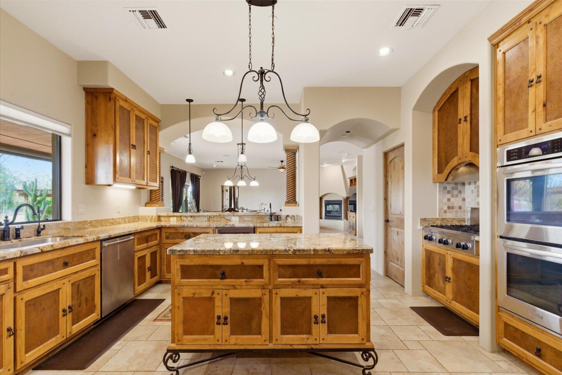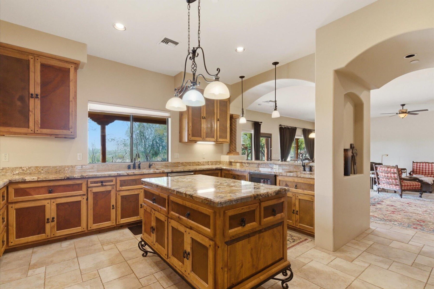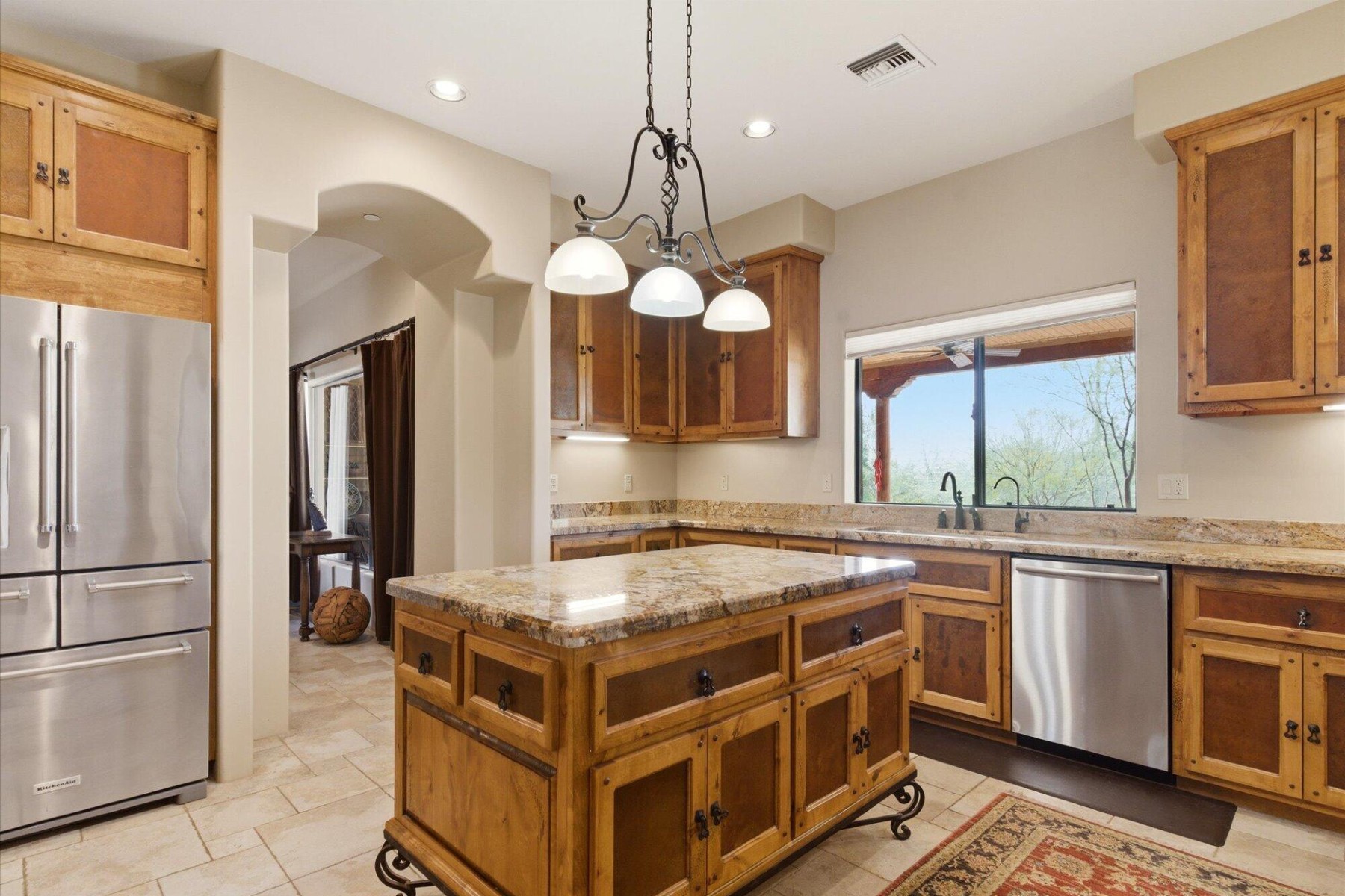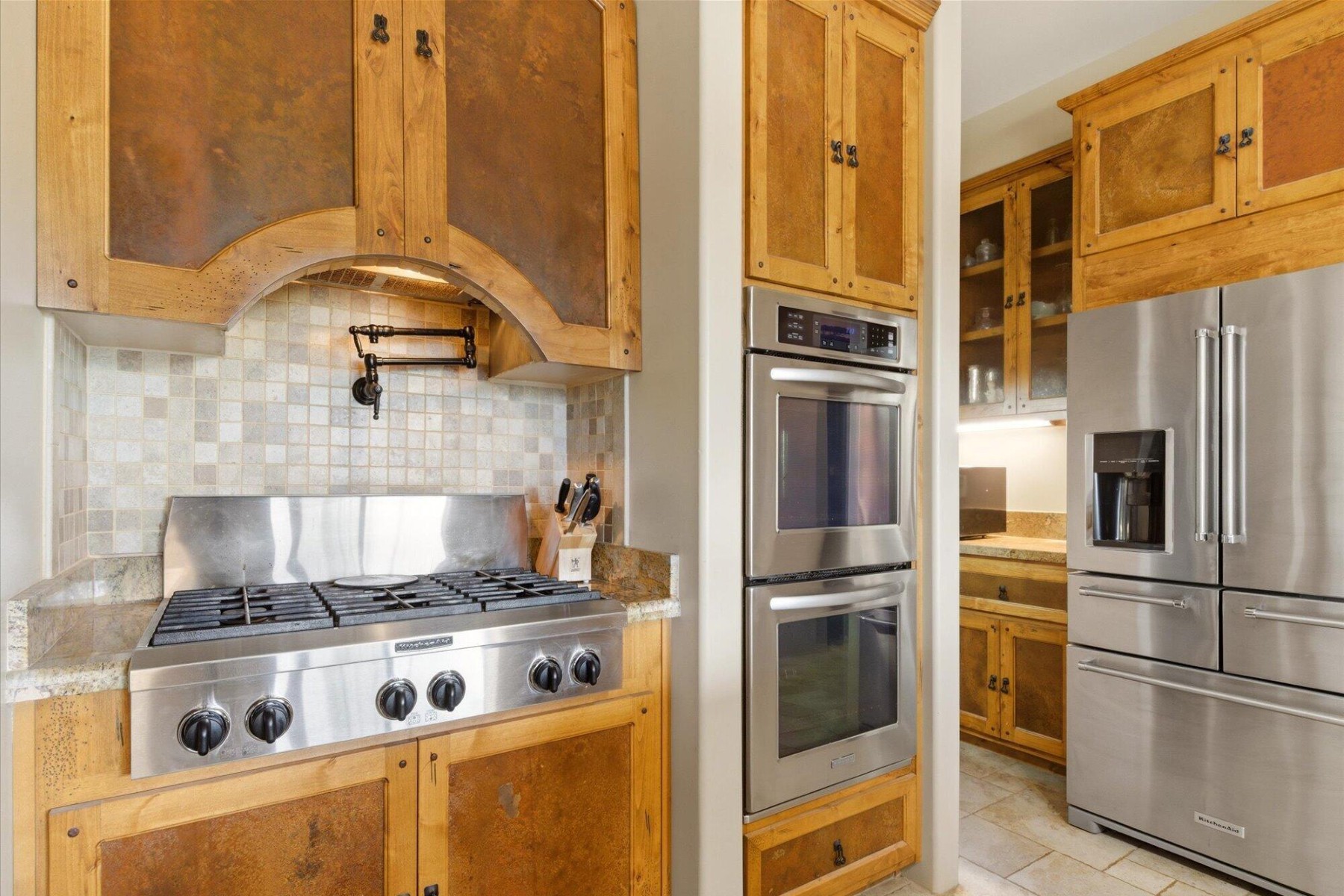 The chef;s kitchen is equipped with custom alder cabinetry and a large island with wrought iron base. A butler's pantry with wine fridge adds additional functionality.