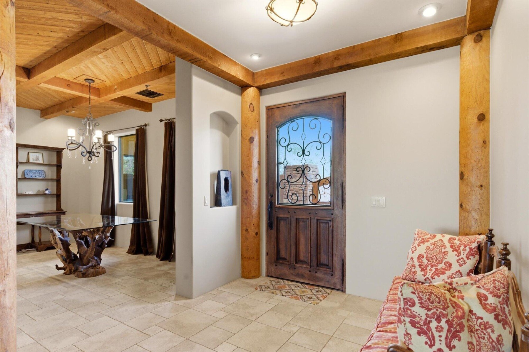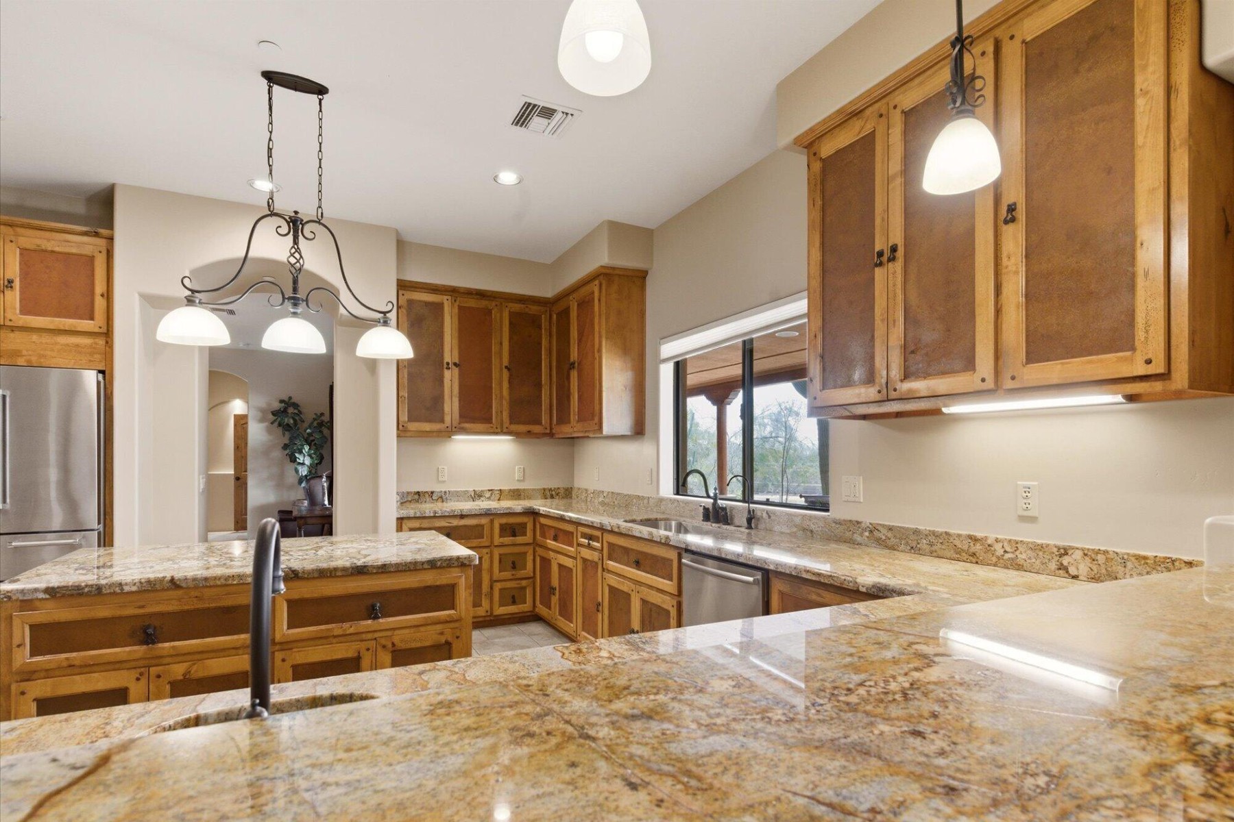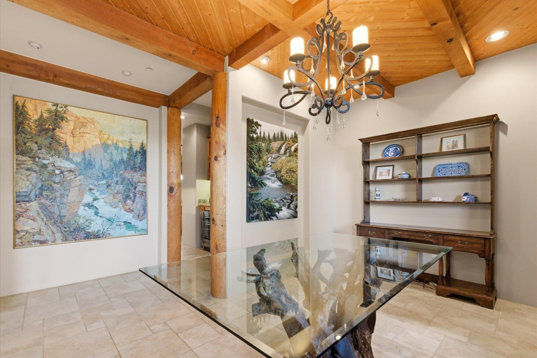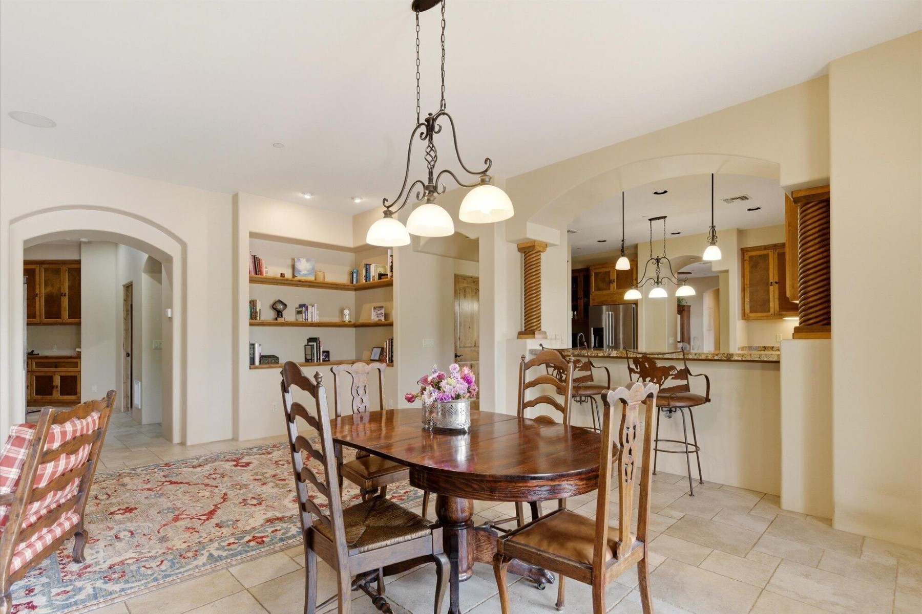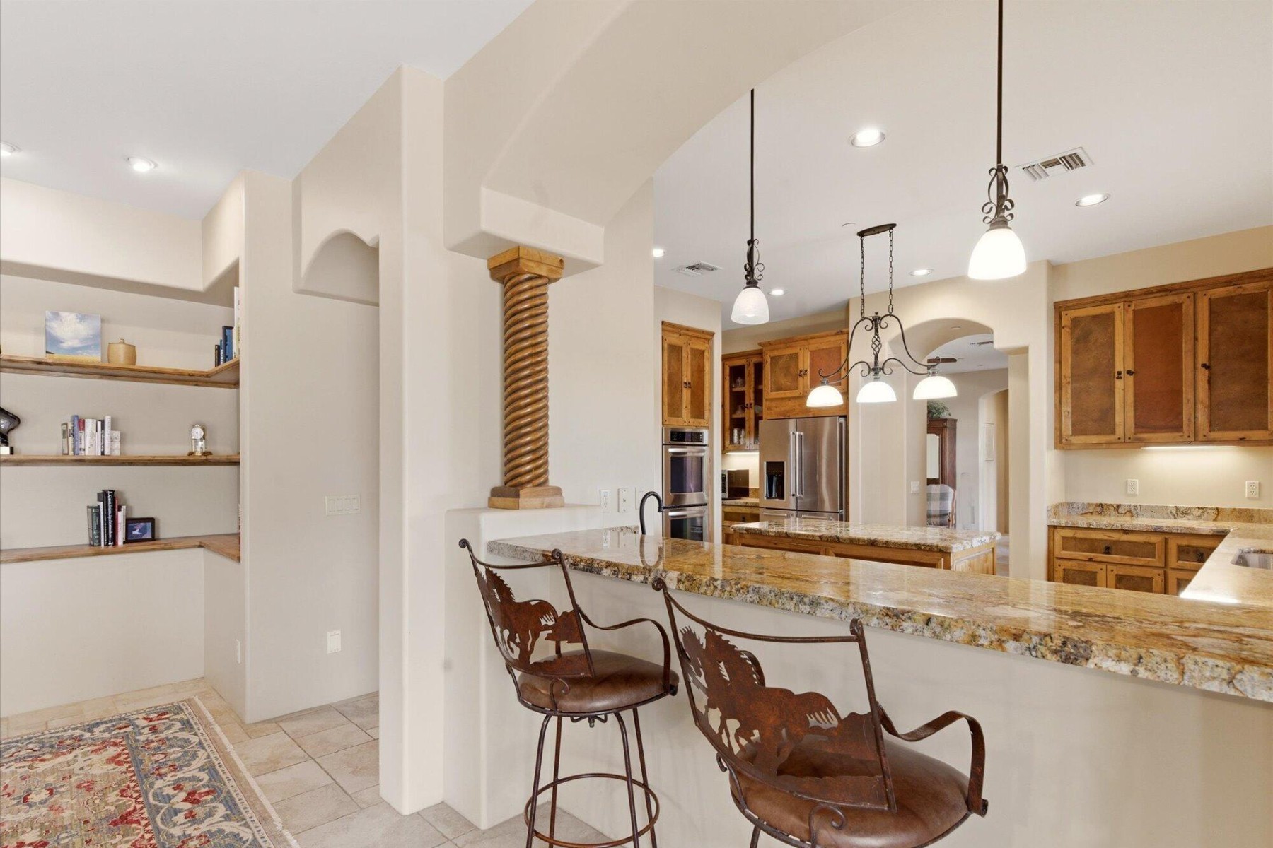 The chef;s kitchen is equipped with custom alder cabinetry and a large island with wrought iron base. A butler's pantry with wine fridge adds additional functionality.