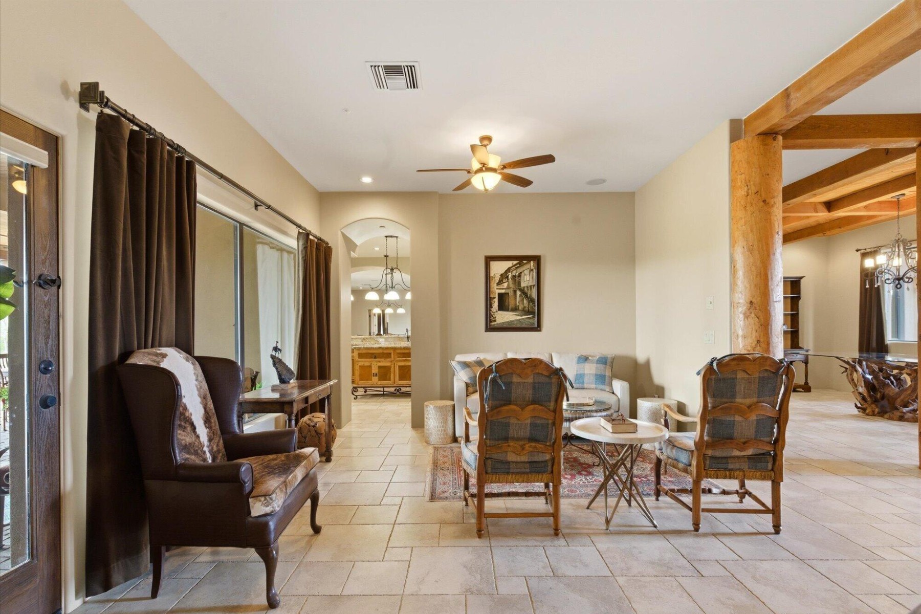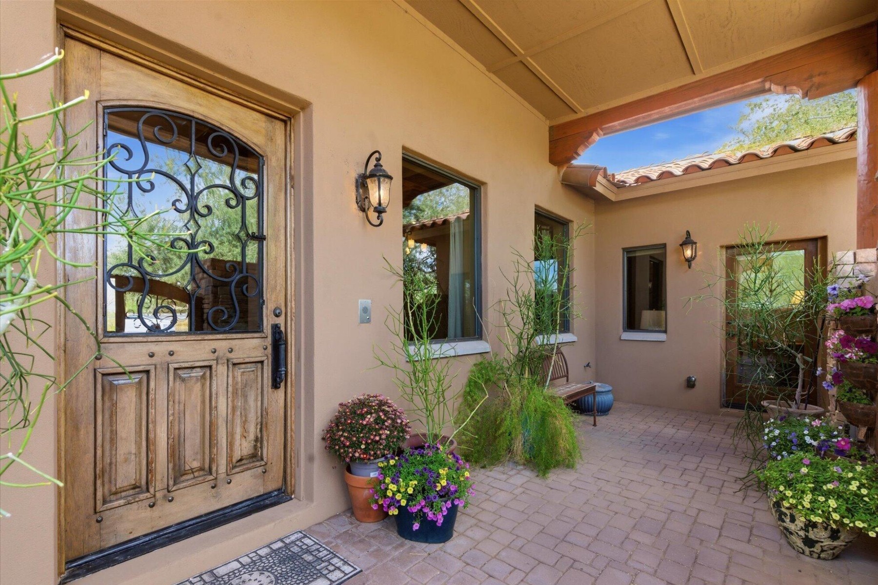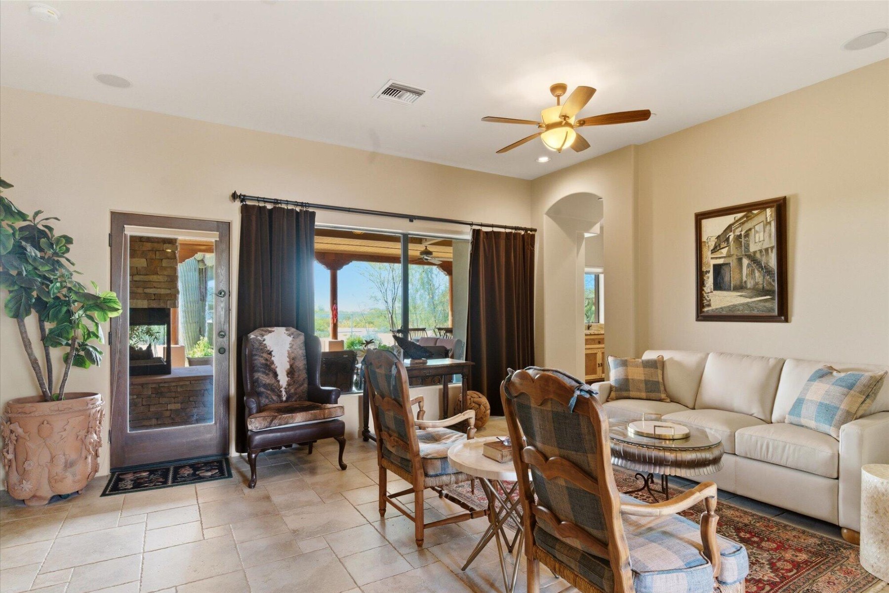 The backyard is designed for ultimate outdoor living with a massive 1,800 sf covered patio featuring wood Vegas, a stone-accented fireplace, fountain and ceiling fans to create a comfortable and stylish retreat. A resort-style swimming pool completes the entertaining space. For horse enthusiasts, this property offers a 4-stall shed-row barn by BarnMaster, complete with tack room, automatic waterers and insulated roof as well as turn-outs and riding arena and easy access to nearby trails.The property also features an attached multi-generational dwelling unit, ideal for extended family or guests. It includes 2 bedrooms, a 2nd kitchen and its own private entry.Equipped with Tesla Solar Panels and a Powerwall 3, this home lowers energy costs and Two SOURCE Global hydropanels generate distilled drinking water from the air, adding an innovative touch to your sustainable lifestyle.This estate offers a rare combination of luxury, sustainability, and equestrian features with close proximity to highways and amenities.