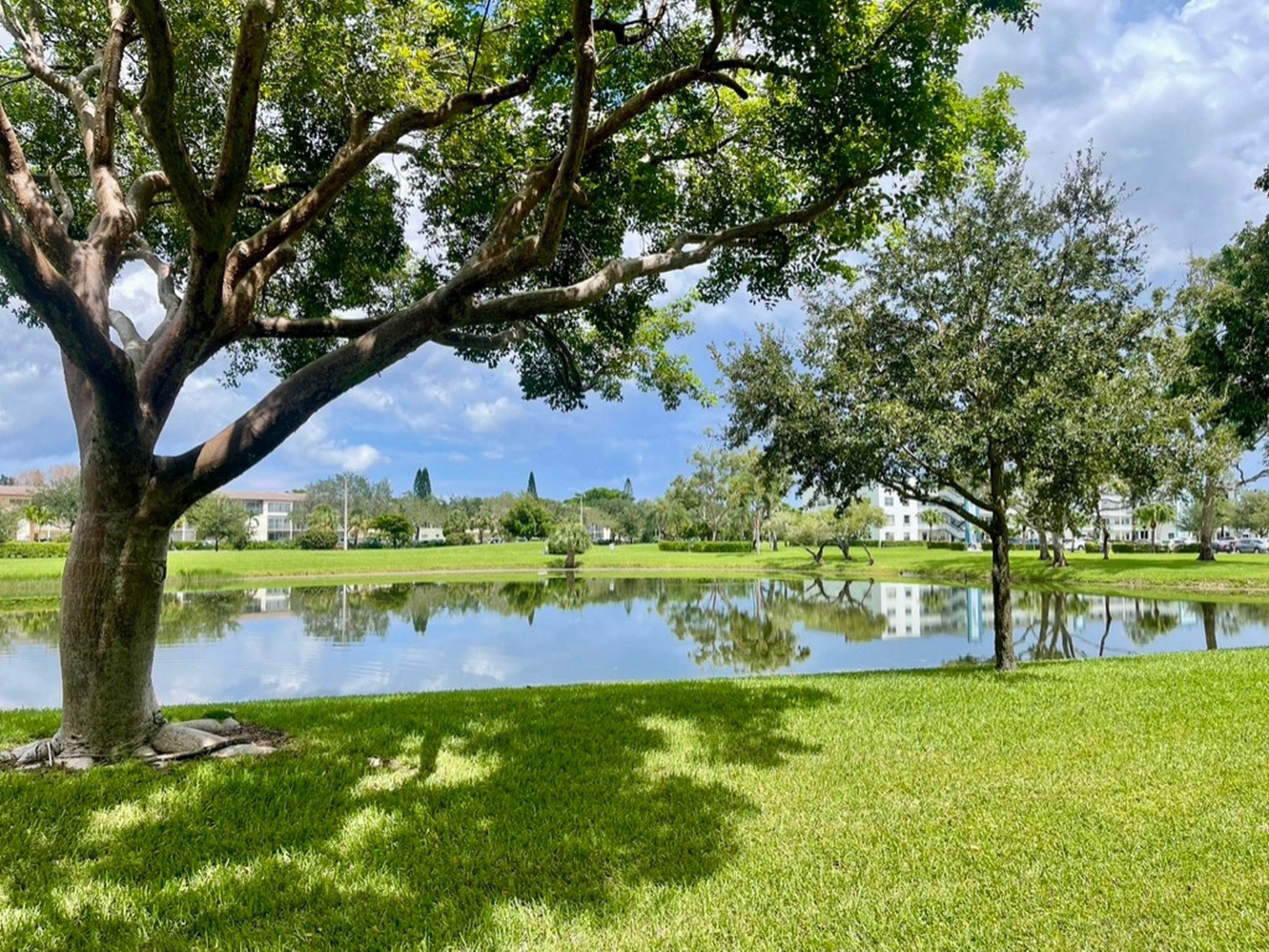Beautiful Lake view from your enclosed balcony. Lovely 2 bedrooms, 2 baths on the 2nd floor. Updated kitchen with stainless steel appliances, new wood cabinets, granite counters and large tile in all the common area rooms. Assigned parking close to the elevator and lots of guest spaces. Century Village resort-living. fitness center, swimming, live shows, movies, bingo, card rooms, trips, tennis courts... This is a 55+ community. Unit can come furnished or unfurnished.