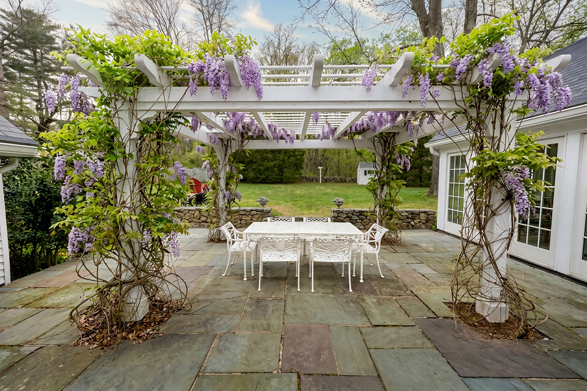 The grounds are truly magical with mature landscaping and plantings, inviting stone patio, and a stunning pergola draped in wisteria, ideal for outdoor entertaining or quiet afternoons. A heated saltwater pool, surrounded by elegant white fencing enhances the serene setting.
