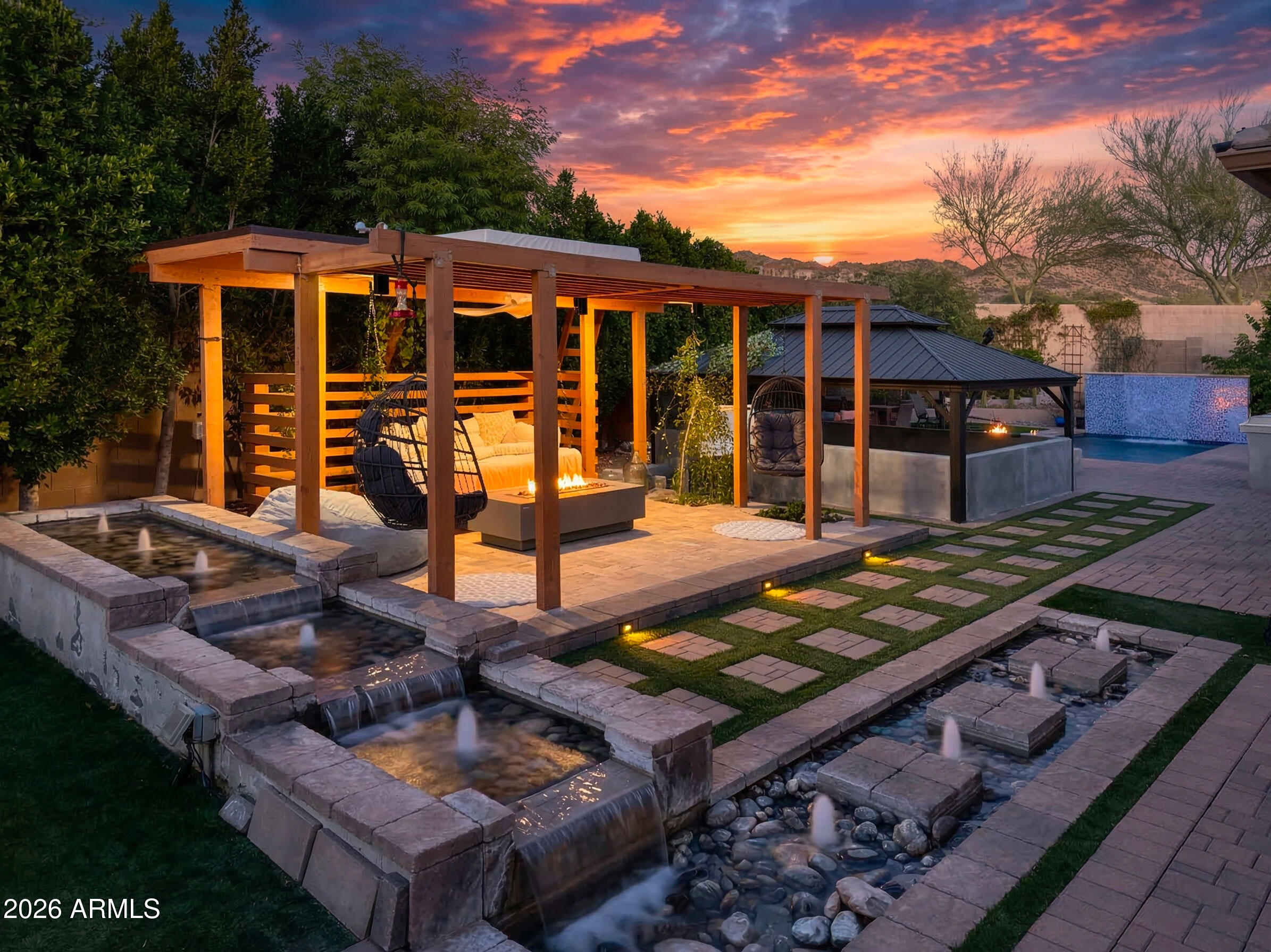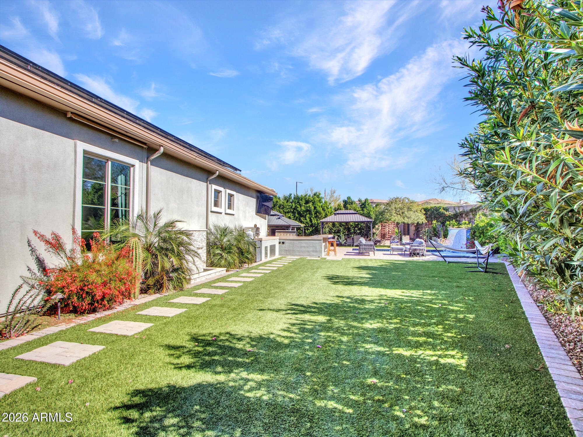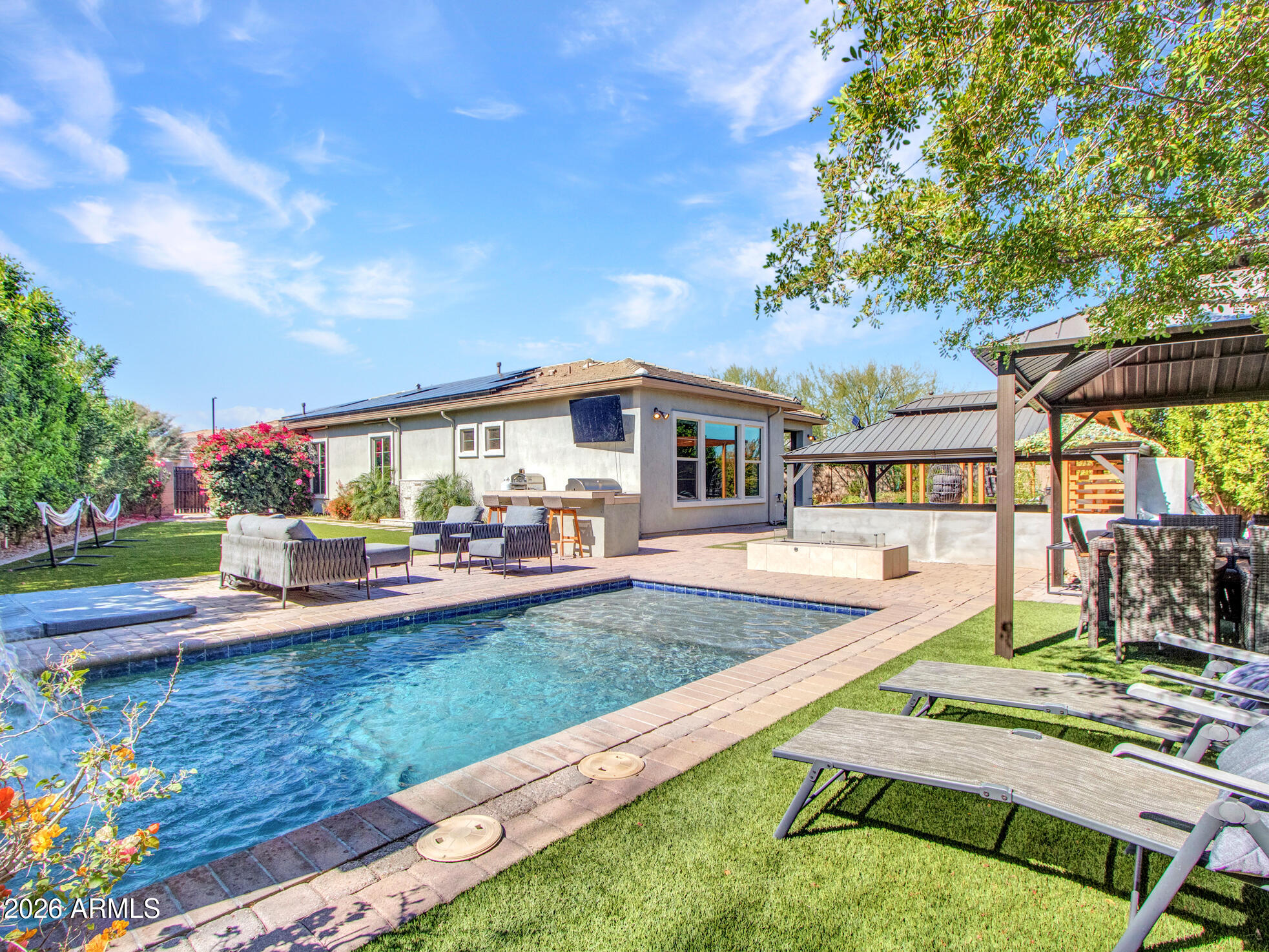 Wow--this one truly stands out. Landlord pays Solar lease! Set on an oversized corner lot, this upgraded luxury home is packed with thoughtful details inside and out. The kitchen is a total showpiece with an oversized quartz island, gas cooktop, breakfast bar, abundant cabinetry, and a large pantry. A wall of windows fills the home with natural light, while the living area offers a cozy fireplace, porcelain tile feature wall, and easy access to the patio for seamless indoor-outdoor living. The split-bedroom layout includes 3 bedrooms, 2.5 baths, and even a secret library room for a fun and unexpected bonus. The oversized primary suite looks out to the stunning backyard, and the 2.5-car garage offers plenty of storage. Smart home perks include Nest cameras, an Ecobee WiFi thermostat, Genie WiFi garage opener, and Pentair pool controls. Out back is where this home really shines--travertine gazebo, 3 outdoor fireplaces, surround-sound movie setup, custom dog run, hot tub, built-in BBQ with cooler, water feature, and a saltwater spool that both heats and cools. Add in rooftop solar and privacy from the corner lot, and this home checks every luxury box.