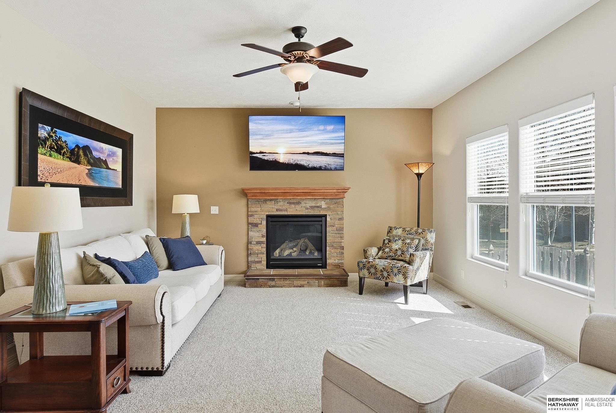 OPEN HOUSE 3/22 Sun. 12:30 - 2:30. Welcome to this MOVE-IN-READY 2-story in Mission Park. Fantastic street appeal with a relaxing covered front porch. Open the door to a flex/dining space with accent windows that let in plenty of natural light. Kitchen with center island w/seating, granite, plenty of cabinetry, wood floor, and a walk-in pantry. A main floor family room w/fireplace opens to the kitchen. You will also notice the fresh paint and carpet on the main floor as well. Plenty of family space with 4 beds above grade, a laundry room, and a bonus loft area. 5th bed or office in the lower level with a 3/4 bath. Additional living/play space in the lower level with so much flexibility. The flat, fenced backyard with a fire pit is ready for all your outdoor activities. Family-friendly neighborhood and walking distance to Millard West High School. Close to grocery stores, dining, and nature, with Lake Zorinsky close by for hiking, biking, & relaxing.