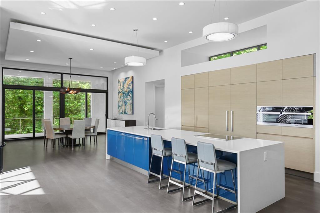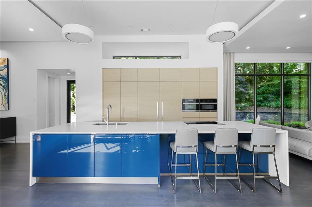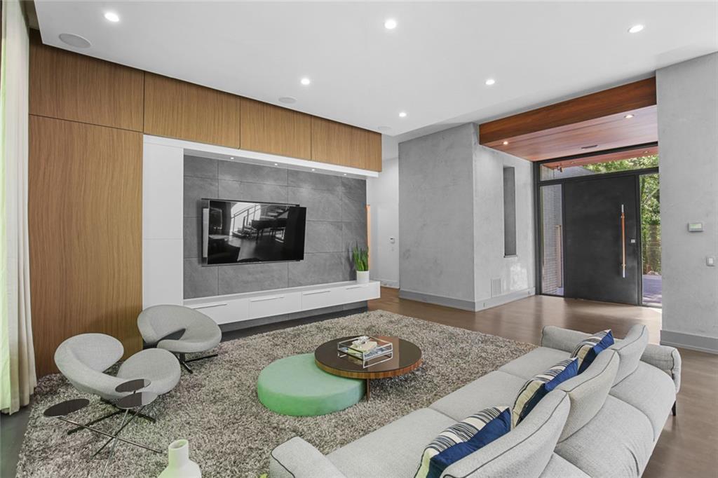 Modern Vinings home with rooftop terrace, Control4 smart living, luxurious primary suite, oversized home gym, main level guest suite just minutes from Buckhead with the added advantage of Cobb County taxes. Striking architecture and clean lines define this home, where floor to ceiling windows and a dramatic floating staircase create a bright and open first impression. The modern design is balanced by warm wood accents, wide plank oak floors, and sexy lighting throughout. The Italian designed Poliform kitchen is both sleek and highly functional, with integrated cabinetry, Miele appliances, and an induction cooktop centered on a statement island. The kitchen opens to the living and dining areas, where a 500-bottle wine cellar and bar with a backlit onyx feature add a memorable focal point. The main level is designed for functional living, with a private guest suite, office/flex space, and mudroom. Large doors open to the flat fenced backyard with covered patio, built-in grill, and wooded views, creating an easy indoor-outdoor flow. Upstairs, the primary suite feels like a true retreat with peaceful views, two walk in closets, and a spa like bath featuring a backlit onyx shower. Two additional bedrooms with en-suite baths, a laundry room, and a light filled library with soaring ceilings and built ins complete the upper level. The rooftop terrace offers a unique outdoor space for entertaining, relaxing, or just stepping away for a quiet moment. The terrace level adds even more flexibility with high ceilings, a large recreation space, full gym, additional bedroom, and full bath. Located in Vinings just minutes from Buckhead, top private schools, and Vinings Village, this home offers a rare combination of modern design, livability, and convenience.