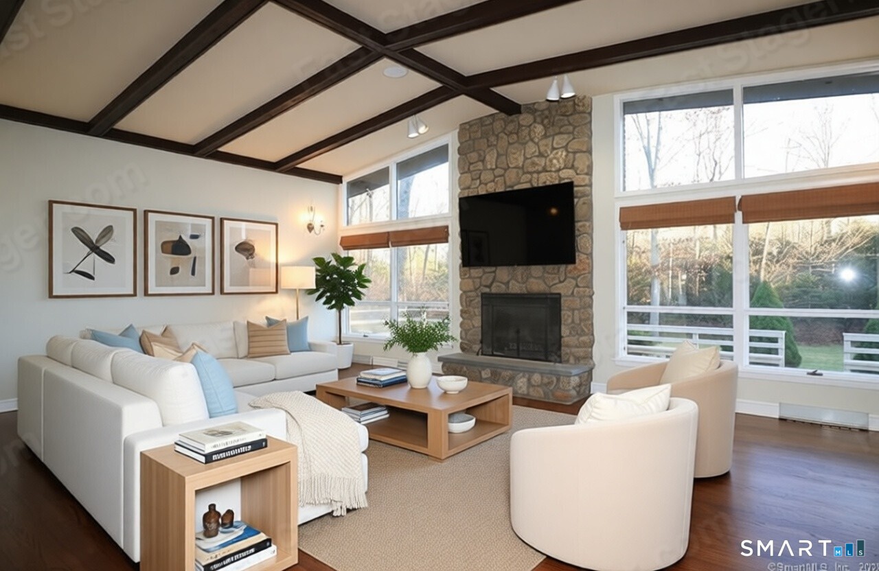 Stunning North Stamford California style ranch home on a secluded two-acre wooded back lot. This updated property features a spacious gourmet kitchen with handsome hardwood floors throughout. The main entrance opens to a great room with soaring ceiling, floor to ceiling stone fireplace, and walls of glass overlooking a serene park like private property. Plenty of office space on either the main floor and ground floor. Four full bathrooms, five bedrooms and a large office space, den or extra bedroom. The hardwood finished area below the main floor has its own private walk-out entrance to take advantage of an additional office space with its own full bathroom, wet bar and ample storage. A private and spacious fenced in back yard is perfect for family activities & pets. The attached two car garage and a large rear storage space completes this rental offering. A country getaway near major highways, towns such as Bedford, Pound Ridge, New Canaan and downtown Stamford. Discount available for a multi year lease, Pet deposit required.