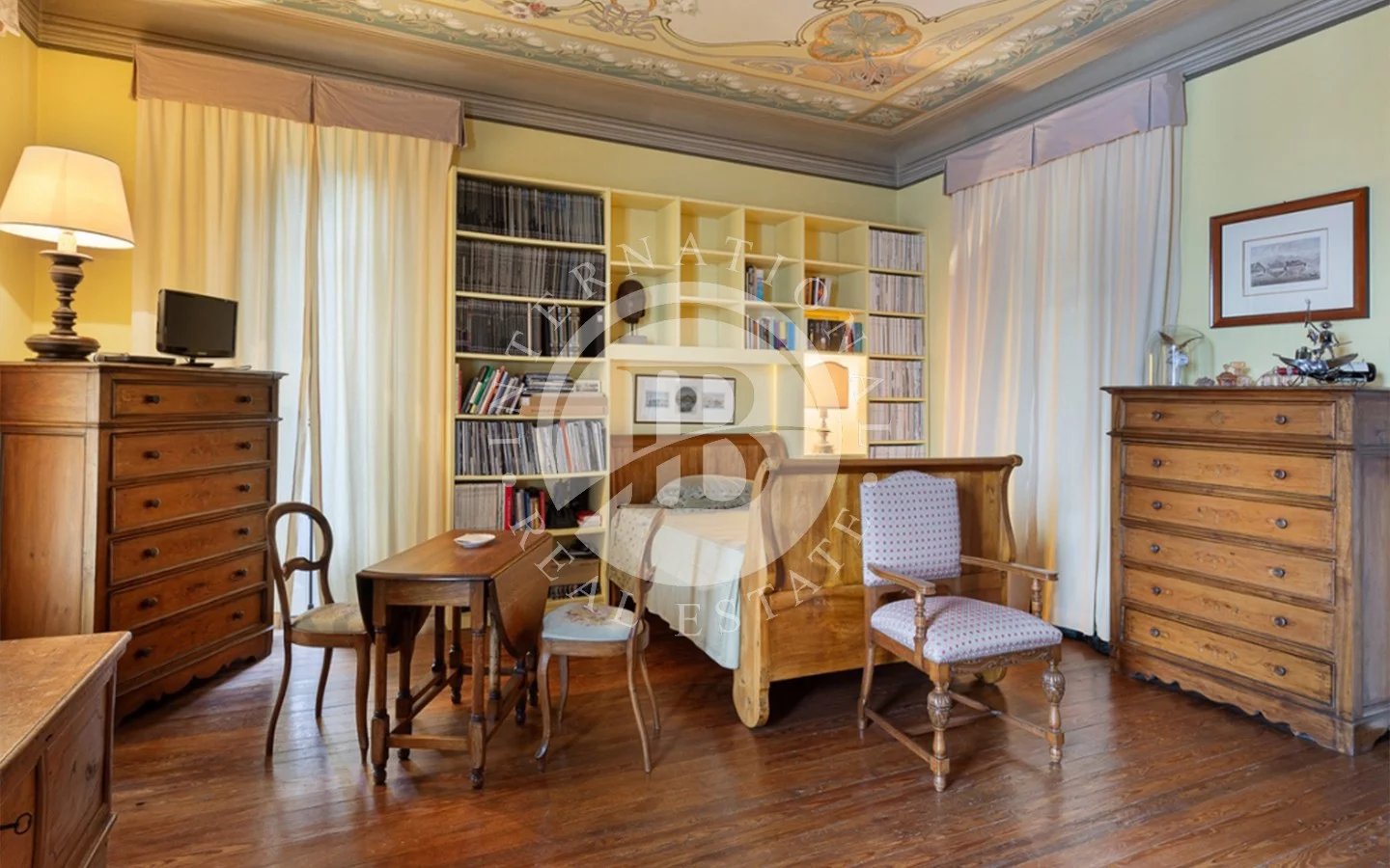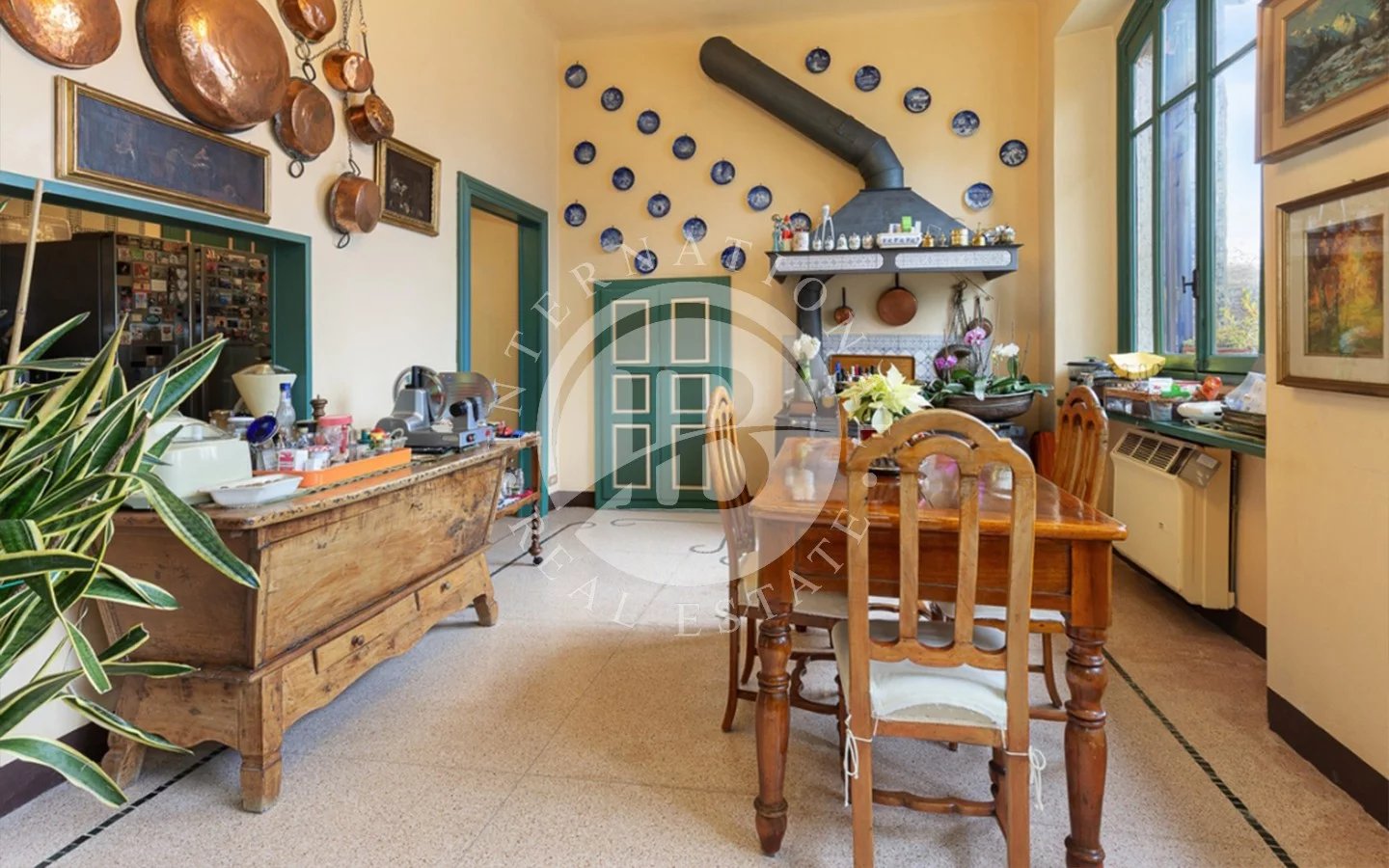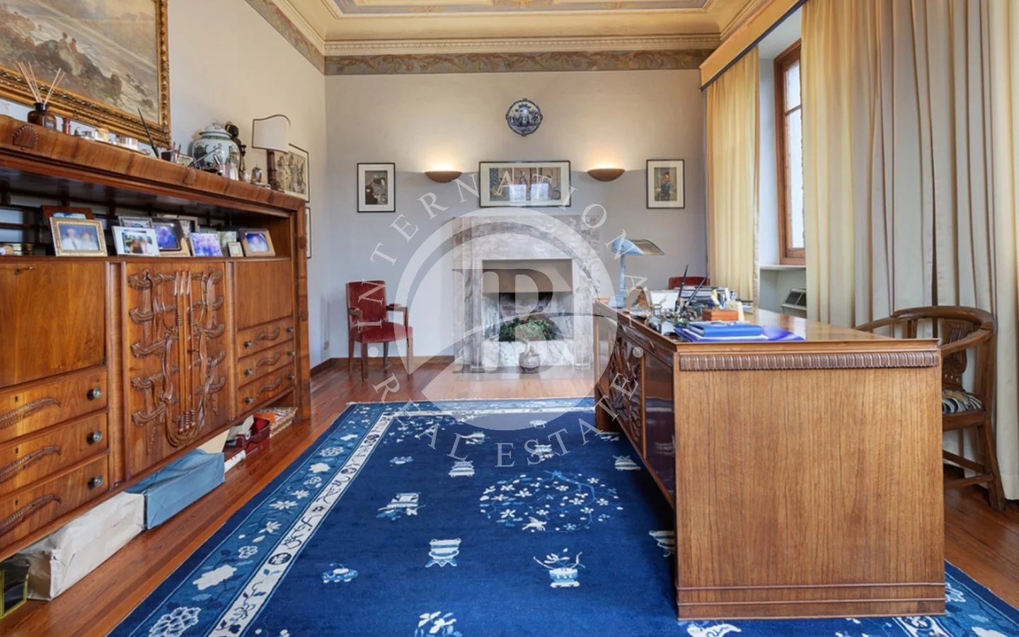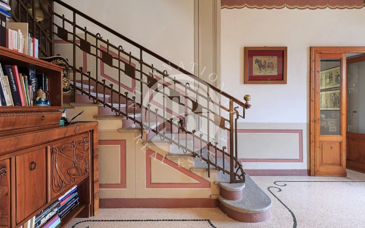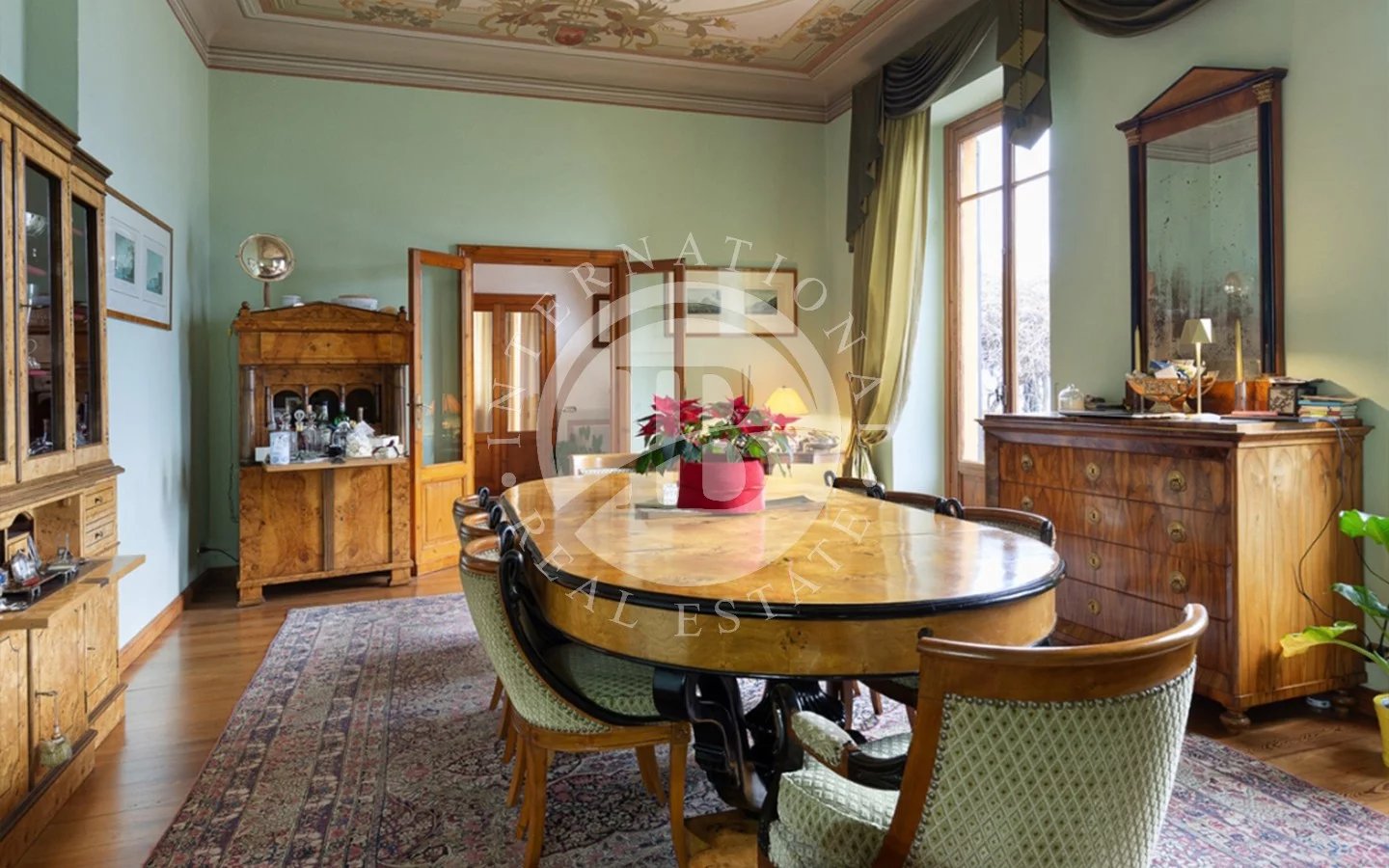 In Ghiffa, just a few minutes from Verbania, we are pleased to offer this elegant historic villa in a commanding position, boasting breathtaking open views of Lake Maggiore.Built in the early 20th century as a prestigious Liberty-style residence, the property has undergone a careful restoration that has preserved and enhanced its most authentic historical details. Today, the villa is in excellent condition, fully faithful to its original charm and elegance.The residence spans three levels, plus a charming panoramic turret overlooking the lake, currently used as a fitness area, for a total of approximately 453 sqm.The ground floor features a spacious entrance hall, a refined living-study with a marble fireplace, a large living room, a kitchen with dining area, and two guest bathrooms.The first floor hosts the sleeping quarters, including four bedrooms, one of which has a private en suite bathroom in Palissandro marble. The level is completed by a study, a second bathroom, a covered balcony, and a stunning terrace with lake views.The top floor accommodates a comfortable guest apartment with kitchen, living room, master bedroom, and bathroom, accessible both internally and independently—ideal for ensuring comfort and privacy.Outside, the villa is surrounded by a meticulously maintained private garden of approximately 1,185 sqm, offering tranquility, privacy, and an ideal setting to fully enjoy the beauty of the natural surroundings.The property also includes three covered parking spaces, an internal garage, and a spacious cellar.The interiors are enriched with high-quality materials such as parquet, exposed stone, marble, and refined wrought iron details, harmoniously combined with original elements and period decorations, creating a warm, sophisticated, and timeless atmosphere.A rare and highly charming residence, perfect for those seeking an exclusive home with stunning views of Lake Maggiore in one of the most picturesque locations of the Verbano area.