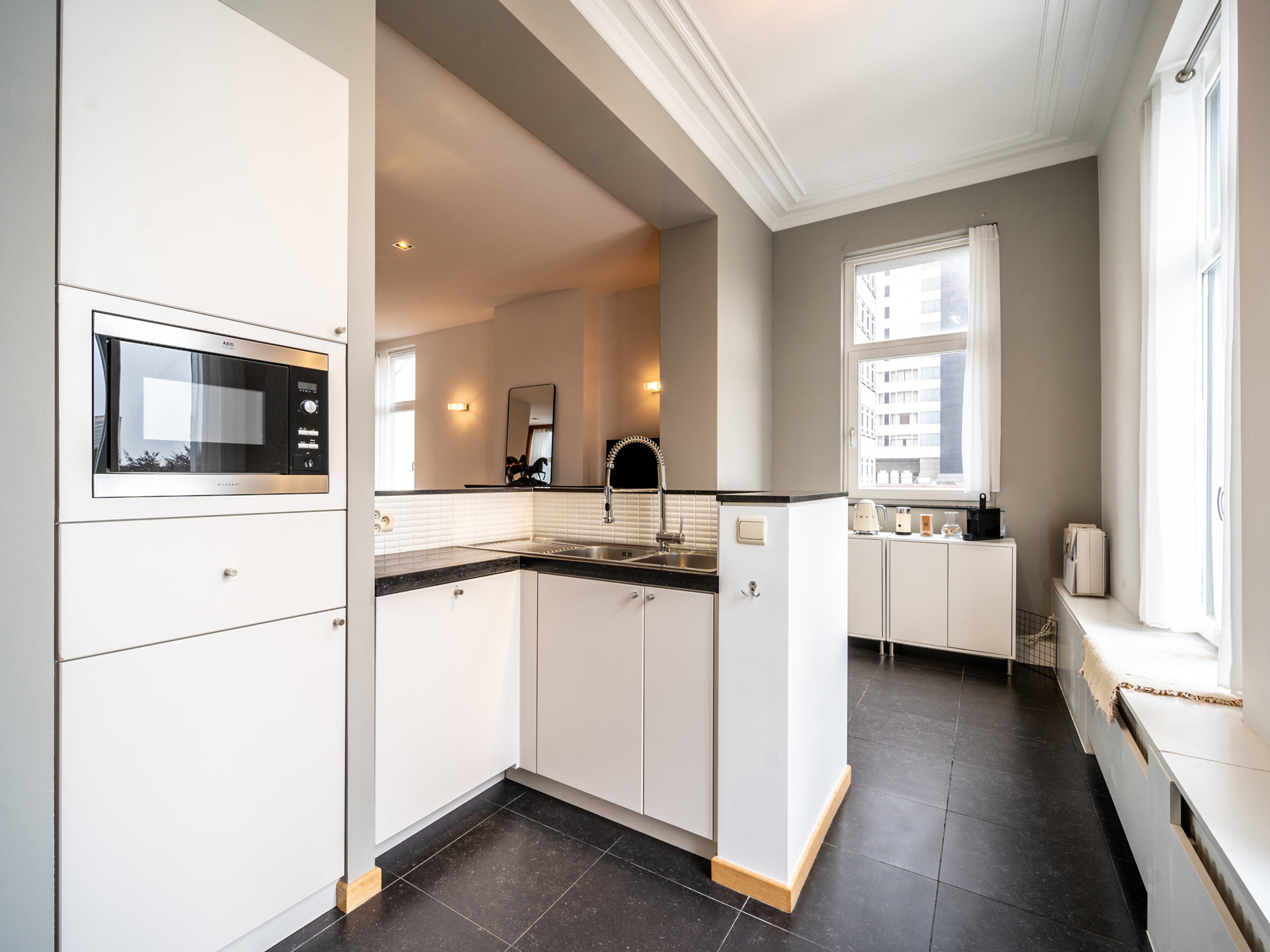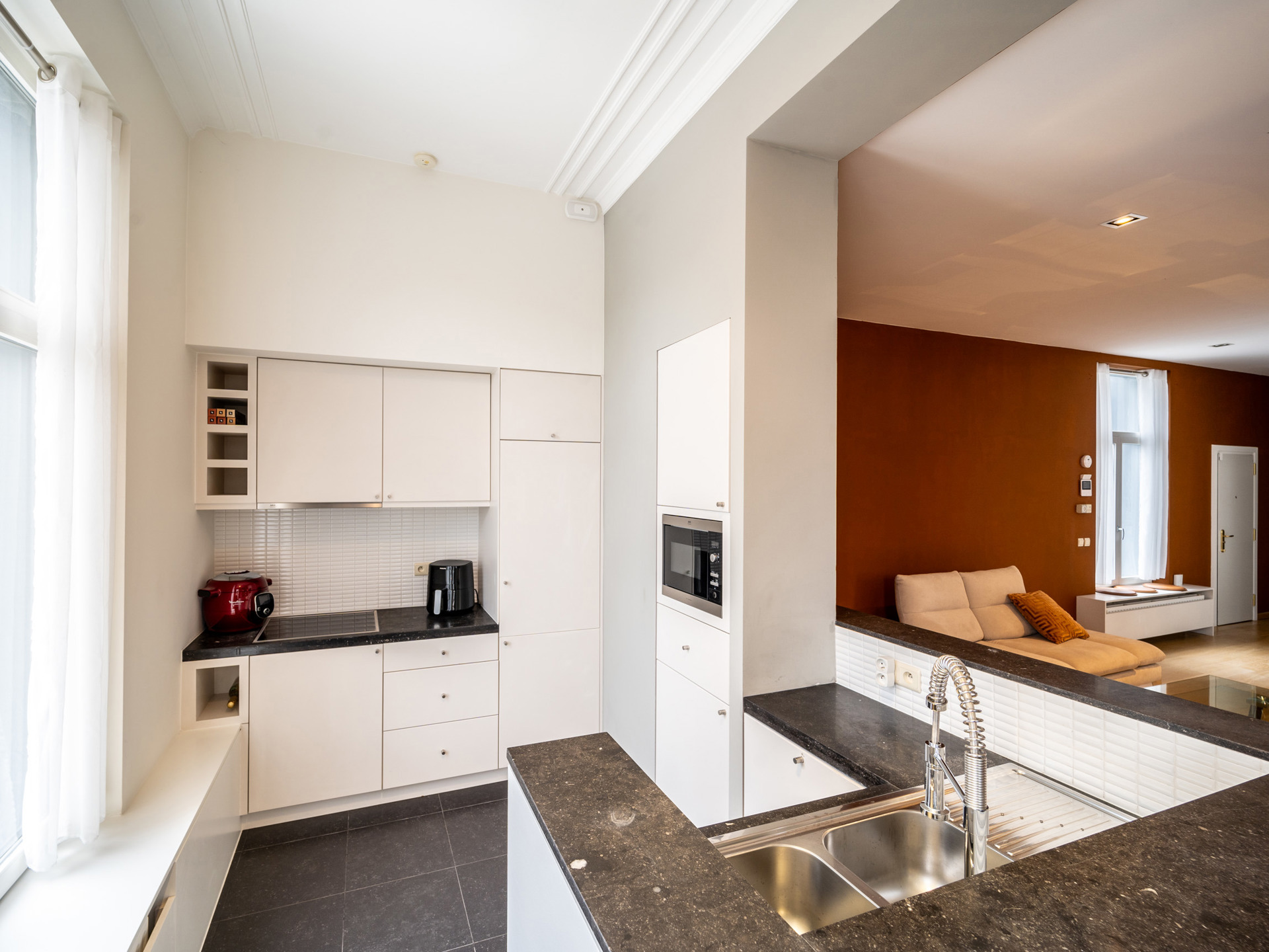 Located on the prestigious Boulevard de Waterloo, close to Avenue Louise and Egmont Park, two-bedroom apartment with a gross surface area according to PEB of ± 118 m². The apartment located on the second rear floor of a Neo-classical inspired mansion opens onto an entrance hall with cloakroom and guest toilet and leads to the living space offering beautiful high ceilings and extended by a fully equipped open kitchen offering an unobstructed view of Egmont Park. On the night side, the master bedroom with built-in wardrobes and full bathroom, a second bedroom and a laundry area. Others: Armored door, alarm system, equipped laundry room, individual heating, new boiler, common charges 200 EUR, PEB: G (provisional PEB) The Boulevard de Waterloo is known for its big brand stores. A stone's throw from cinemas, restaurants and public transport, it is ideally located between the city center and Avenue Louise. For further information, please contact Laurence Ballaux on +32 (0) 2 640 08 01.