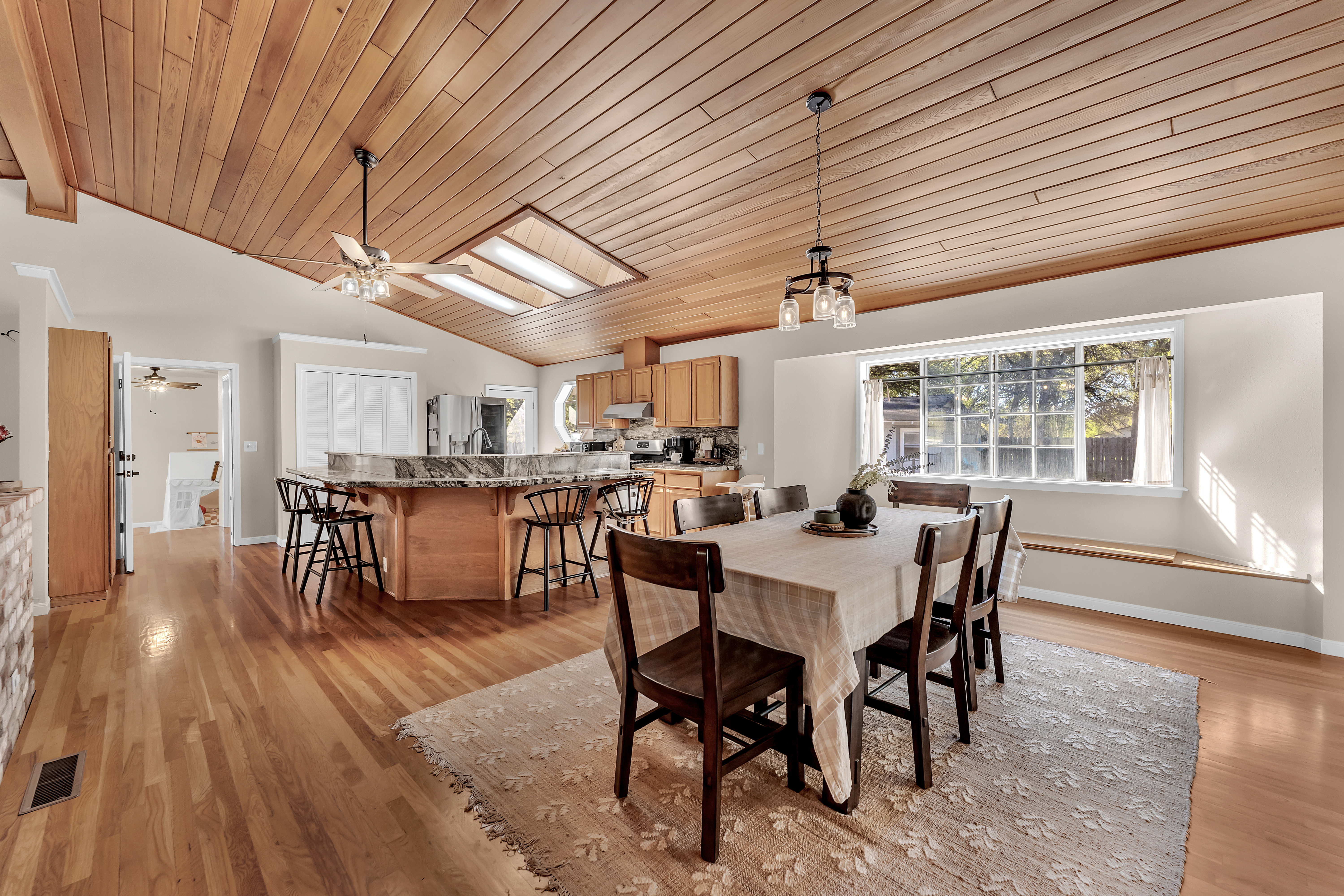 Spanning 3,128 sq ft, the home features a light-filled open-concept floor plan with high ceilings, designed for comfortable everyday living and effortless entertaining. The kitchen is equipped with granite countertops, newer stainless steel appliances, and ample prep space, flowing seamlessly into the spacious living and dining areas. Interior finishes include a blend of hardwood flooring, tile, and new carpeting, creating a warm and inviting atmosphere.