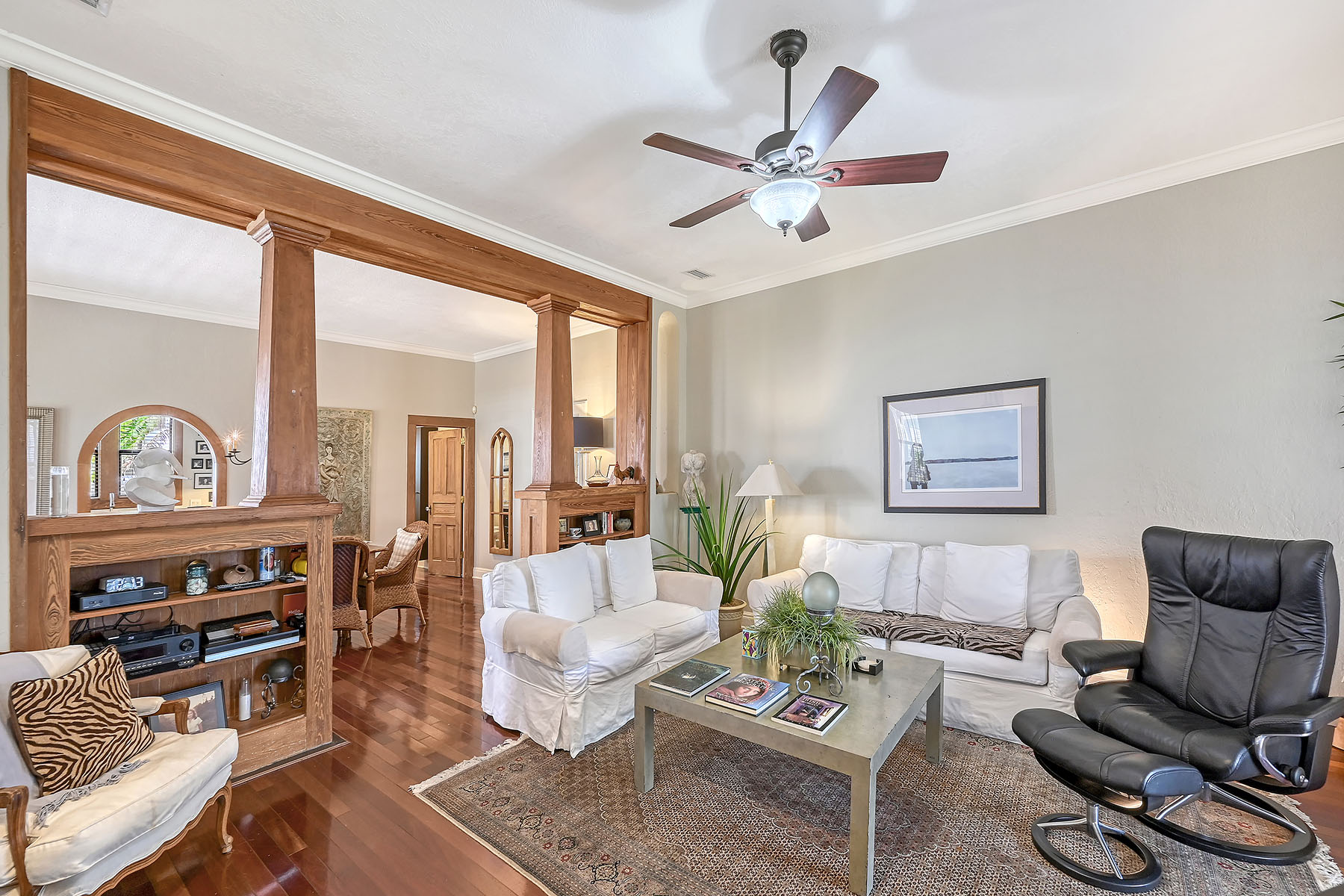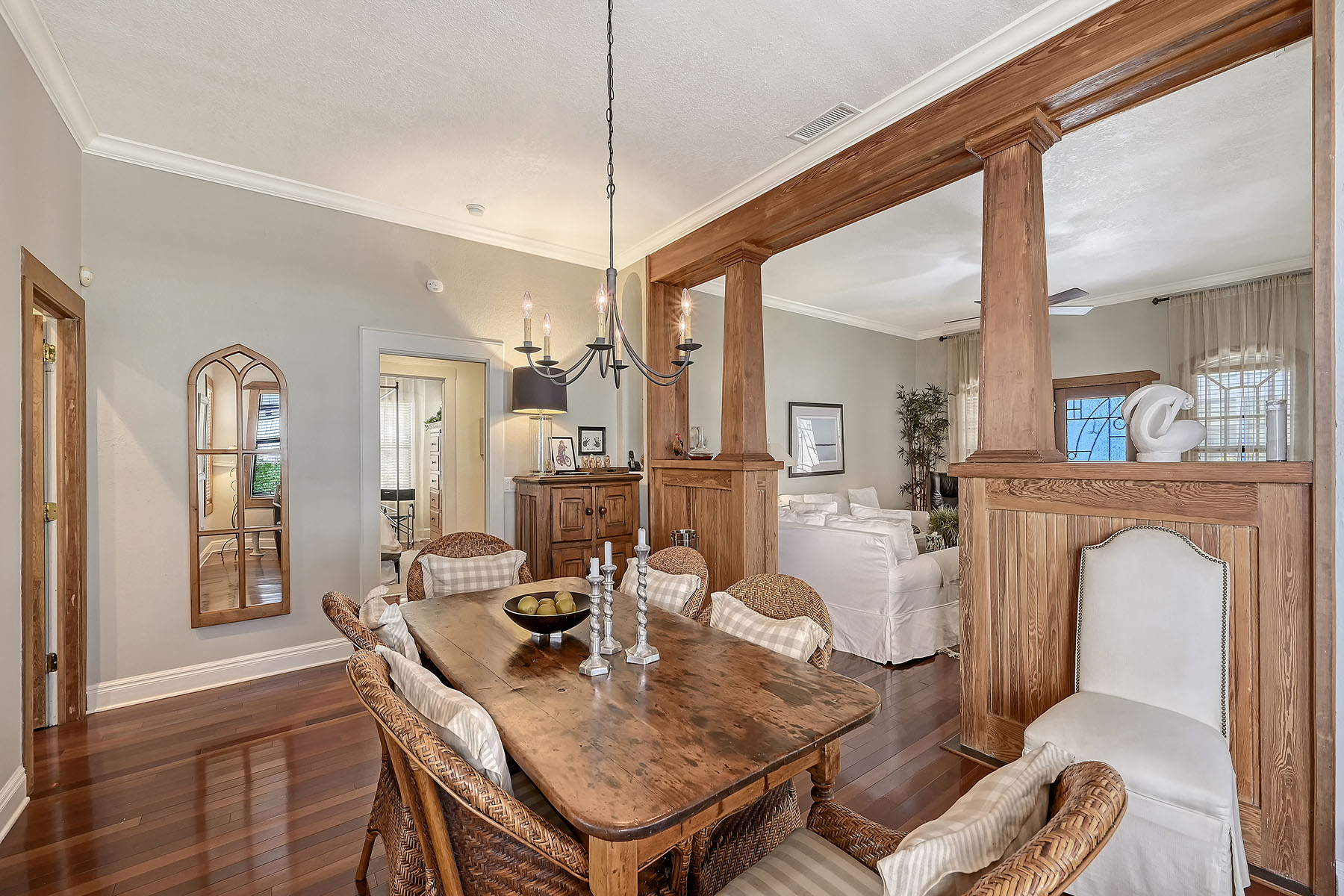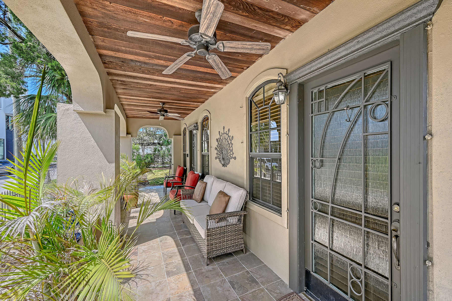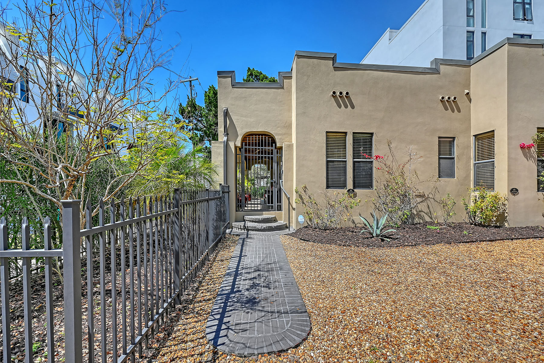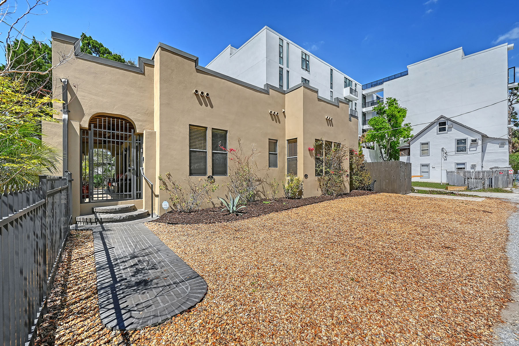 A rare opportunity to own a single-family residence in Sarasota's sought-after Rosemary District. Set on a beautifully landscaped property, this home features a towering century-old oak tree that anchors the backyard and creates a distinctive outdoor setting rarely found in downtown locations. Spanish and Mediterranean architectural elements introduce the residence, offering classic Old World character paired with solid construction and an elevation of approximately 25 feet above sea level. The property is in Flood Zone X, where flood insurance is not required. Inside, the home features high ceilings, hardwood flooring and extensive crown molding throughout. A gas fireplace adds warmth and character to the living area during cooler winter evenings. Multiple windows allow natural light to flow throughout the interior spaces. The residence includes three bedrooms, with one configured as an office or study and featuring a separate exterior entrance, offering flexibility for work-from-home use or private guest access. Outdoor living spaces include a spacious garden area, an oversized patio and a pergola surrounded by mature landscaping, creating a private setting for dining and entertaining. In the heart of the Rosemary District, the home places residents within proximity to many culinary delights, Sarasota's cultural amenities, including galleries, theaters and live music venues. More than 65 restaurants, cafés and shops are within approximately a six-block radius. The Bay Park waterfront district, a 53-acre public park along Sarasota Bay, is just five blocks away. Payne Park, the Legacy Trail for recreation and biking, Sarasota Farmers Market and Whole Foods Market are all nearby. The John Ringling Bridge provides convenient access to St. Armands Circle and Lido Beach. The property is zoned DTE, which offers future redevelopment potential, subject to city approvals. Owners may choose to enjoy the residence as a private downtown home while maintaining long-term flexibility for future planning. Or alternatively, since this is DTE zoning, this is ideal property for a restaurant possibility, just something else to consider! A unique opportunity to experience downtown Sarasota living in one of the city's vibrant and evolving neighborhoods.
