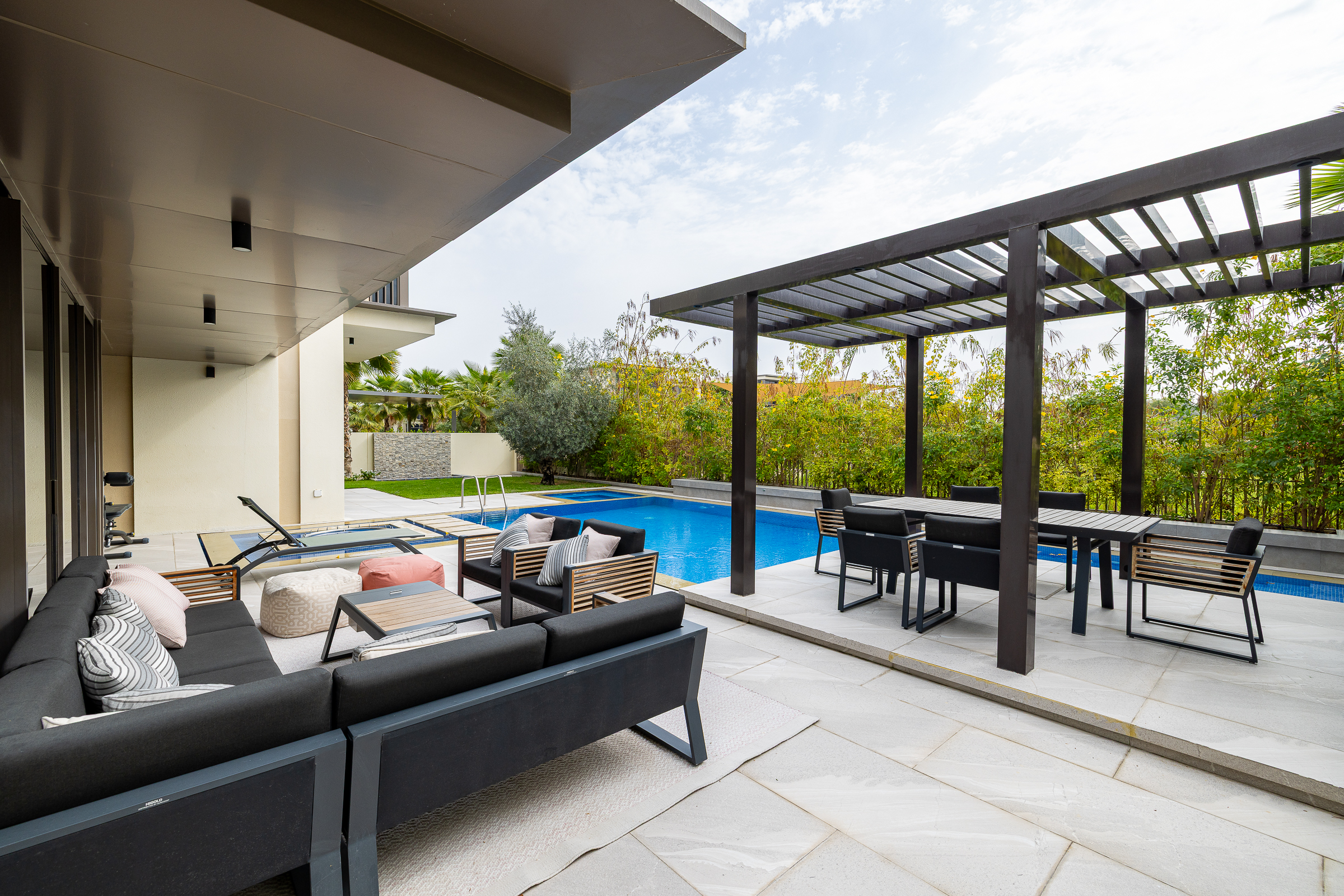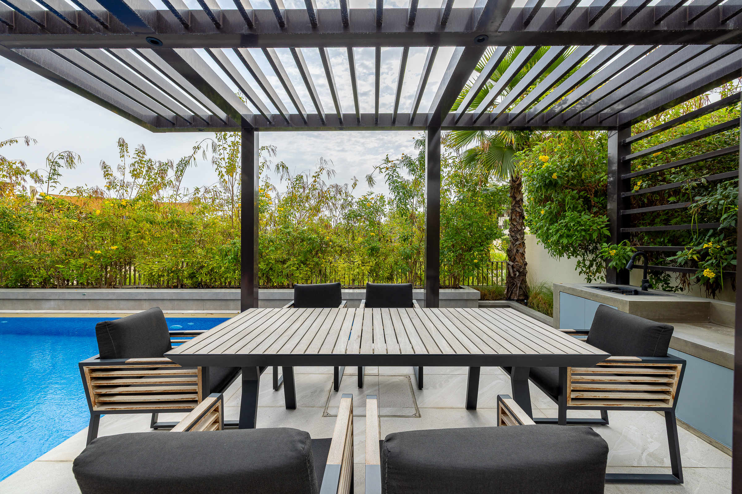 Tall, full-height windows seamlessly connect the indoors to the outdoors that house a large pool, Jacuzzi, a water feature, and a shaded pergola covering a dining area and summer kitchen — most ideal for sophisticated al fresco hosting. The double-extension in the courtyard is also rendered beautiful with meticulous landscaping that adds to the charm of the outdoors while offering privacy.
