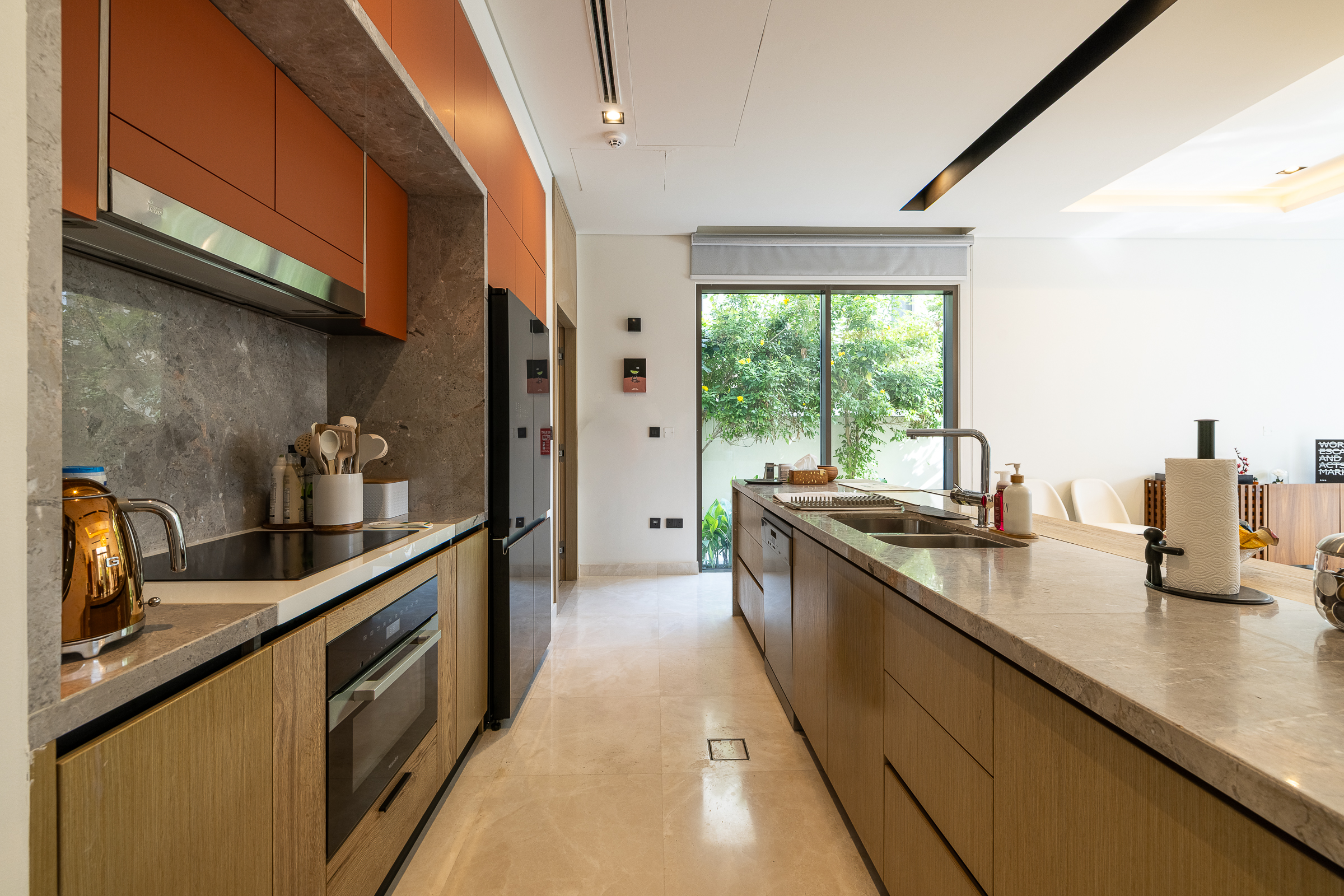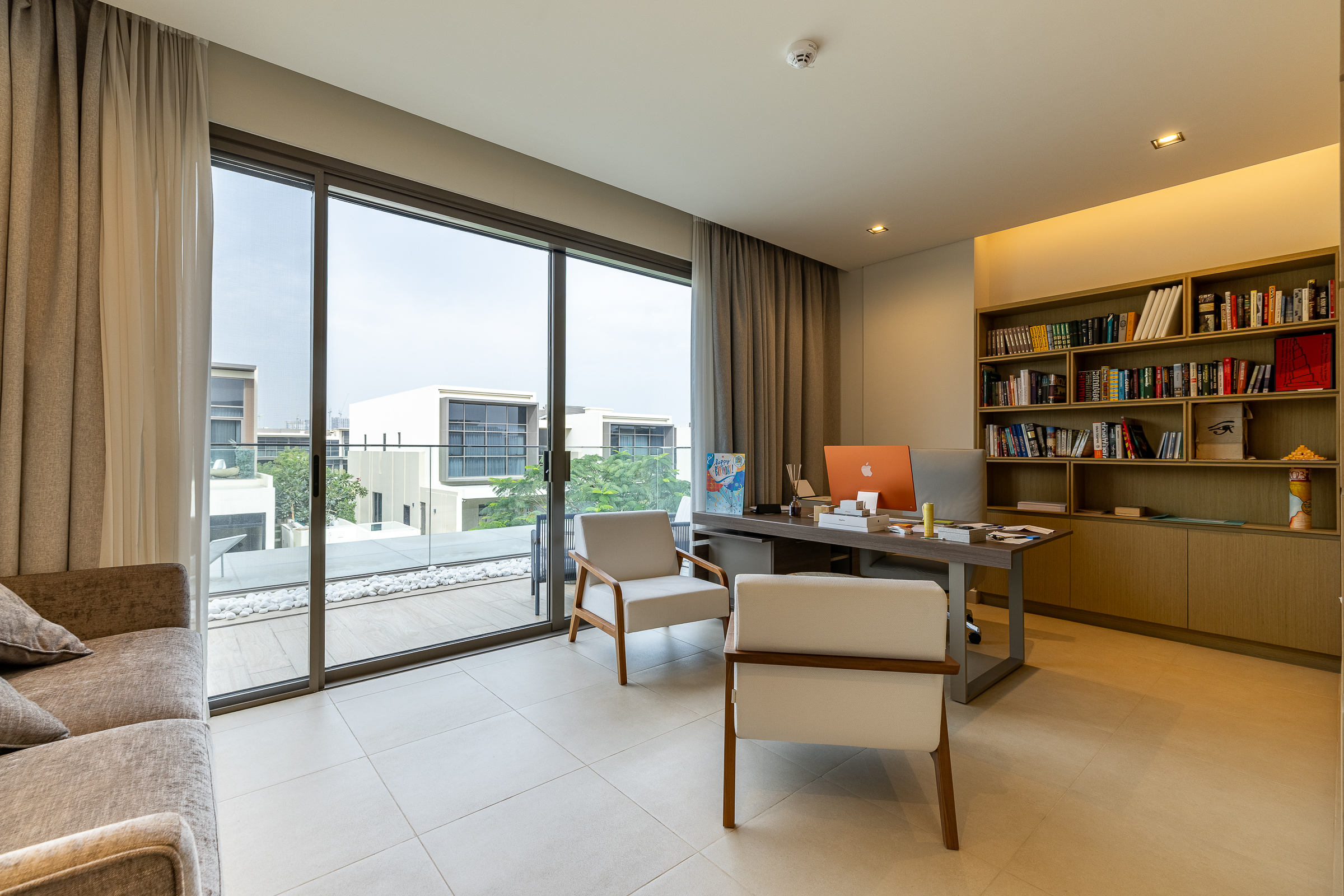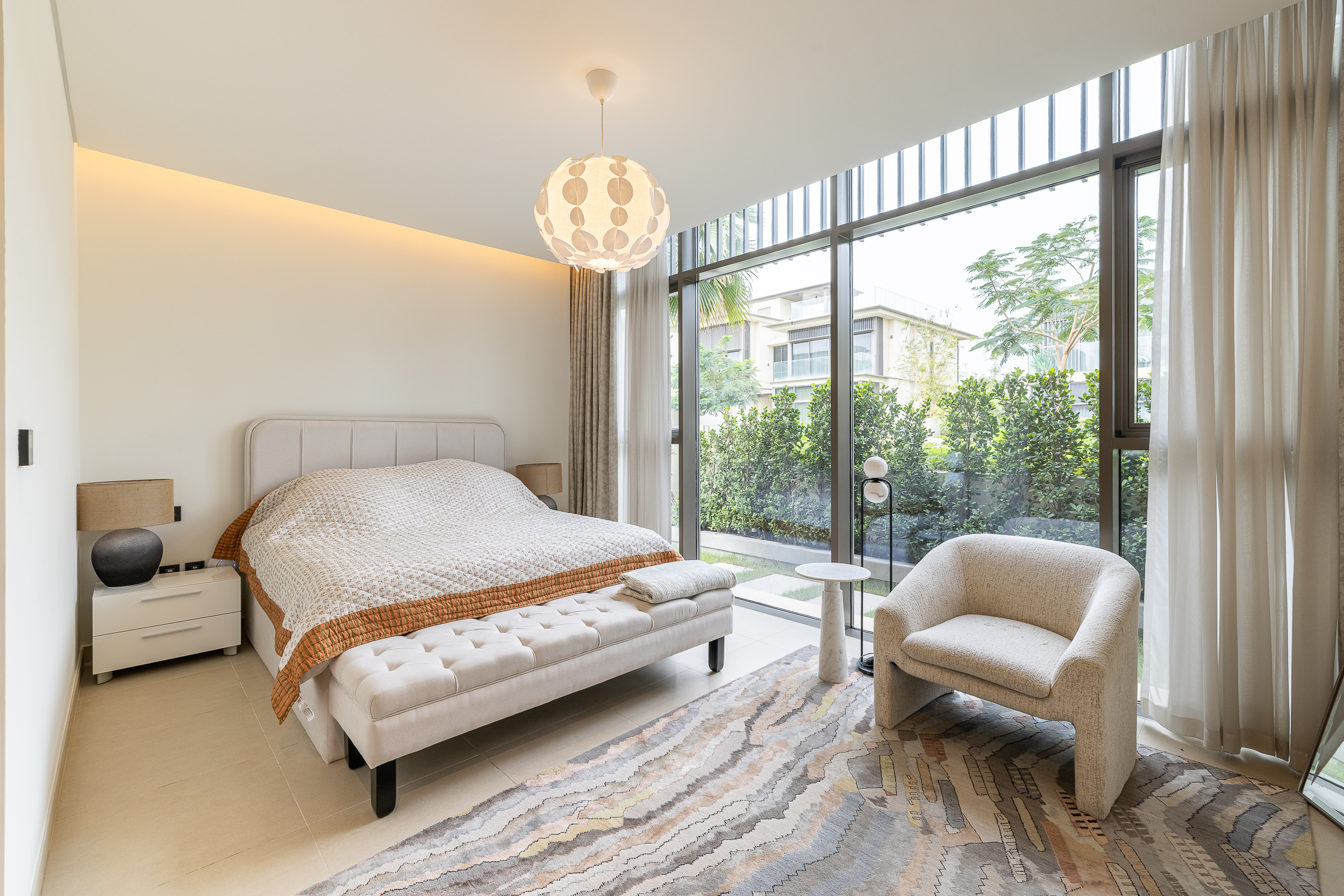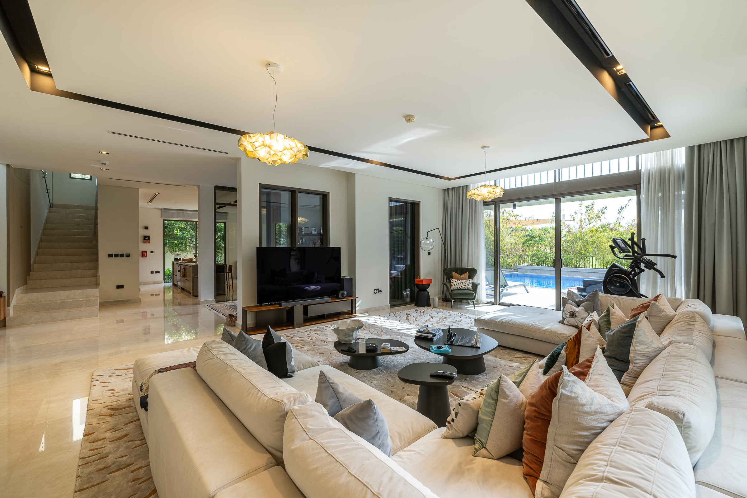 Occupying a highly coveted location in Golf Place within Dubai Hills Estate, this four-bedroom villa is spread across 7,469.94 sq.ft with an extended area. Its setting overlooking the Green Belt adds significantly to the property’s appeal. Splendid marblework, warm wooden finishes and understated hues adorn the interiors.