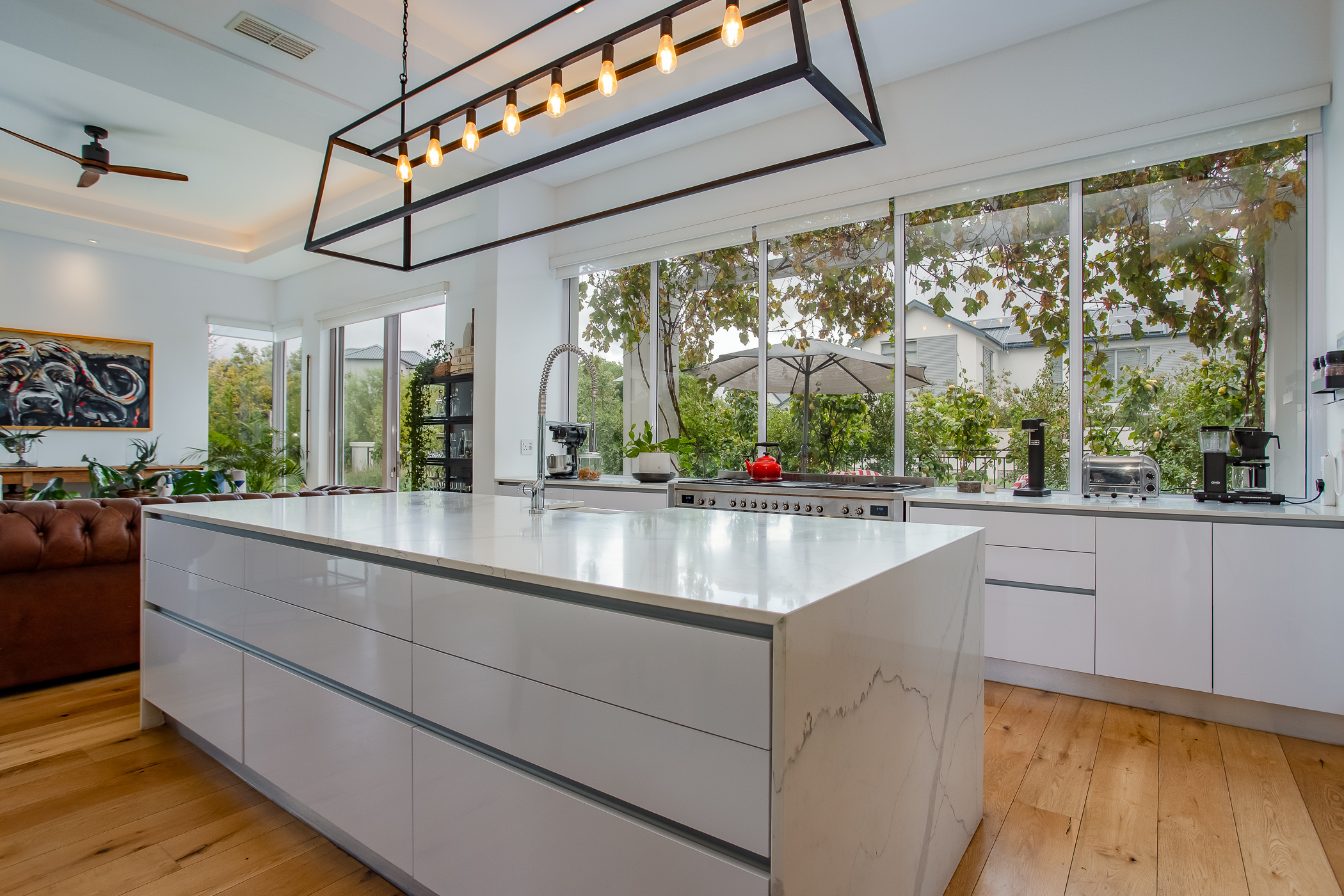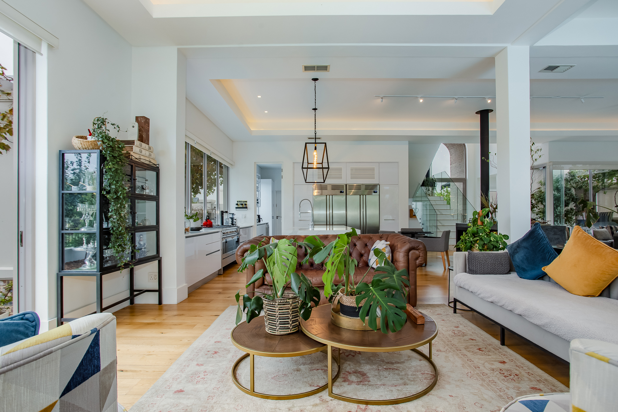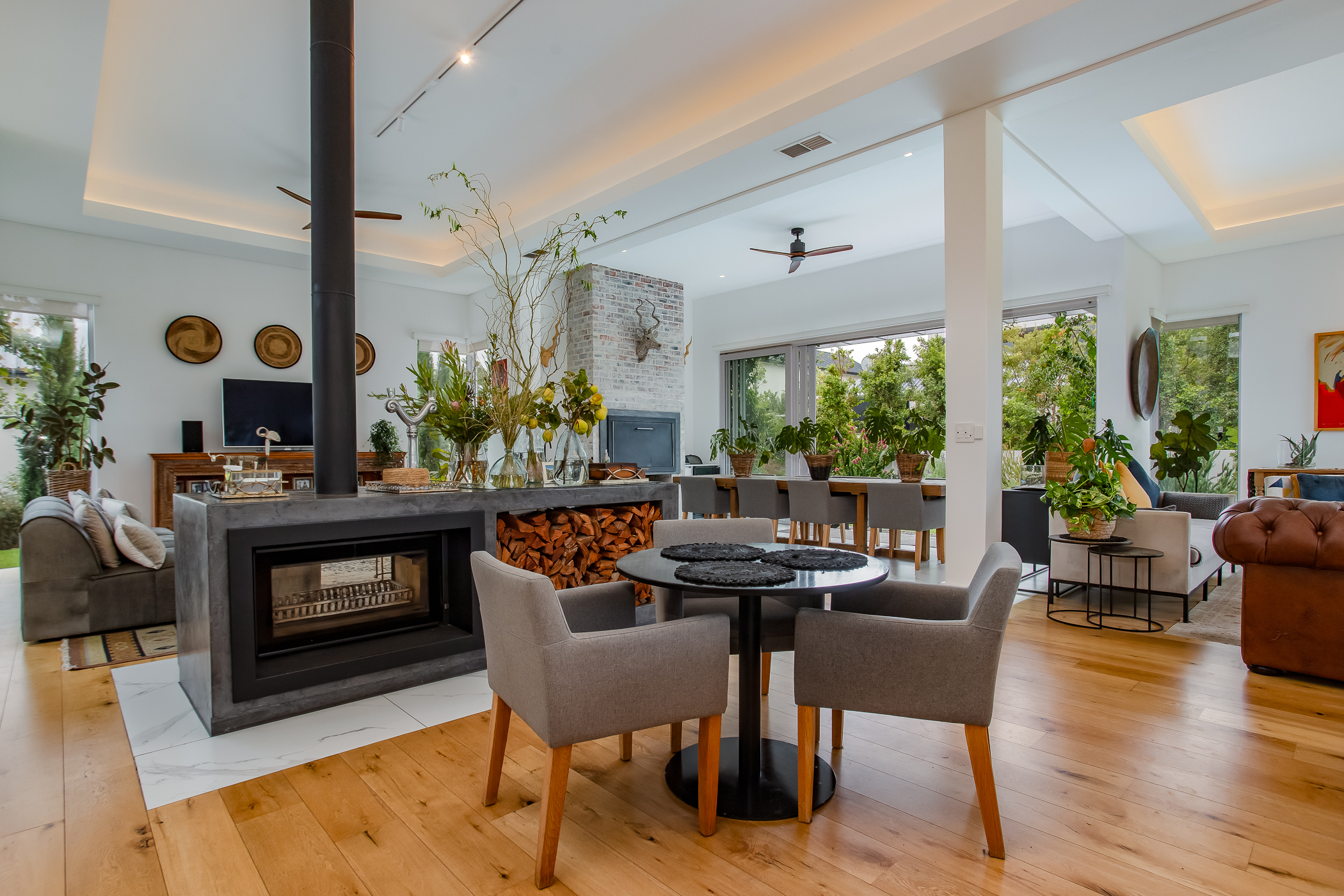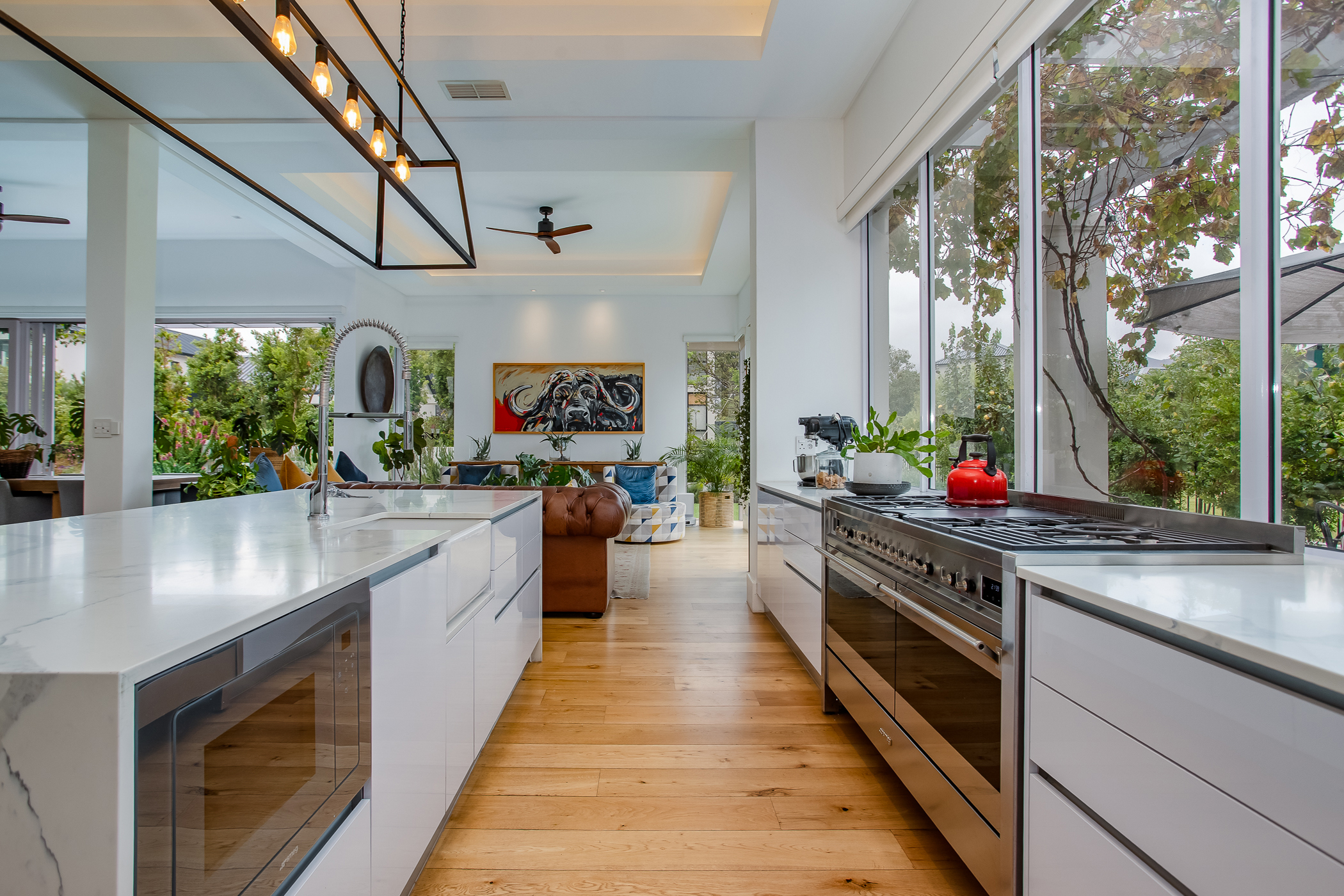 The heart of the home is a striking open-plan living area defined by high ceilings, abundant natural light and an exceptional sense of volume. Large windows frame the surrounding greenery, creating a seamless connection between interior spaces and the natural beauty of the estate. The gourmet kitchen is designed for both functionality and style, featuring a range cooker, integrated industrial fridge/freezer and a separate scullery, flowing effortlessly into the dining and lounge areas to create a welcoming space for entertaining and everyday living.